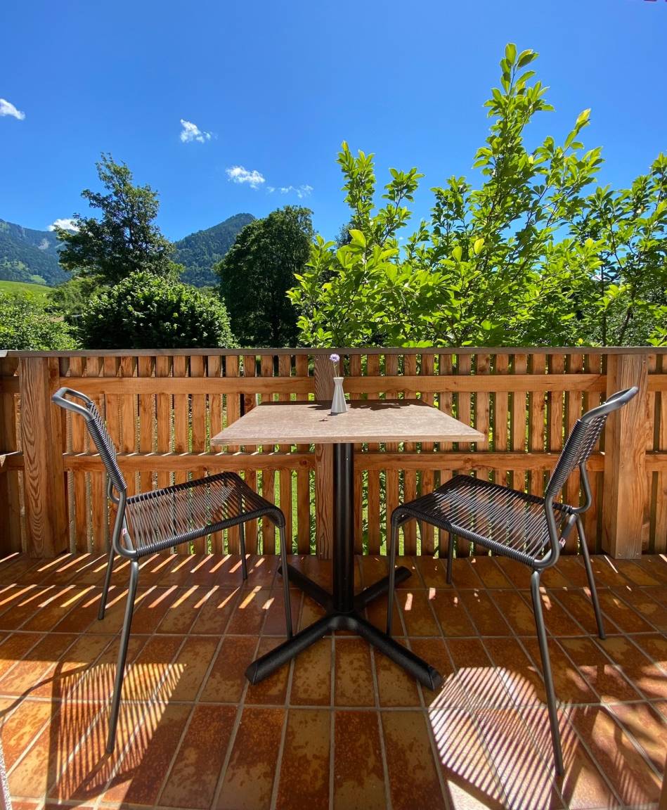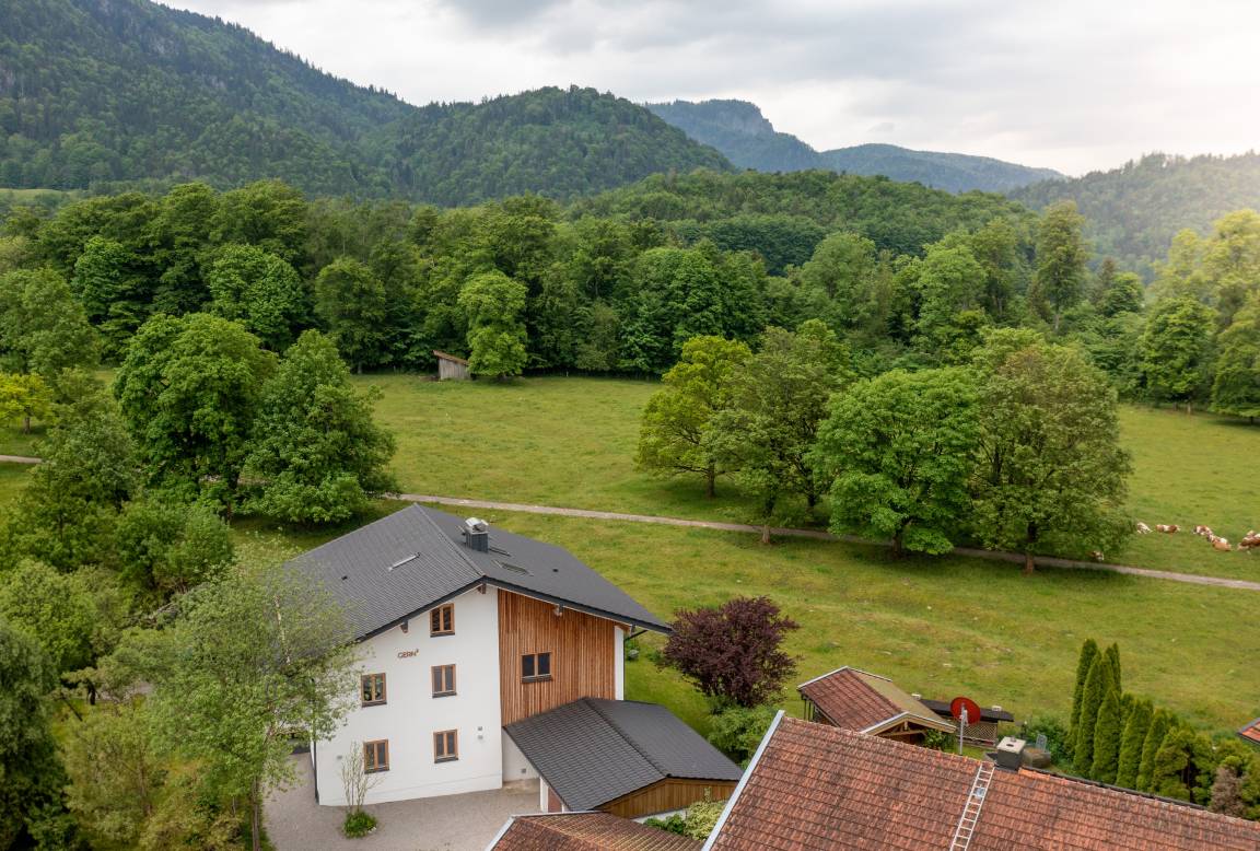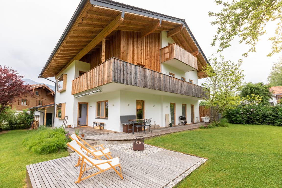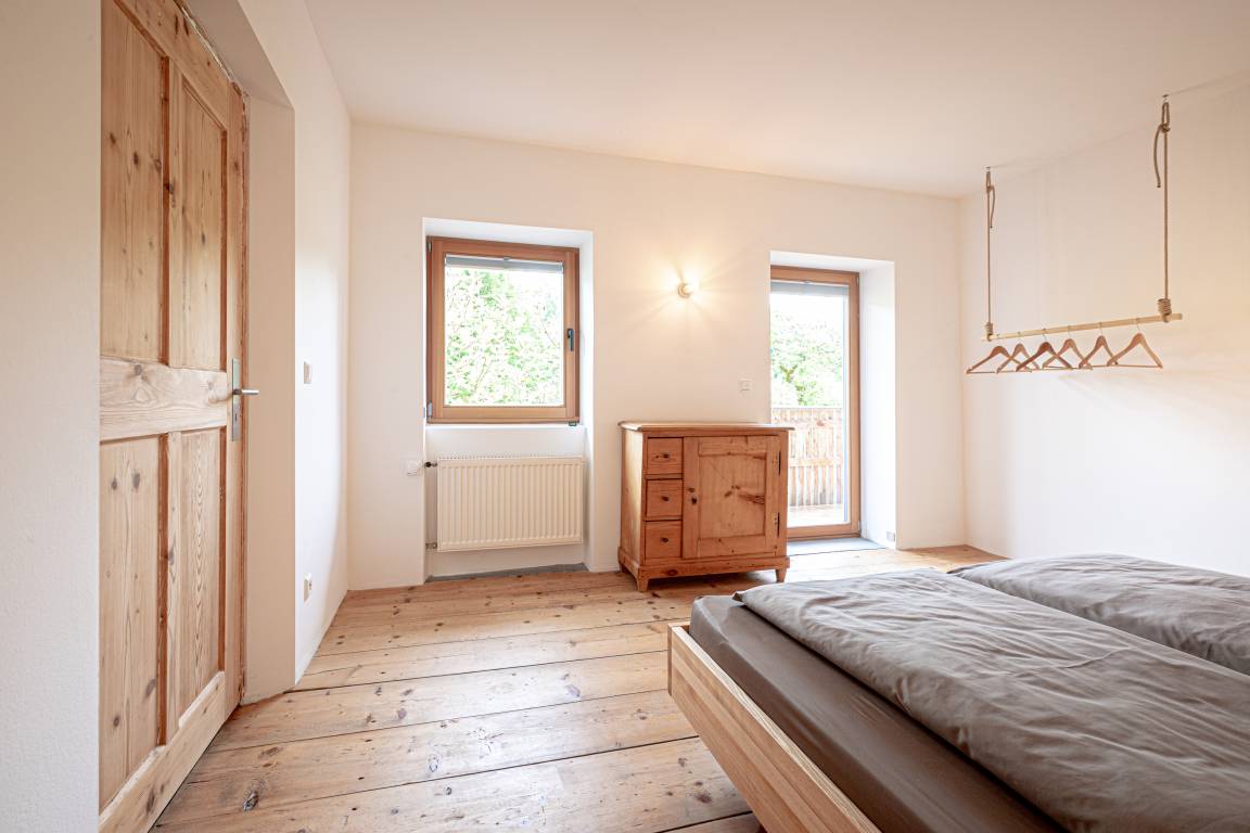 Vom Balkon aus genießen Sie im Frühjahr die prächtige Magnolienblüte sowie ganzjährig den freien Blick auf den Hochgern. Das ruhig zum Garten gelegene Schlafzimmer verfügt über direkten Zugang zum Balkon und grenzt an ein großzügiges Bad mit Regendusche.