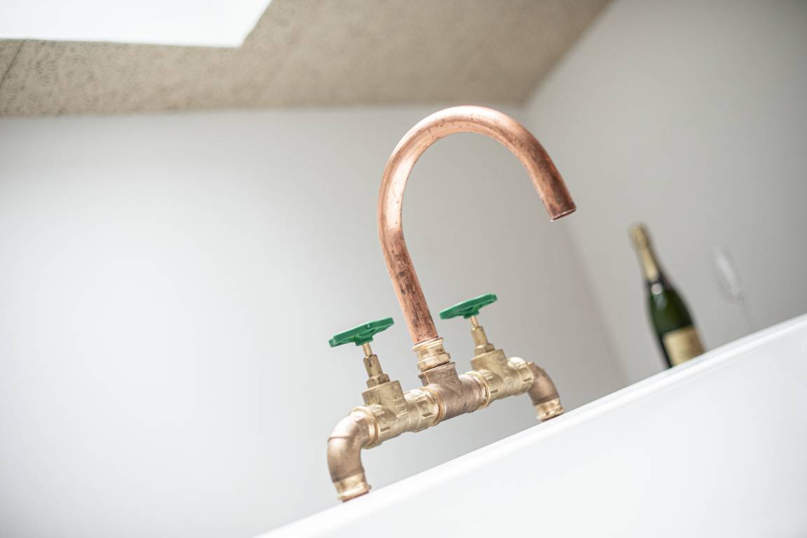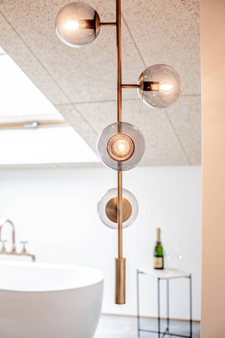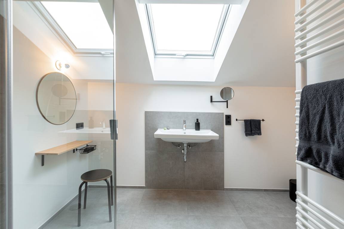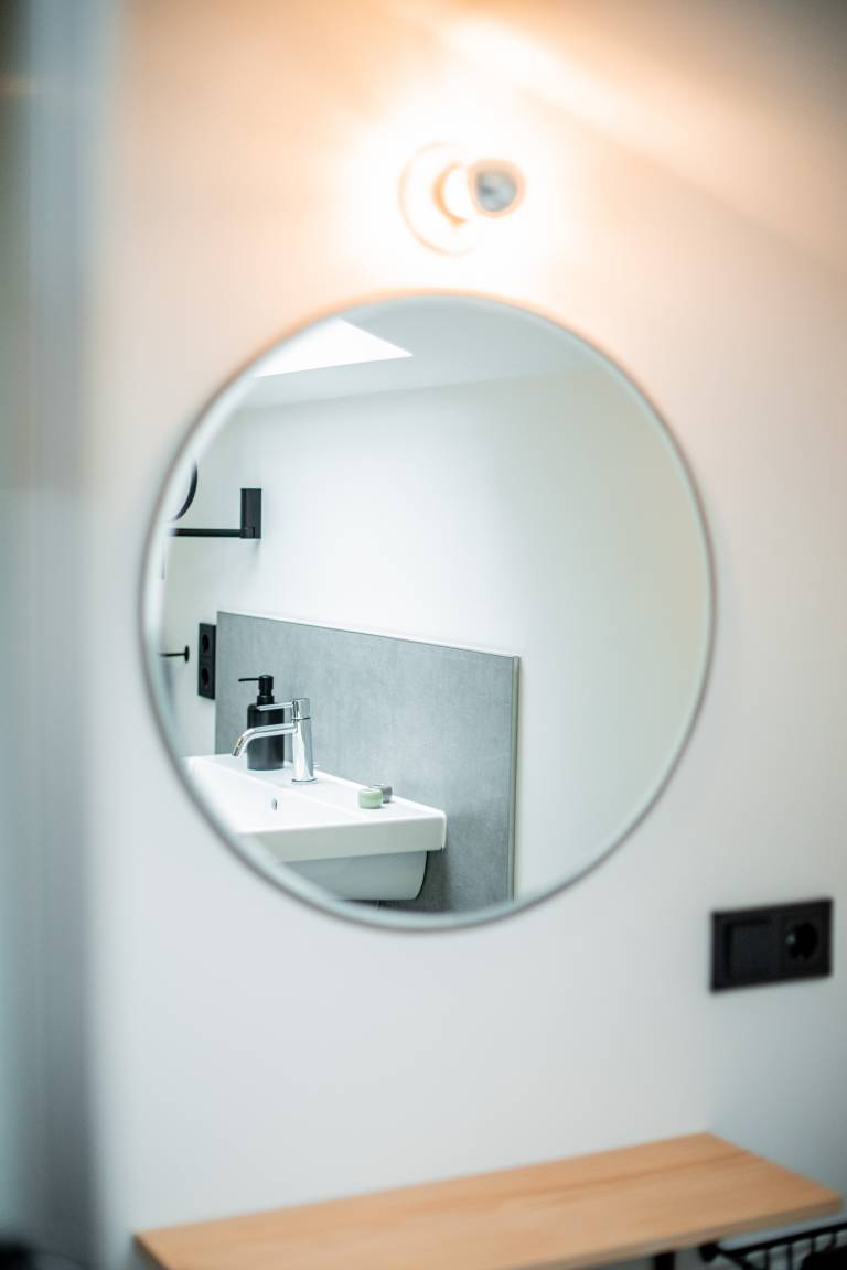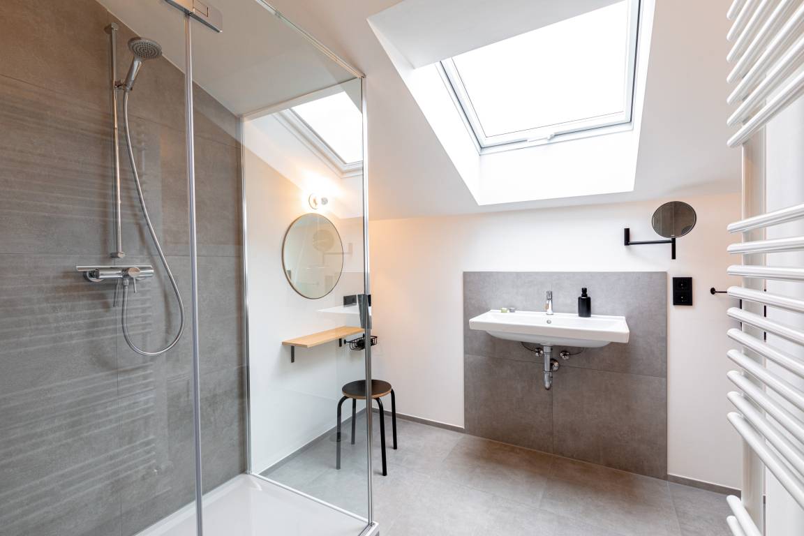 Das Schlafzimmer ist mit einem komfortablen Doppelbett (1,60 x 2,00 m) ausgestattet und überrascht mit einer freistehenden Badewanne für entspannte Momente. Das angrenzende Badezimmer verfügt über eine großzügige Regendusche, einen Schminktisch und WC.
