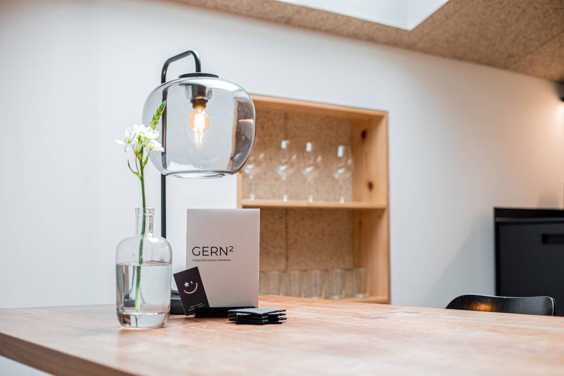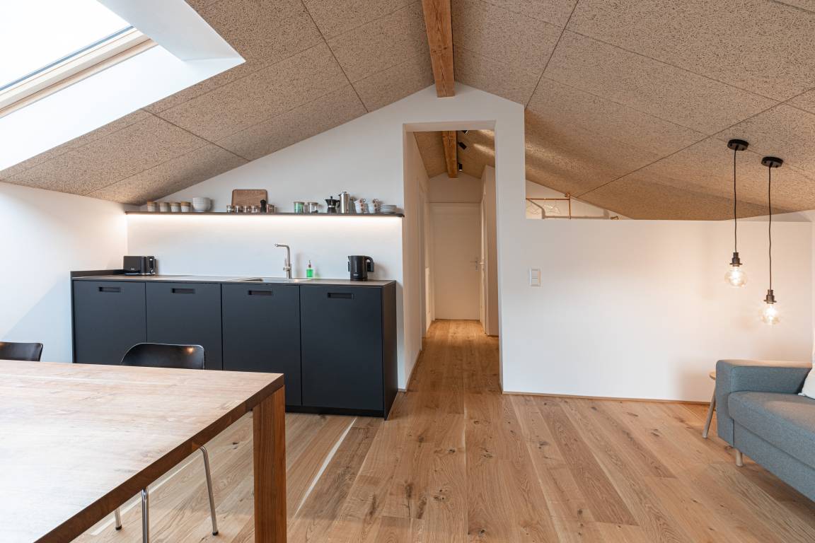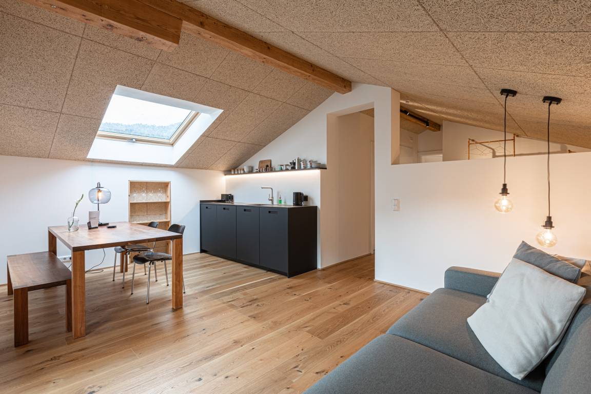 Die Wohnung "Weitblick" im 2. Obergeschoss besticht durch lichtdurchflutete Räume und einen unvergleichlichen Ausblick auf das Bergpanorama, insbesondere die Hochplatte. Auf 70 m² bietet sie Platz für bis zu vier Personen – ideal für Paare oder Familie.