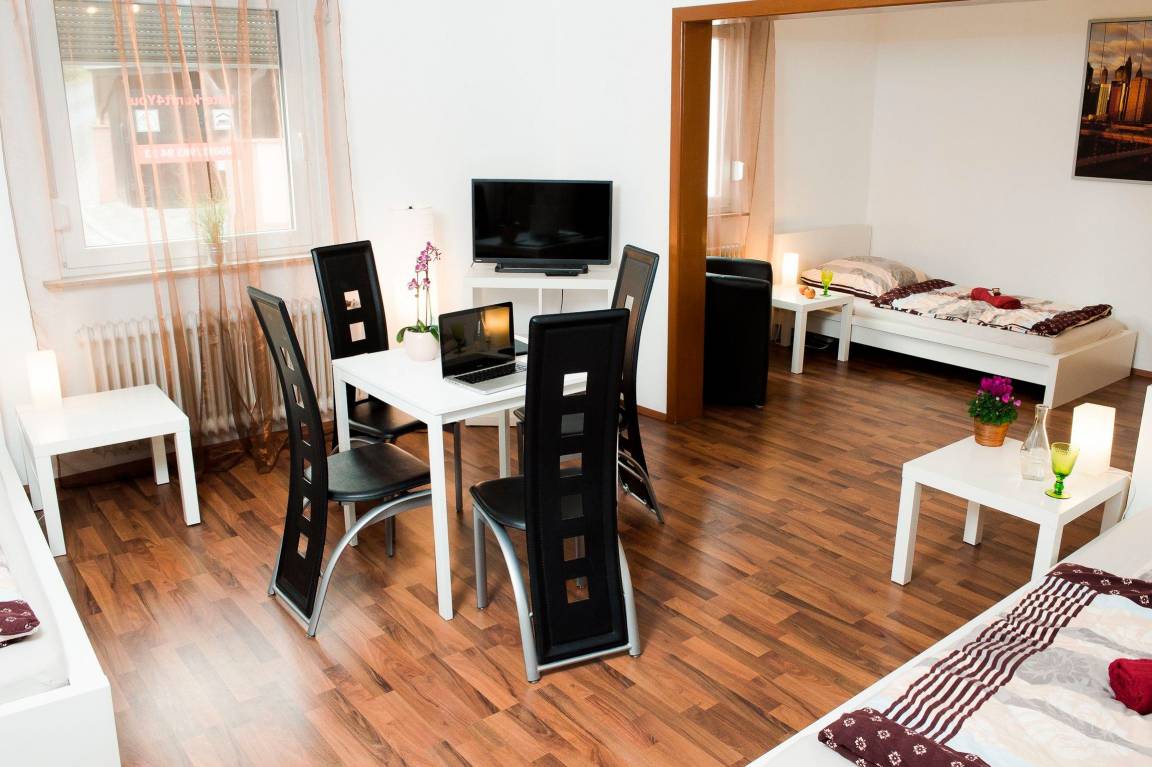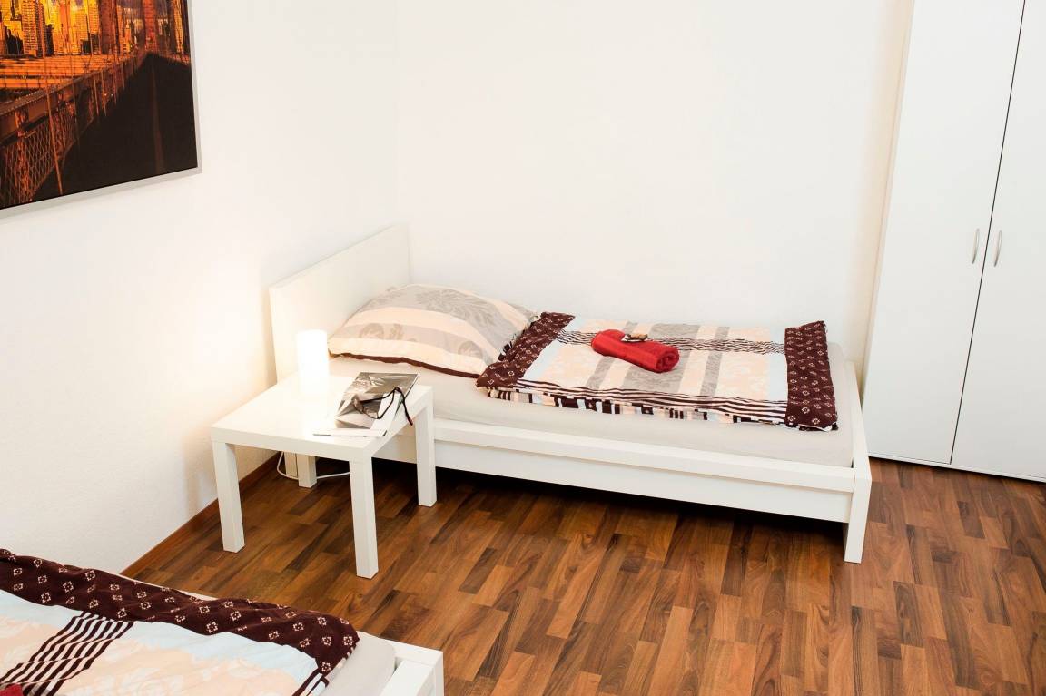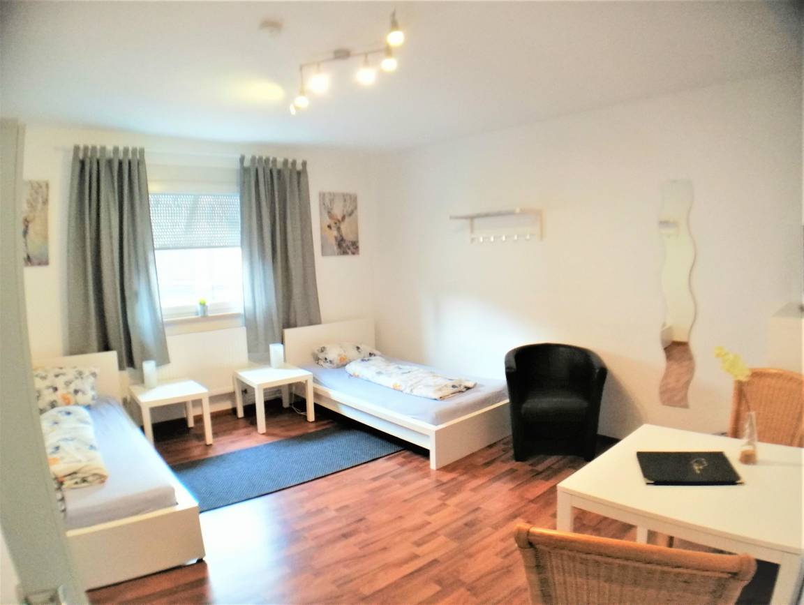 Ausstattung: Schrank, Tisch und Stühle, Ganzkörperspiegel, Nachttischlampen, Nachttisch und Verdunklungsmöglichkeiten.