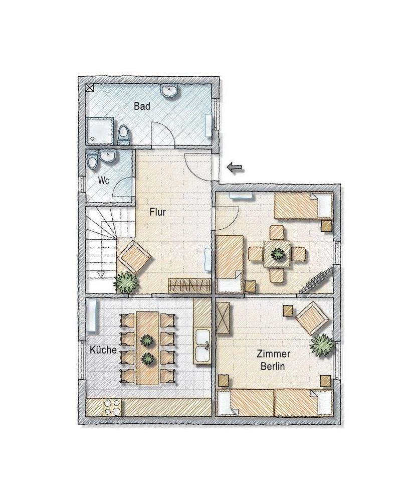 Behindertengerechter Stufenloser Eingang sowie das gesamte Erdgeschoss.
