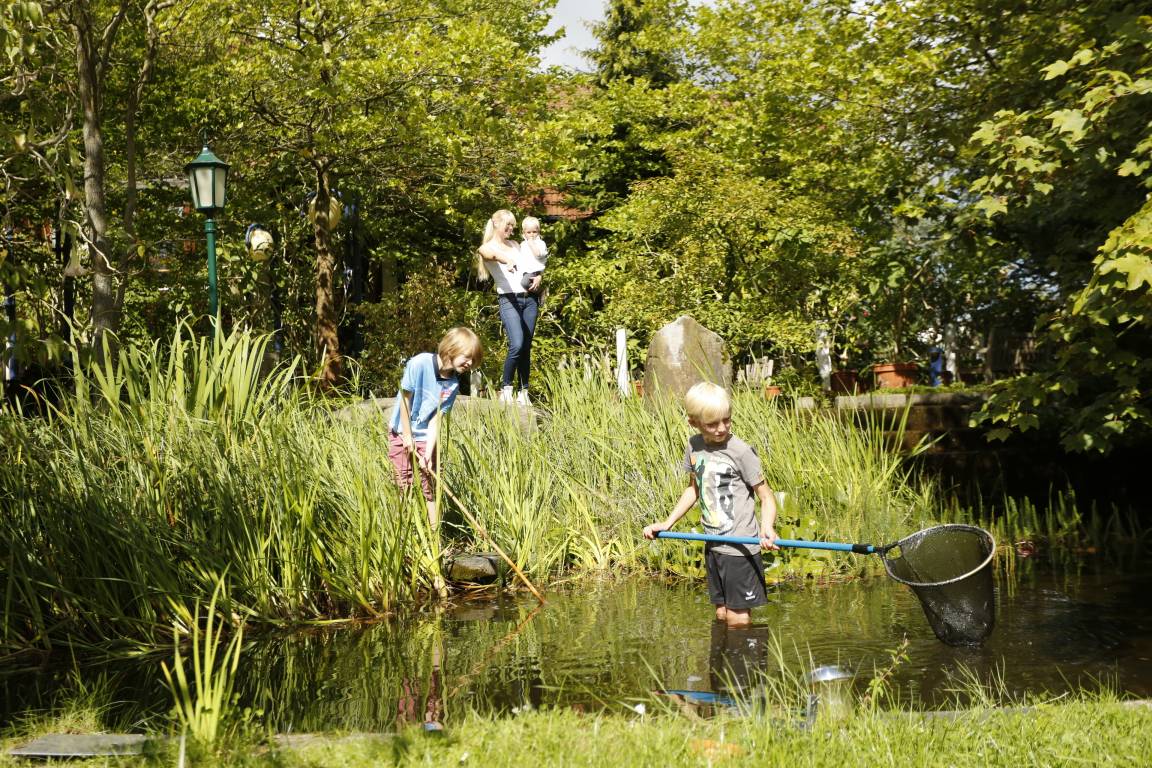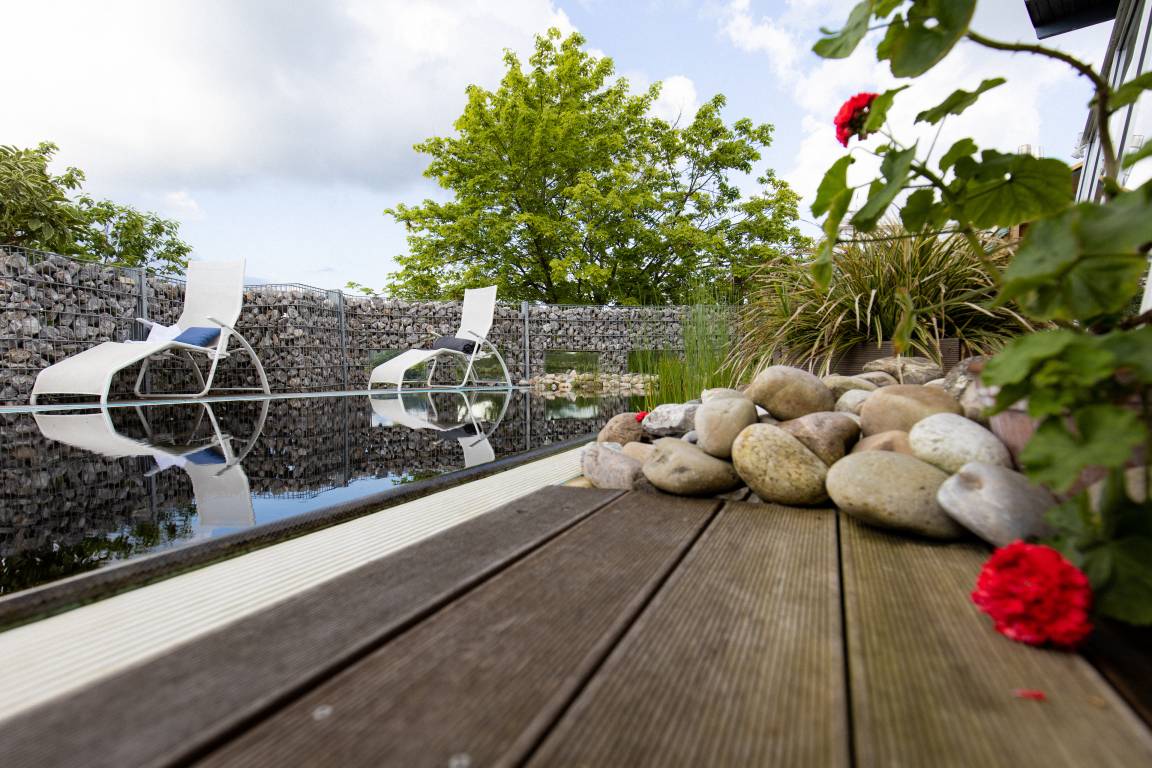 Aber ganz besonders und das zu jeder Jahreszeit ist unsere Gartenanlage. Im Winter können Sie beim prasselnden Kaminfeuer auf die eisige Landschaft hinausschauen. Im Frühling sprießen überall die Frühlingsblumen und man kann die verrückten Vögel und Häschen im Garten beobachten. Im Sommer fühlen sie sich dank der vielen mediterranen und exotischen Kübelpflanzen wie in einem Paradiesgarten und ab dem Spätsommer gibt es überall im Garten Beeren und Früchte zu naschen.