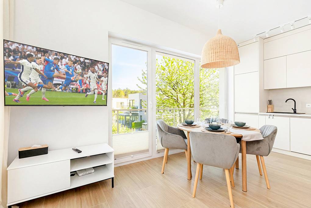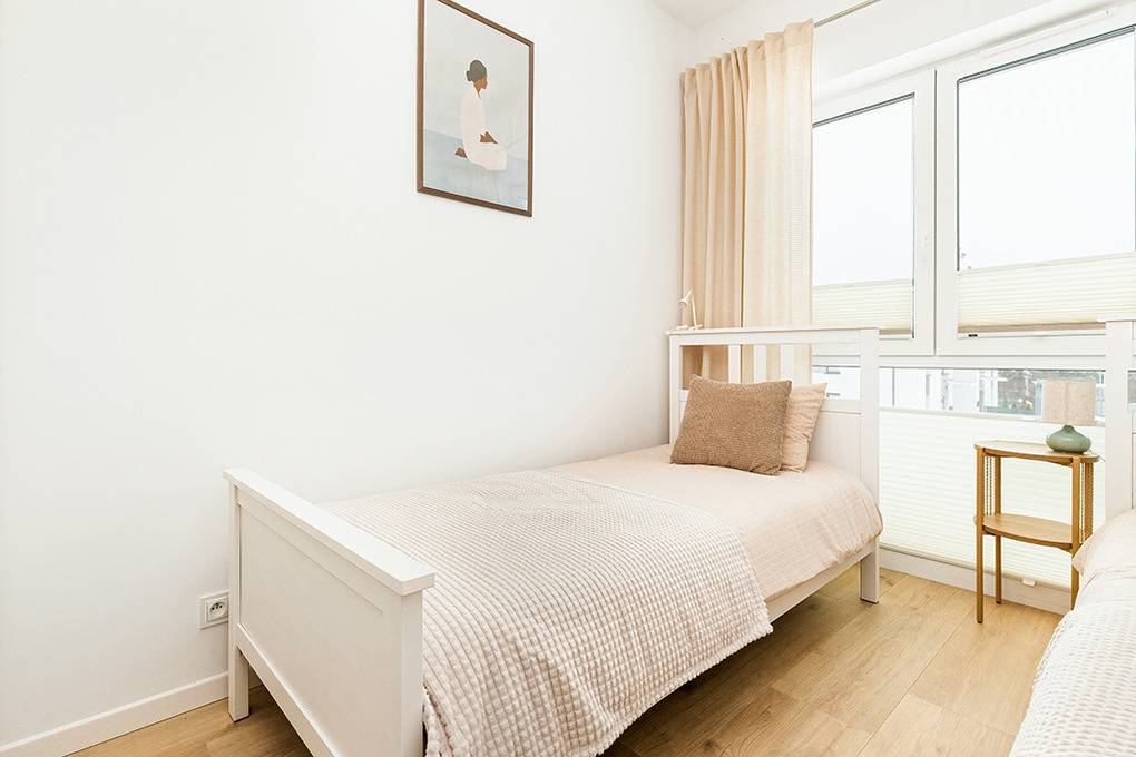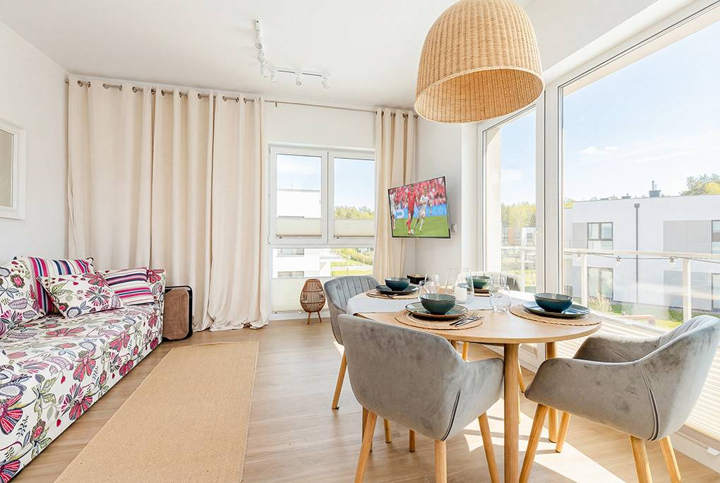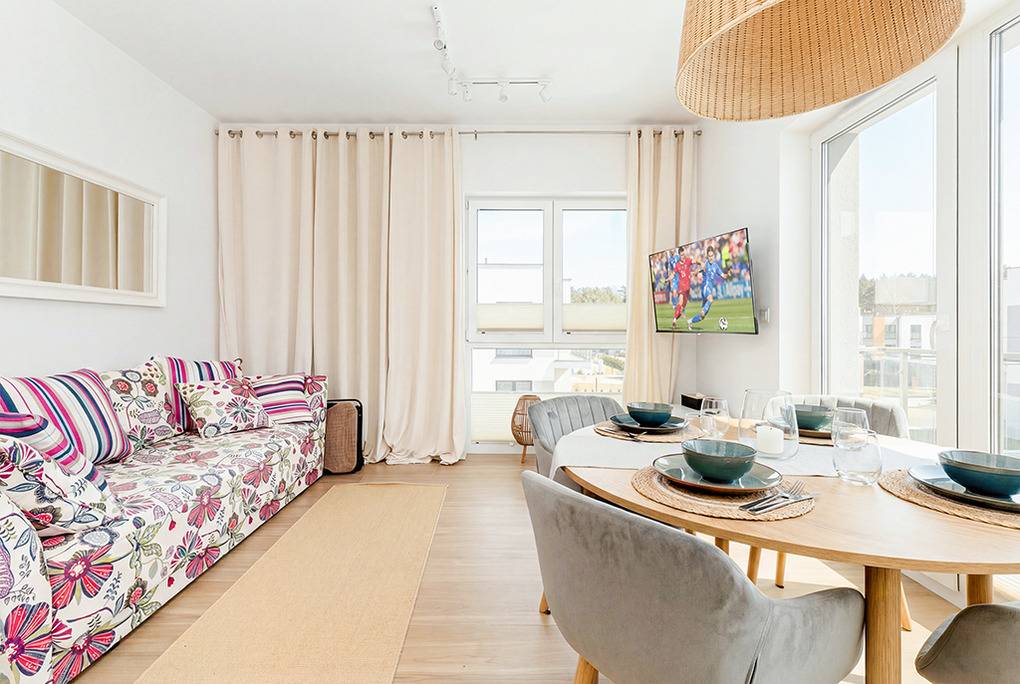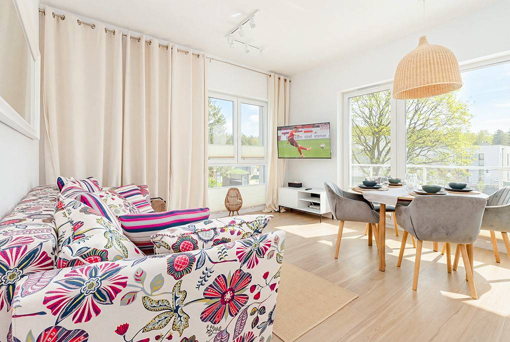 PL 85.20 Wohnung 2-6 Pers.: Sehr geschmackvoll und hochwertig eingerichtete 3-Zimmerwohnung mit 60 qm Wohnfläche, 1. Etage. Wohn-/Essraum mit großer Couchgarnitur (Ausziehsofa 2 Pers.), bodentiefe Fenster, Flachbild Smart-TV, Internet (WLAN), Esstisch, sehr gut ausgestatteter, moderner Küchenzeile (4 Pl. Induktionsherd, Abzugshaube, Backofen, Spülmaschine, Gefrierschrank (70 l.). Doppelzimmer. Zweibettzimmer. Bad: Du, Wb, WC, Waschmaschine. Balkon mit Sitzmöbeln, Blick auf den darunterliegenden Garten.