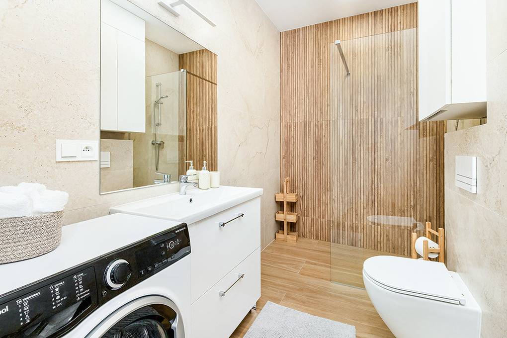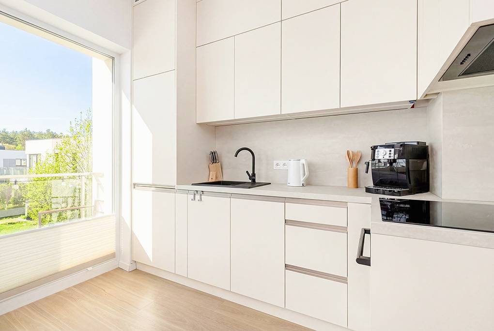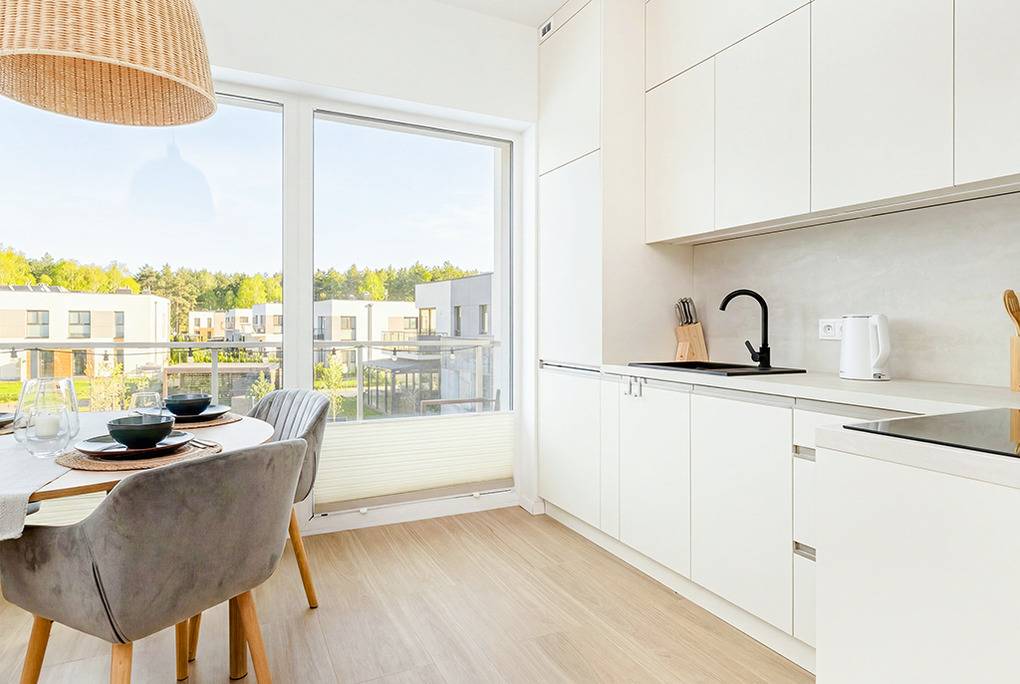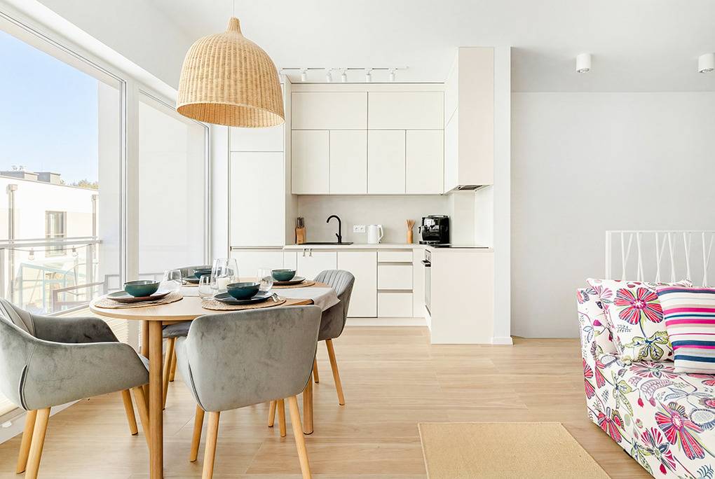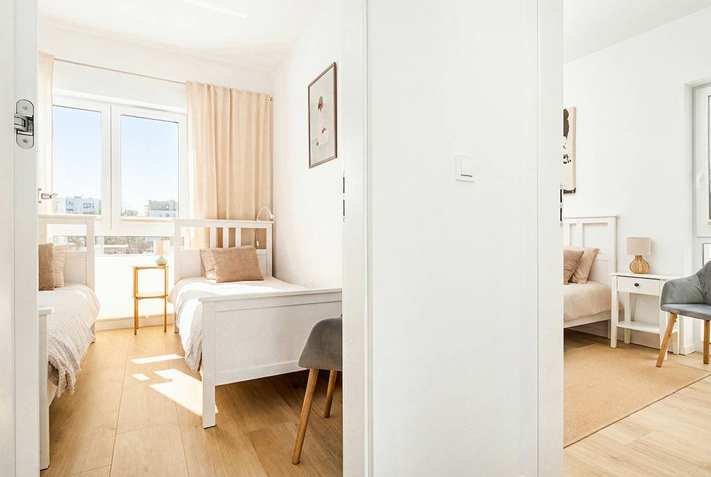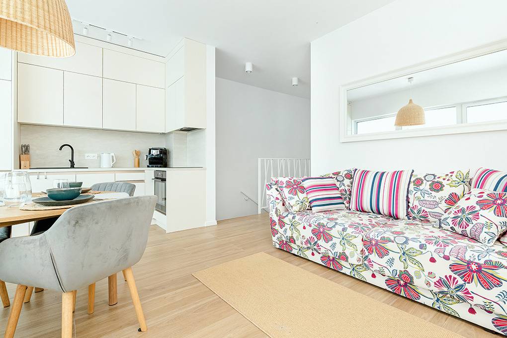 PL 85.20 Wohnung 2-6 Pers.: Sehr geschmackvoll und hochwertig eingerichtete 3-Zimmerwohnung mit 60 qm Wohnfläche, 1. Etage. Wohn-/Essraum mit großer Couchgarnitur (Ausziehsofa 2 Pers.), bodentiefe Fenster, Flachbild Smart-TV, Internet (WLAN), Esstisch, sehr gut ausgestatteter, moderner Küchenzeile (4 Pl. Induktionsherd, Abzugshaube, Backofen, Spülmaschine, Gefrierschrank (70 l.). Doppelzimmer. Zweibettzimmer. Bad: Du, Wb, WC, Waschmaschine. Balkon mit Sitzmöbeln, Blick auf den darunterliegenden Garten.