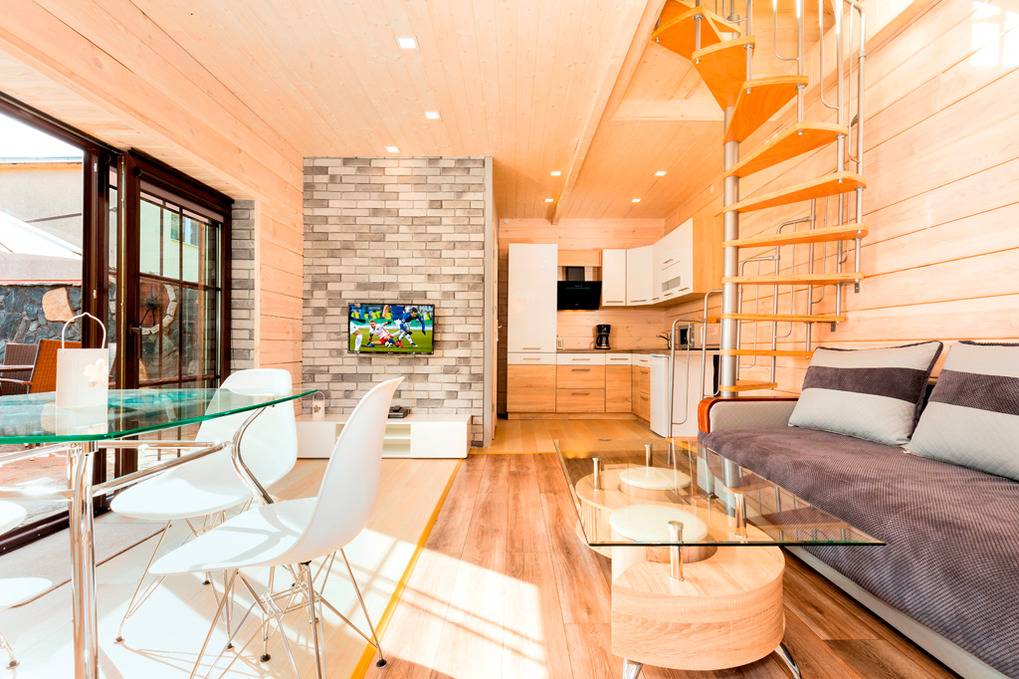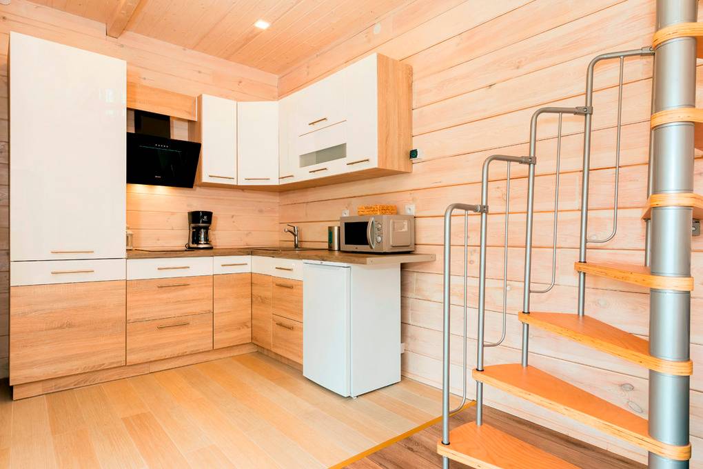 PL 50.4 Ferienhaus 2-4 Pers.: Sehr schönes 3-Zimmer-Ferienhaus mit 50 qm Wohnfläche über 2 Etagen. Parterre: Großzügiger, lichtdurchfluteter Wohn-/Essraum mit bodentiefen Fenstern, Sitzgarnitur, Flachbild Sat-TV (deutsche Programme), modernem Glas-Esstisch, gut ausgestatteter Küchenzeile (2 Pl. Ceranfeld, Mikrowelle, Abzugshaube, Spülmaschine). Bad/WC. Steile Wendeltreppe ins Dachgeschoß: Doppelzimmer. 2-Bettzimmer. Große Terrasse mit schönem Natursteinboden, Sitzmöbeln, Sonnenschirm, Grill.