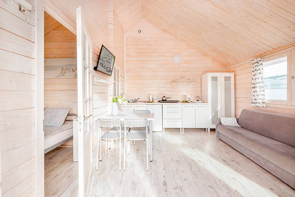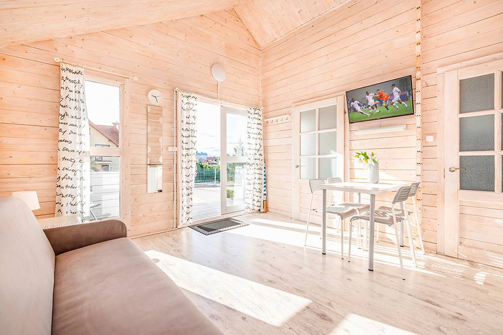 PL 50.110 Ferienhaus 2-4 Pers.: Schönes 2-Zimmerhaus mit 30 qm Wohnfläche. Freundlicher, holzvertäfelter Wohn-/Essraum mit Couch (Schlafsofa 1-2 Pers., nur 100 cm breit), Flachbild-TV, Esstisch, Küchenzeile (2 E-Platten Induktion). Doppelzimmer. Bad/WC. Überdachte Terrasse mit Sitzmöbeln.