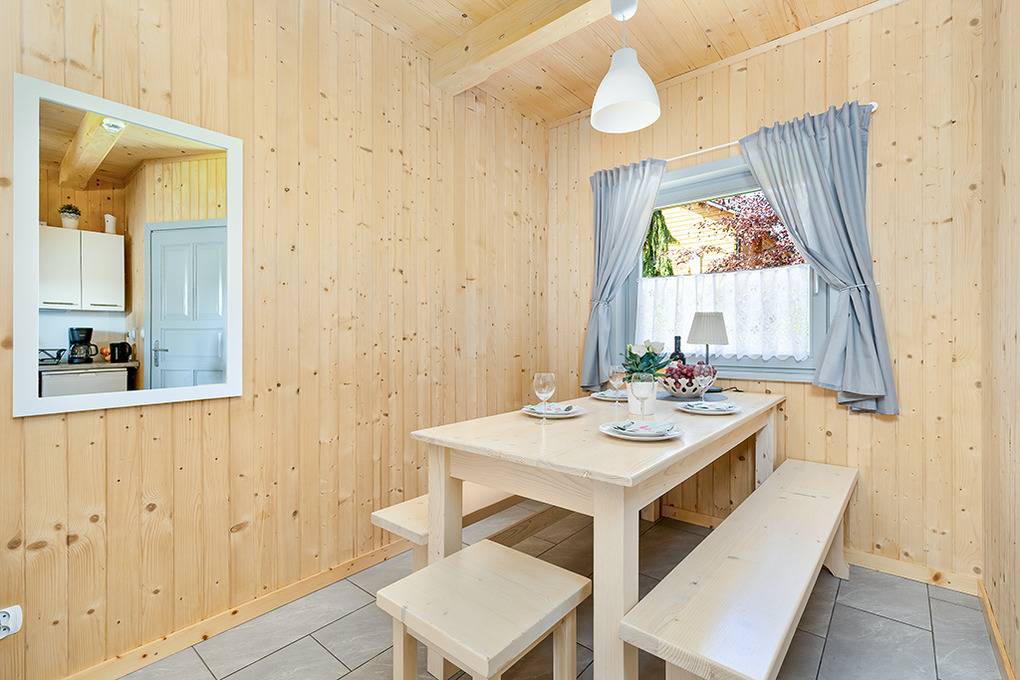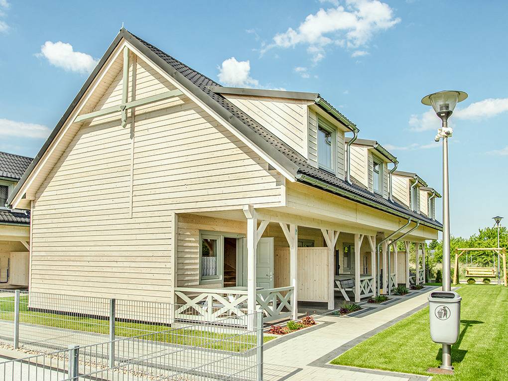 PL 50.10 Ferienhaus 2-8 Pers.: Rustikal eingerichtetes, helles Reihenhaus mit 60 qm Wohnfläche über 2 Etagen. Parterre: Wohn-/Essraum mit rustikaler Holzbalkendecke, Sofa (Klappcouch 2 Pers.), SAT-TV (dt. Programme), Esstisch, Küchenzeile (2 Pl. Ceranfeld). Bad: Du, Wb, WC. Vom Wohnzimmer Holztreppe ins Dachgeschoß: 4-Bettzimmer mit Doppelbett, Einzelbetten. 3-Bettzimmer mit Doppelbett, Einzelbett. Überdachte Terrasse mit Sitzmöbeln, Grill mit Blick auf den davorliegenden Garten.