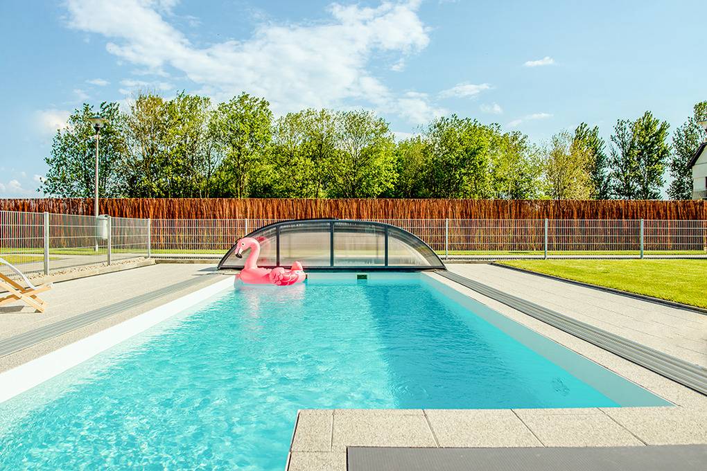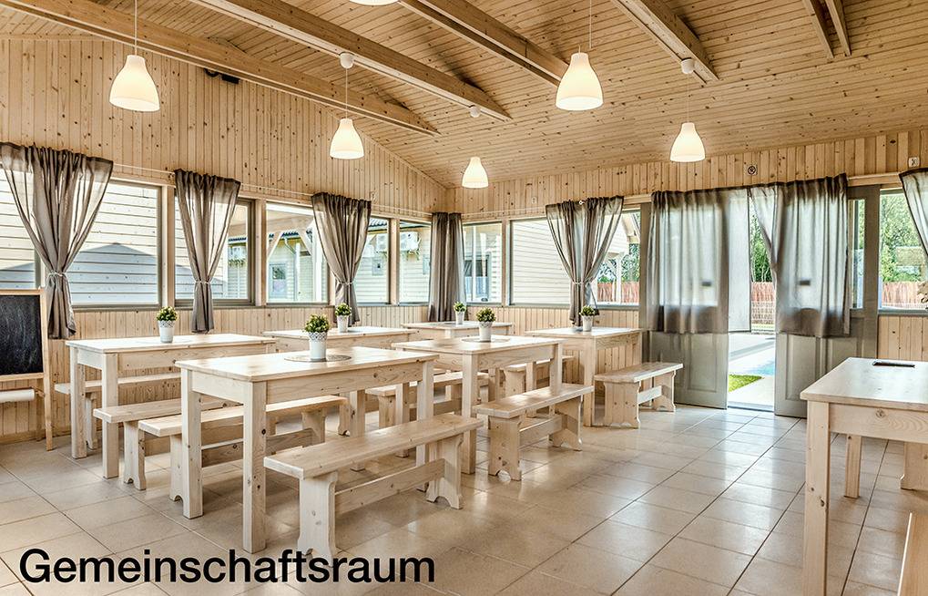 Haus: Sehr gepflegte Ferienhausanlage mit 12 Holzblock-Reihenhäusern 2019 erbaut auf einem ca 2800 qm großen, eingezäuntem Grundstück. In der Anlage: Rezeption, überdachter Außenpool (4,3 x 10 m. 31.5.-15.9. geöffnet und beheizt). Kinderspielplatz mit Schaukeln, Rutschen, Sandkasten,