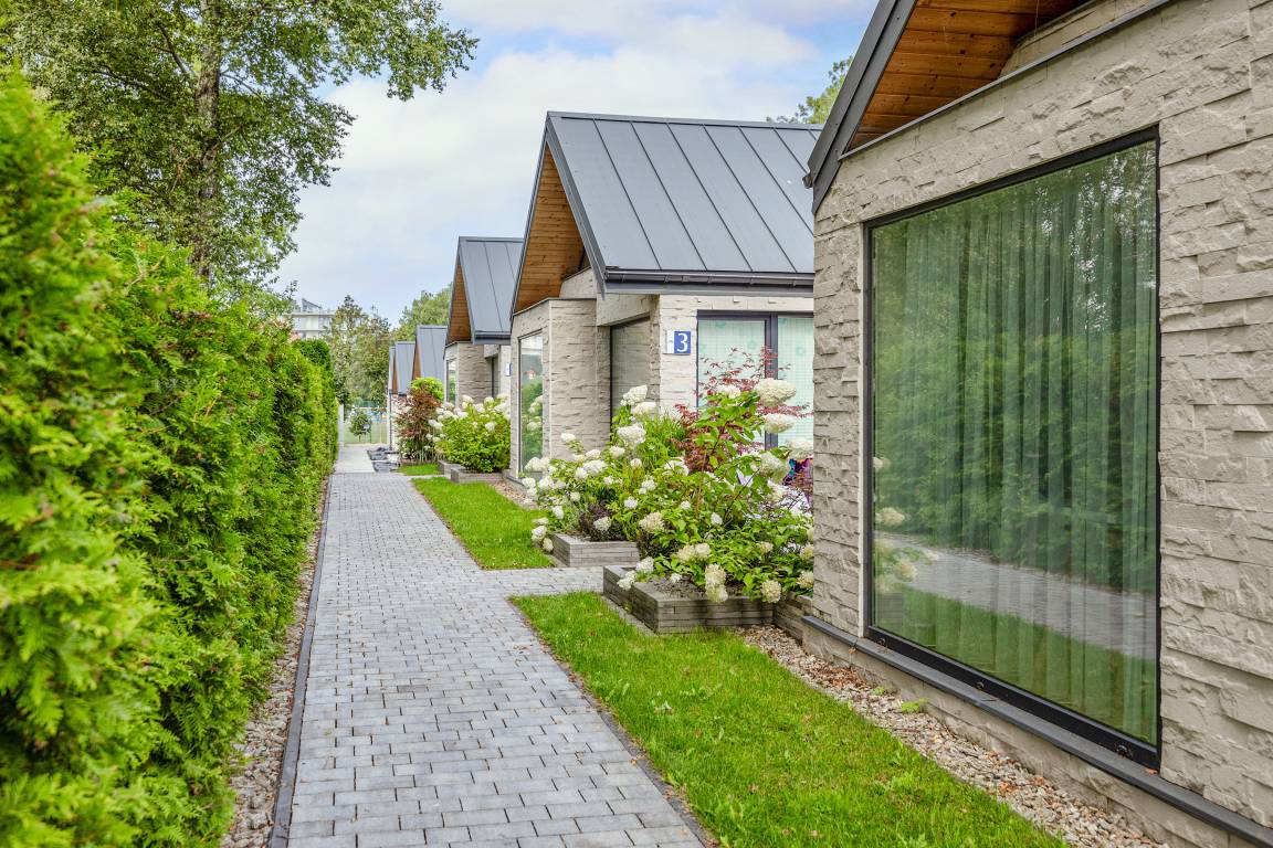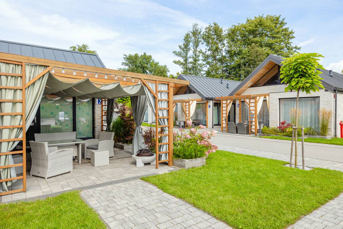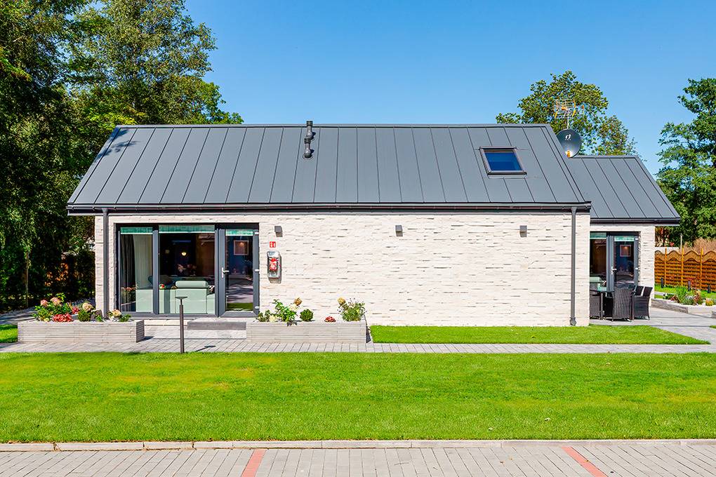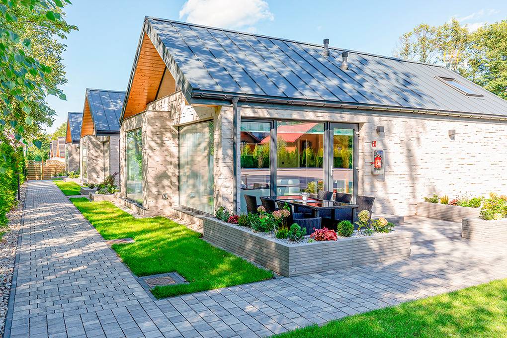 Haus: Kleine Ferienhausanlage auf einem sehr gepflegten, umzäunten Rasengrundstück (5000 qm), 2020 erbaut. 8 sehr komfortable Reihenhäuser mit elektrischem Kamin. In der Anlage: Rezeption.