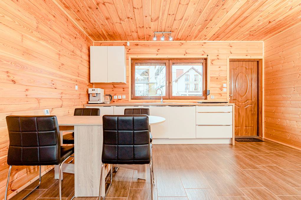 PL 50.9 Ferienhaus 2-5 Pers.: Sehr schönes 3-Zimmer-Ferienhaus mit 65 qm Wohnfläche über 2 Etagen. Parterre: Großzügiger Wohn-/Essraum mit Sofa (Klappcouch 1 Pers.), Couchtisch, Flachbild Sat-TV mit deutschen Programmen, Esstisch, moderner Küchenzeile (2 Platten-Induktionsherd). Sauna. Bad: Whirlpool, Wb, WC. Wendeltreppe ins Dachgeschoß: Doppelzimmer. 2-Bettzimmer mit Balkon. Bad: Dusche, Wb, WC. Terrasse mit Sitzmöbeln, Grill.