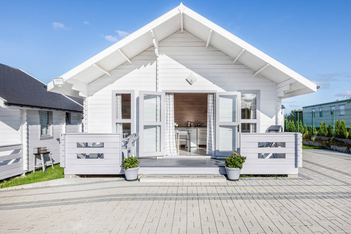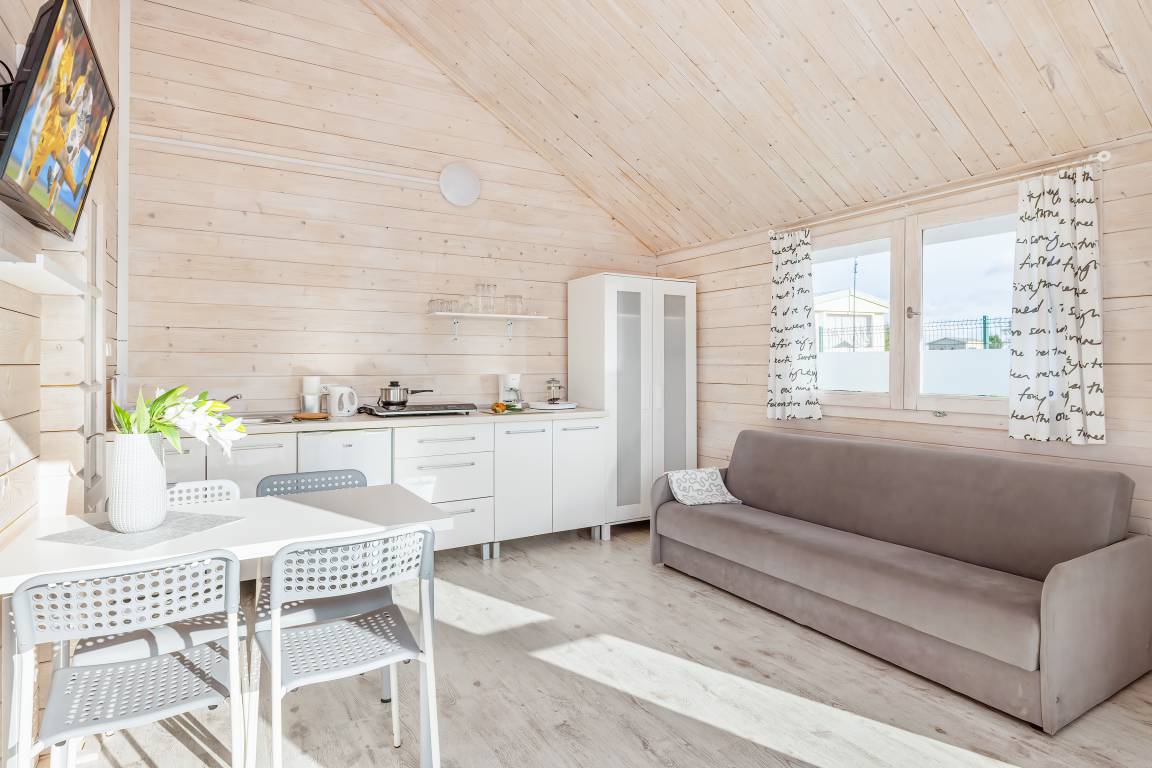PL 50.110 Ferienhaus 2-4 Pers.: Schönes 2-Zimmerhaus mit 30 qm Wohnfläche. Freundlicher, holzvertäfelter Wohn-/Essraum mit Couch (Schlafsofa 1-2 Pers., nur 100 cm breit), Flachbild-TV, Esstisch, Küchenzeile (2 E-Platten Induktion). Doppelzimmer. Bad/WC. Überdachte Terrasse mit Sitzmöbeln.