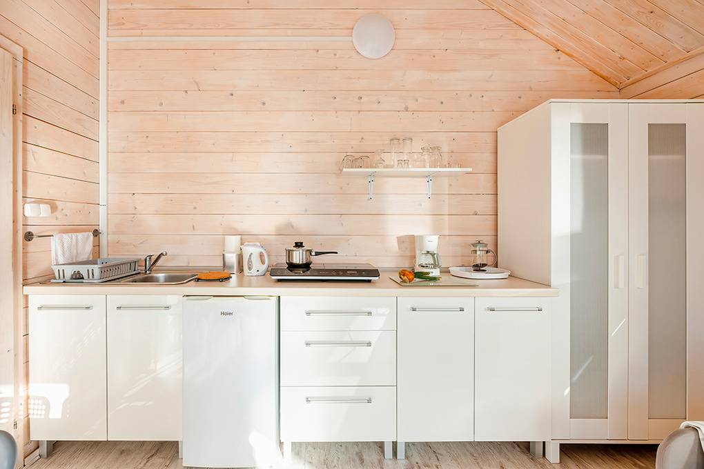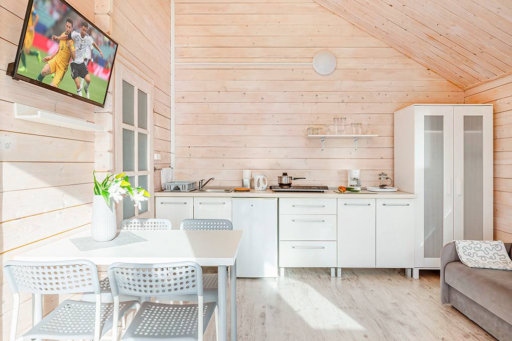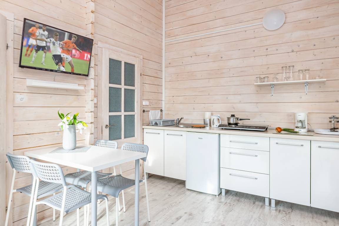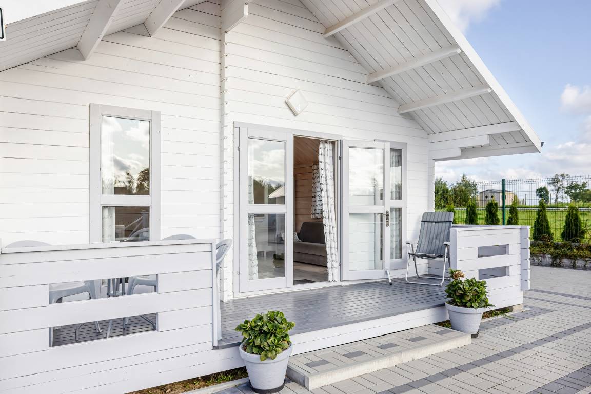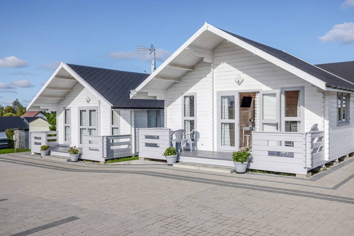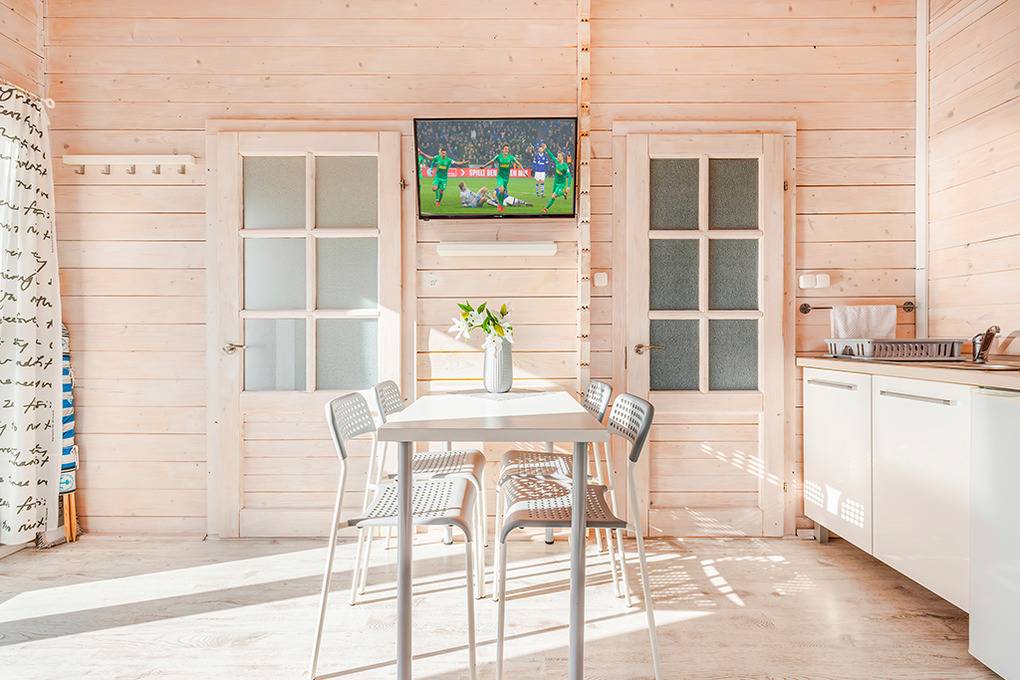 Gemütliche Ferienhäuser mit freundlicher Einrichtung. Kostenloses Internet über WLan. Heizung mit E-Radiatoren (auf Wunsch), Warmwasser über E-Boiler (30 l). Überdachte Terrasse mit Sitzmöbeln. 1 Pkw-Stellplatz/Ferienhaus auf dem umzäunten Grundstück im Mietpreis inklusiv. Hinweis: Wir empfehlen eine Belegung mit maximal 3 Personen auf Grund der schmalen Schlafcouch (100 cm Breite) im Tagesraum.