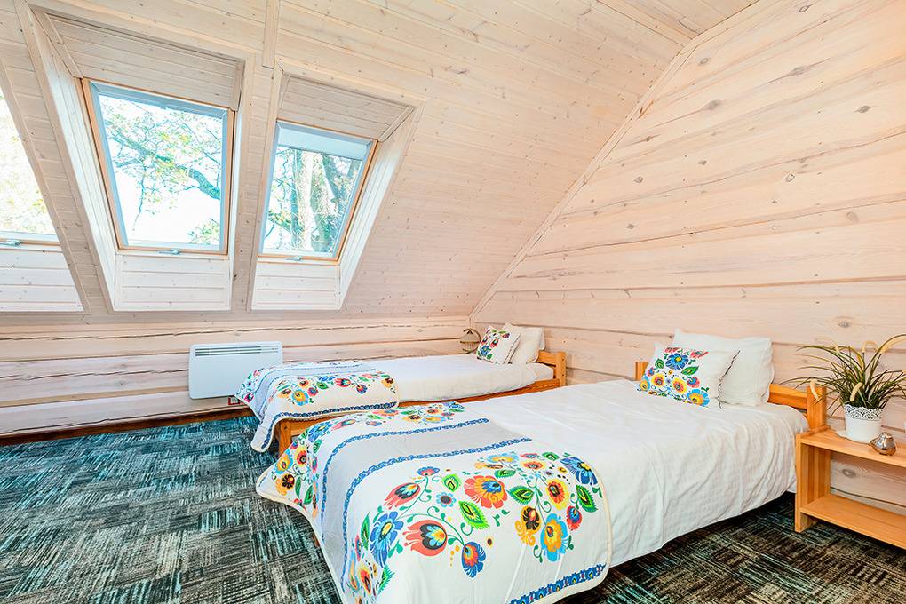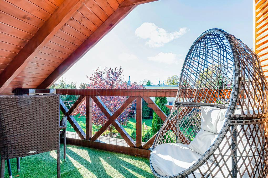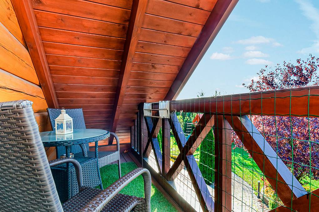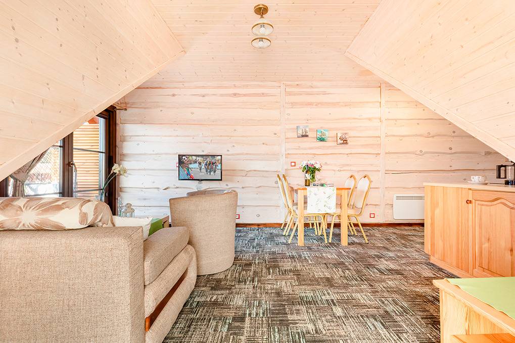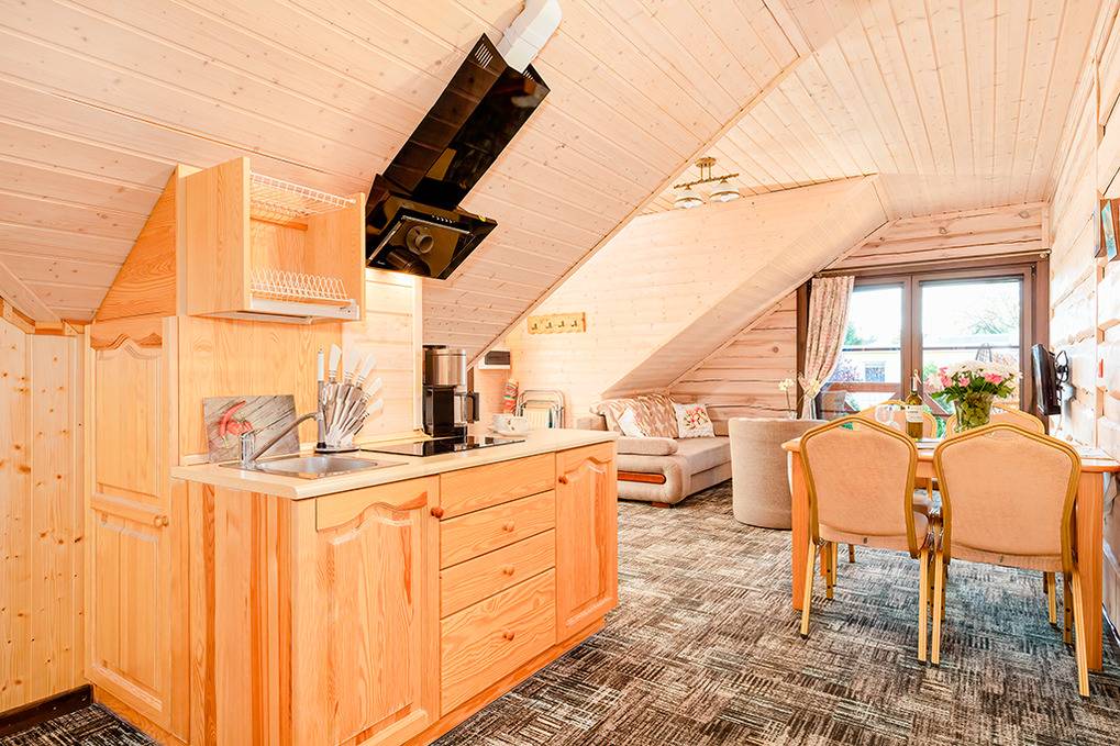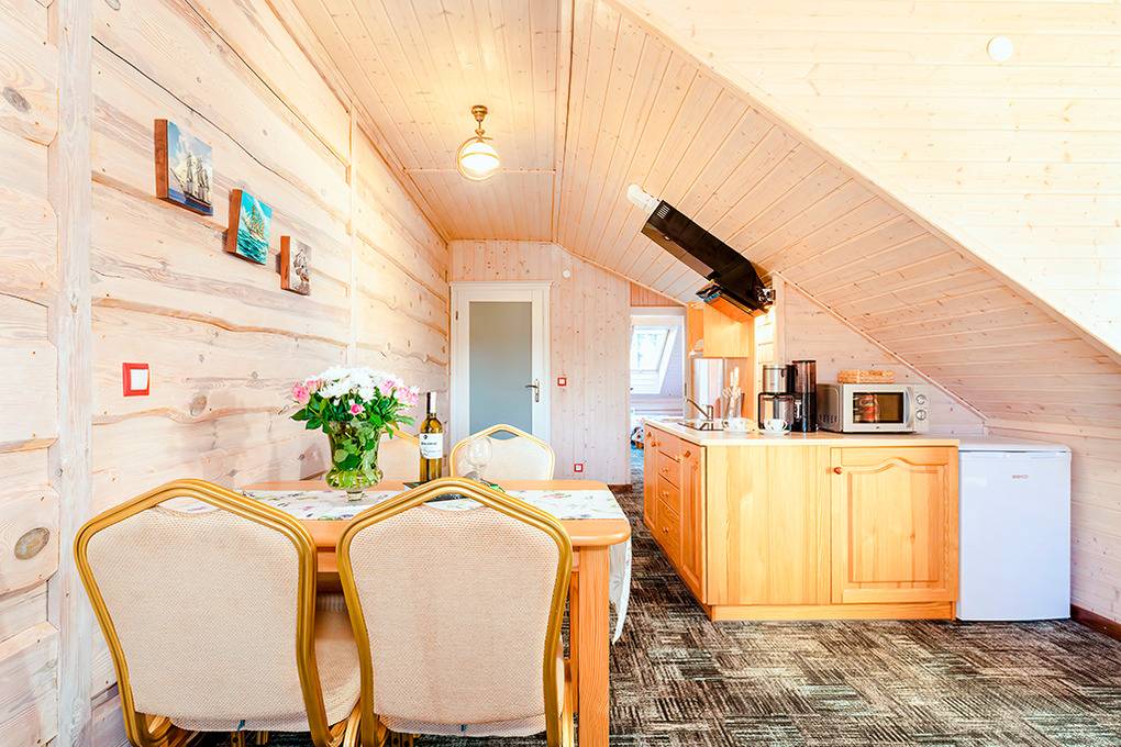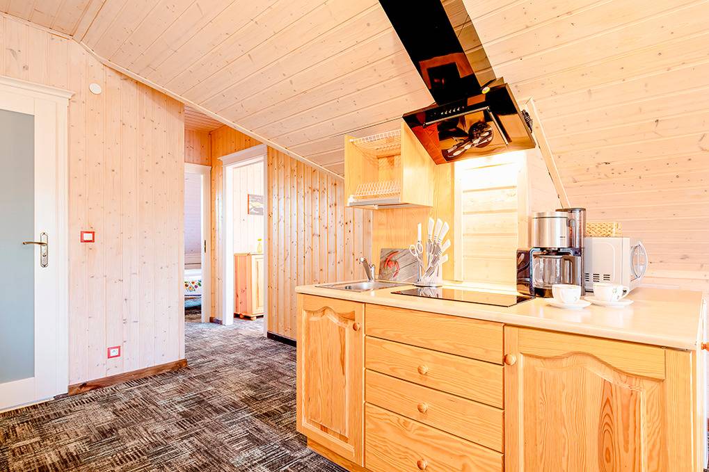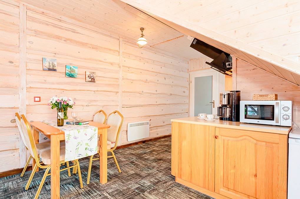 Gemütliche Ferienhäuser und Ferienwohnungen mit moderner, freundlicher Einrichtung. Kostenloses Internet (WLan). Zentralheizung, Warmwasser über E-Boiler (100 l). Halbüberdachte Terrasse oder Balkon mit Sitzmöbeln, Grill. Haustiere nicht erlaubt. 1 Parkplatz/ Objekt auf dem umzäunten Grundstück (Gebühr).