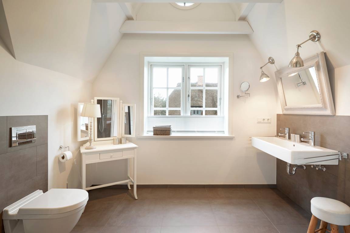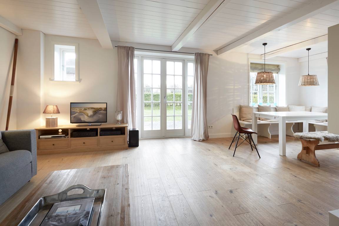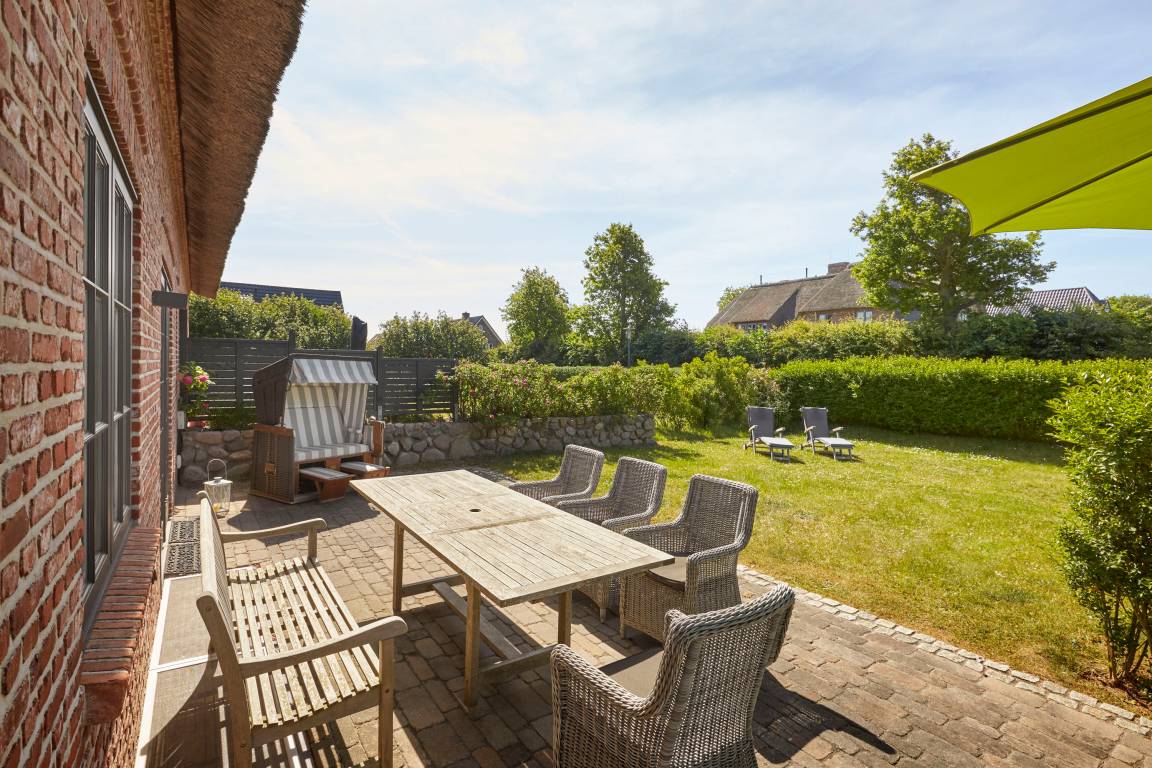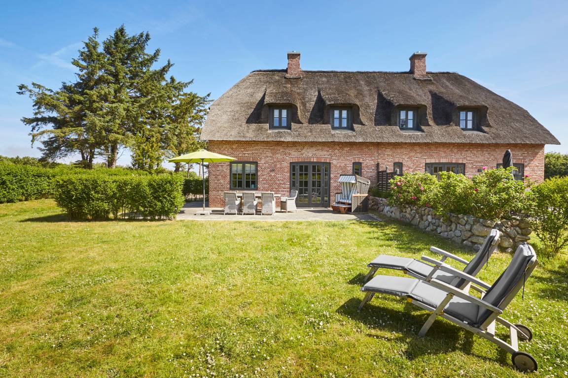 Diese Reetdach-Doppelhaushälfte zeichnet sich durch viel Liebe zum Detail und ihre Großzügigkeit aus. Das Grundstück umfaßt 600 qm. Es wurde viel Wert auf friesische Bauelemente gelegt wie das rote Mauerwerk, die Holzsprossenfenster und den typischen Friesenwall. Im Inneren erwartet Sie eine hochwertige Ausstattung im Long Island-Look mit Holzdeckenbalken und Eichenböden. Ein offener Kamin und ein großer Saunabereich mit Wellness-Ruhezone ist ebenso vorhanden wie eine große Terrasse und ein Garten. Mit nur wenigen Schritten gelangen Sie zum Strand von Utersum und genießen hier die Nordsee von ihrer schönsten Seite - wunderbare Sonnenuntergänge inklusive! Seien Sie unser Gast - wir freuen uns auf Sie! Mehr unter www.strandhaus-foehr.de