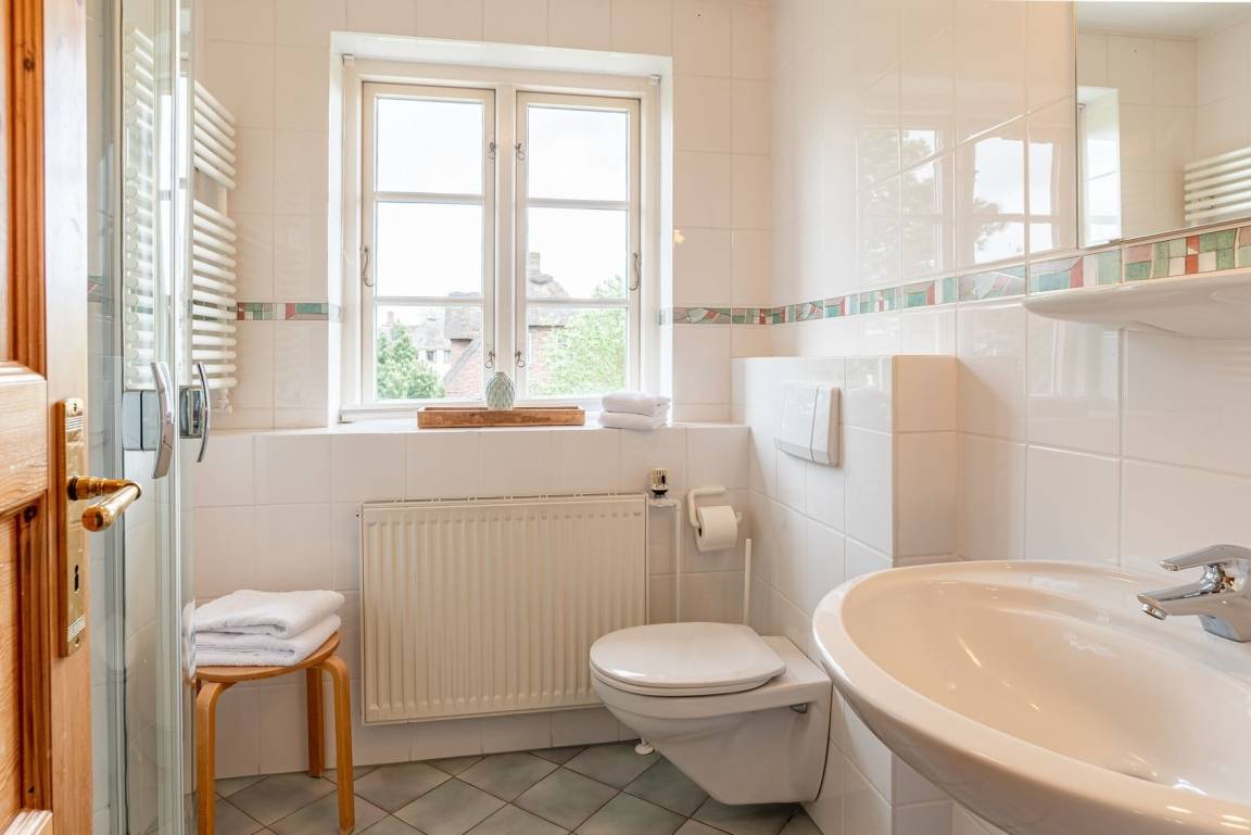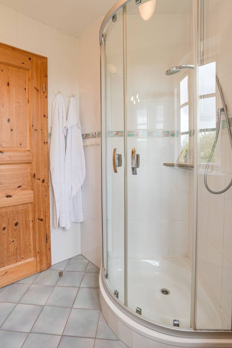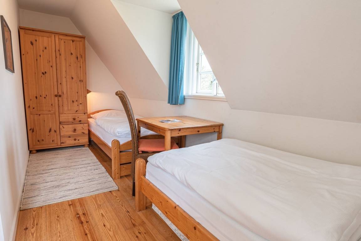 Durch die Seitentür gelangen Sie in den Vorflur in dem sich die Garderobe befindet und von dem man ins erste Duschbad gelangt. Weiter gelangt man in den großzügigen Wohn- und Essbereich, in dem sich auch der Zugang zur Terrasse und der Kaminofen befinden. Über die Treppe gelangen Sie in das 1. Obergeschoss mit zwei Schlafzimmern und dem zweiten Duschbad. Ein Schlafzimmer davon ist mit zwei Einzelbetten (hintereinander) und eins mit einem Doppelbett ausgestattet.