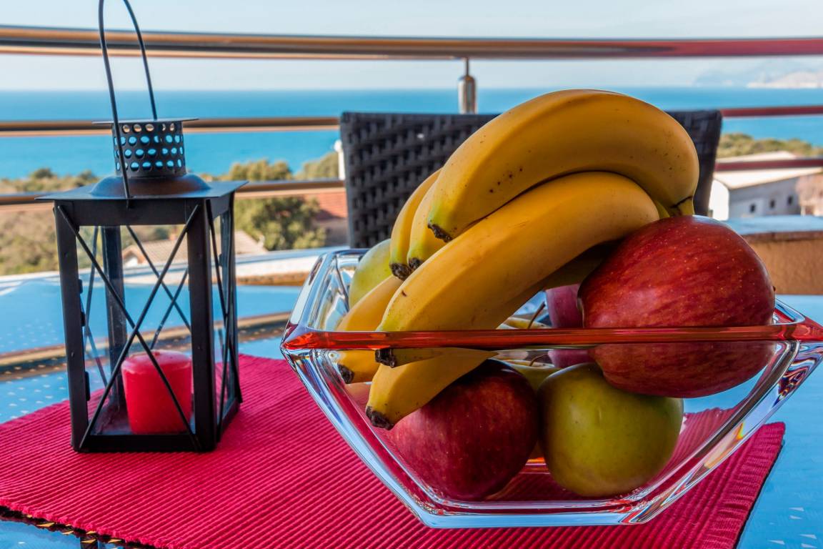 Geniesse jeden Abend den Meerblick und die direkt vor den Augen untergehende Sonne - Die Ferienwohnung hat einen privaten Balkon und zusätzlich lädt eine 200 qm grosse Sonnenterrasse auf dem Dach des Gebäudes zum Relaxen ein.