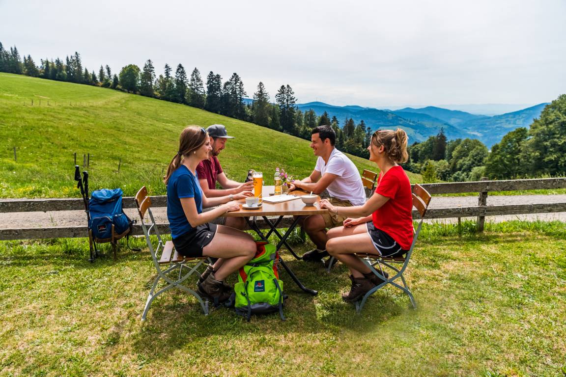 Zwischen Muggenbrunn, Todtnau, Utzenfeld und Wieden im Südschwarzwald liegt die Kuppe des Knöpflesbrunnen. Knapp unterhalb finden Sie das gleichnamige Almgasthaus, auf einer Höhe von 1100 m, rings umgeben von ausgedehnten Weiden mit Blick ins Wiesental hinunter und bei gutem Wetter bis hin zu den Gipfeln des Eiger, Mönch und der Jungfrau in den Berner Alpen.