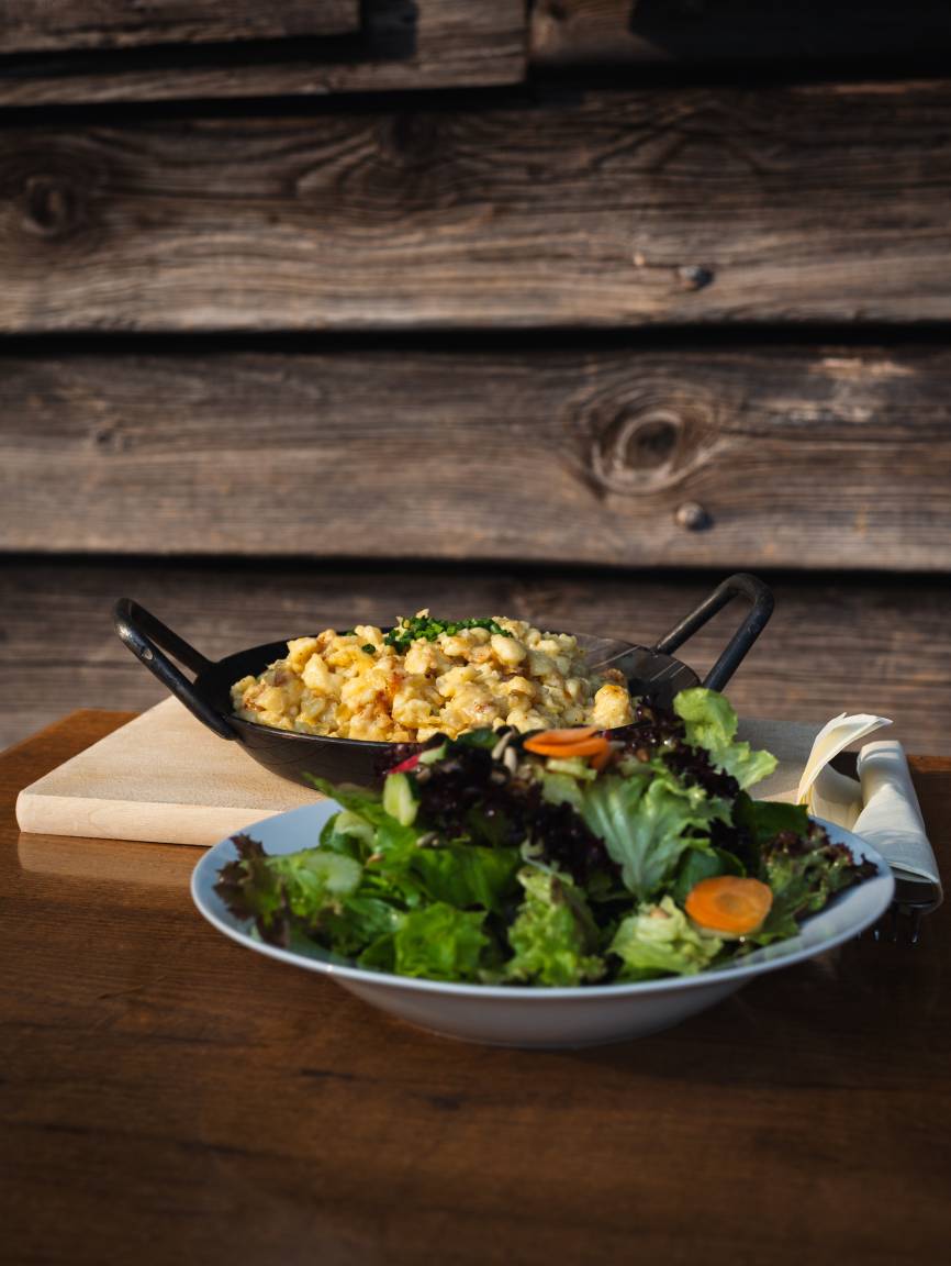 Eine sonnige Terrasse und ein gemütlicher Gastraum, schmackhafte Almküche und selbstgemachte Kuchen laden auf einer Wanderung oder Radtour zum Verweilen und Genießen dieser wunderschönen Landschaft ein.