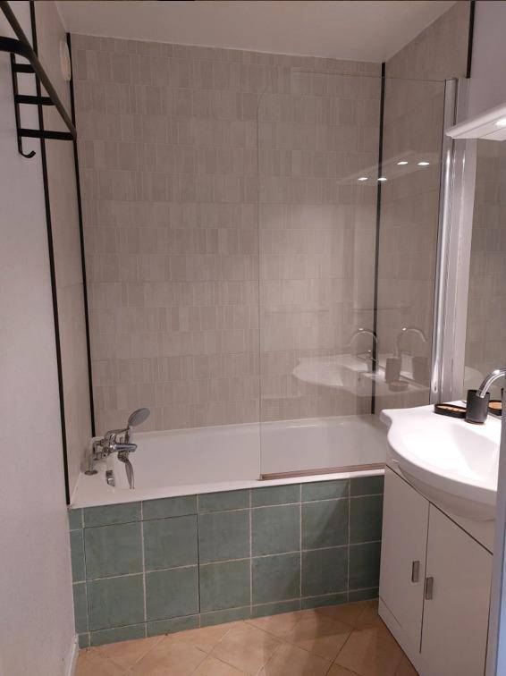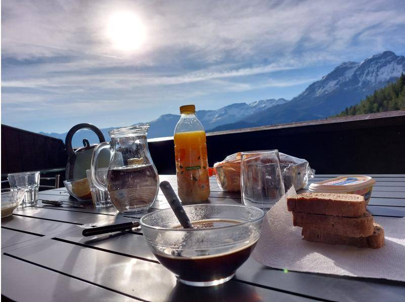 Fläche von ungefähr 28 m². Erdgeschoss. Orientierung : Ost, Süd. Wohnzimmer mit Klappschlafcouch (r). offener Schlafbereich mit 2 Stockbetten. Kochnische mit Raclettegerät, Wasserkocher, Kaffeemaschine, Geschirrspülmaschine, Mikrowellenherd, kleiner Backofen, 2 Herdplatten, Kühlschrank. Badezimmer mit Badewanne. separates WC. Balkon. Die oberen Betten sind nicht für Kinder unter 6 Jahren geeignet.
