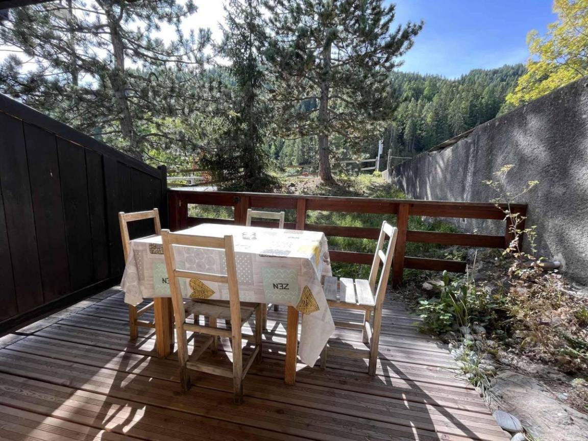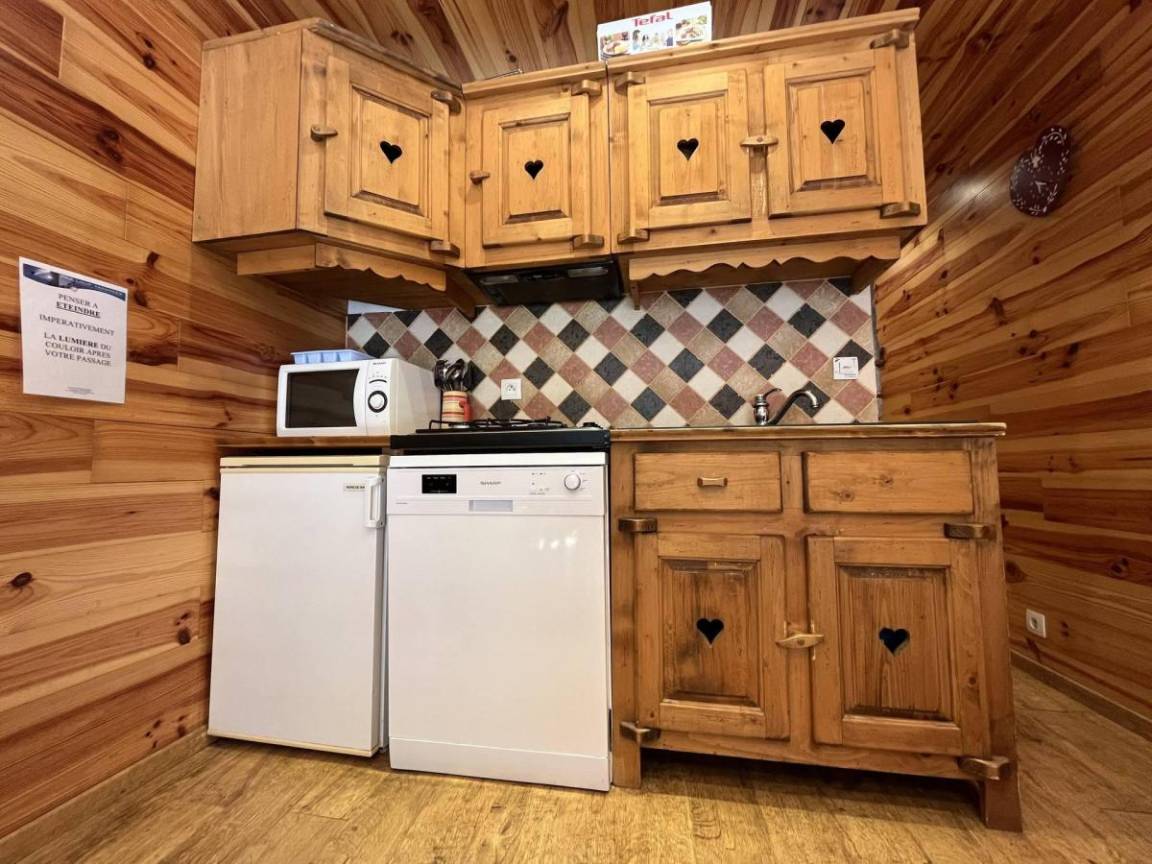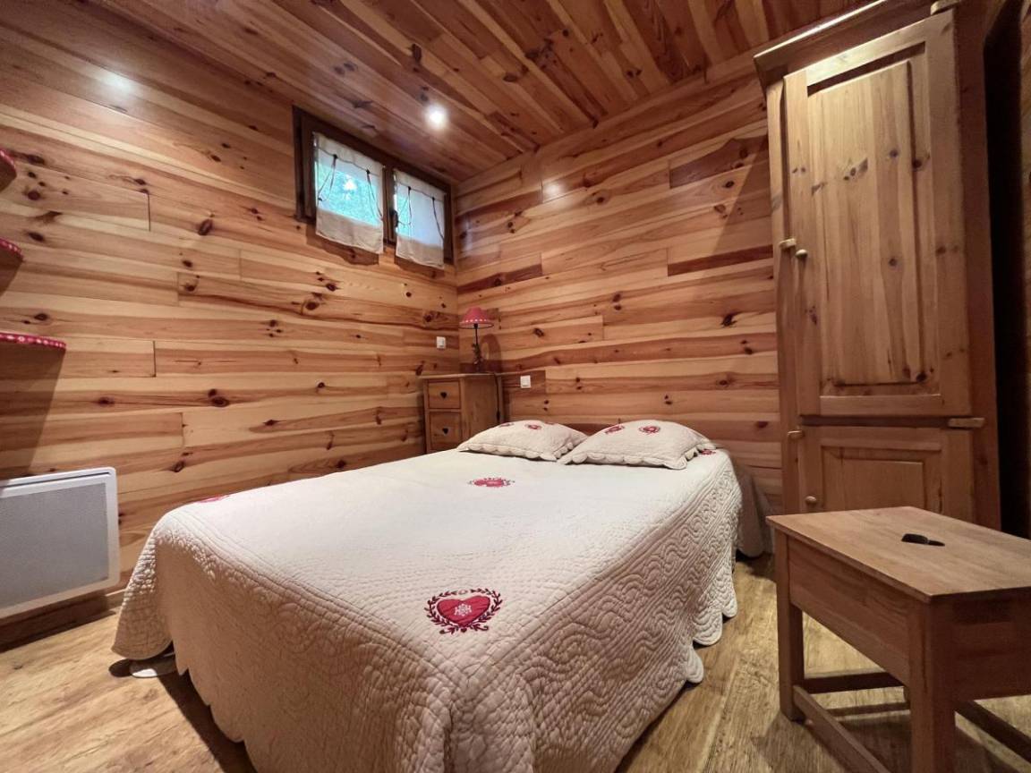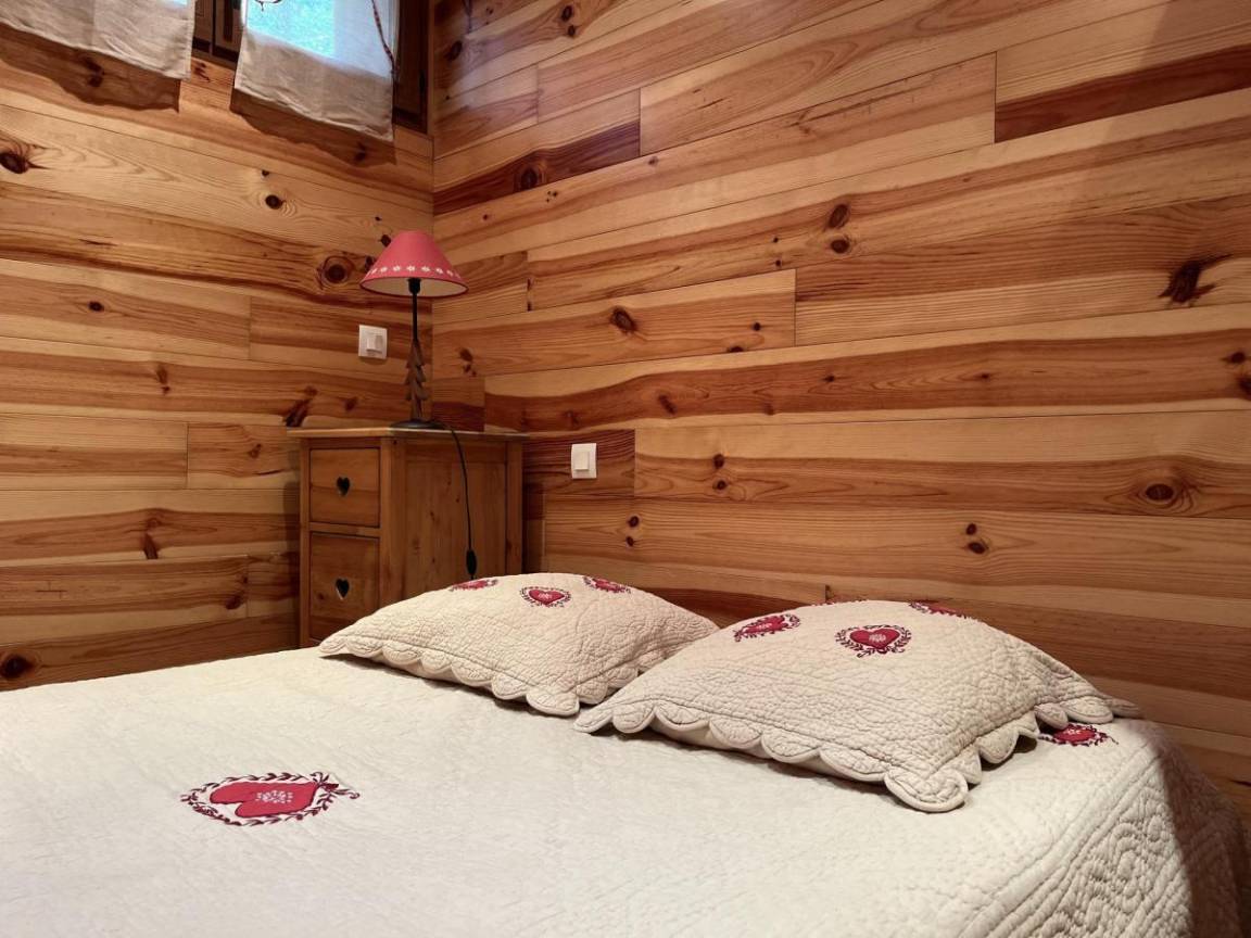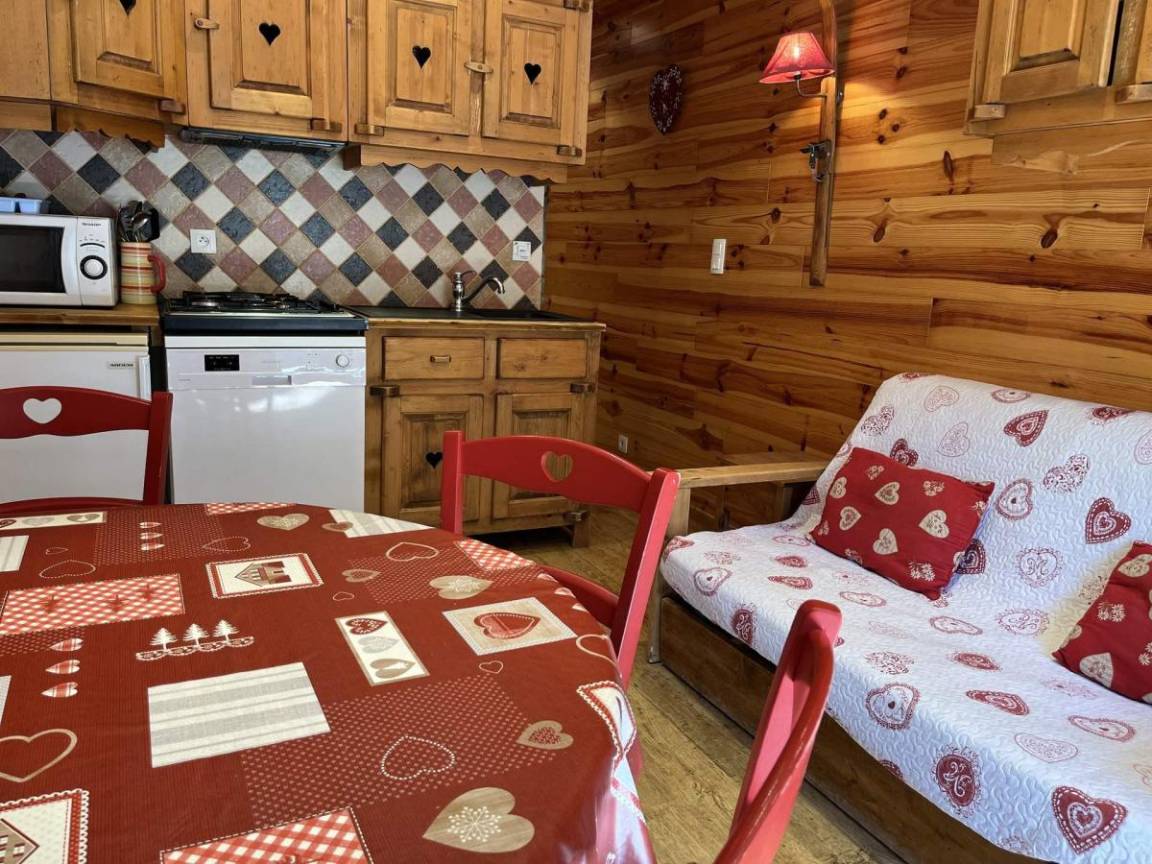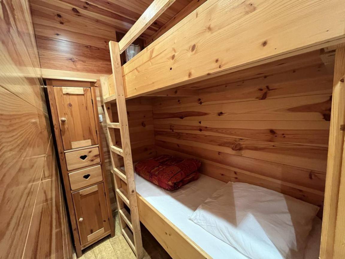 Fläche von ungefähr 38 m². Orientierung : West. Flur mit Skiaufbewahrungsfach. Wohnzimmer mit Klappschlafcouch (140). Schlafzimmer mit Doppelbett (140). offener Schlafbereich mit 2 Stockbetten (80). Kochnische mit Raclettegerät, Kaffeemaschine (à filtre), Geschirrspülmaschine, Mikrowellenherd, 4 Gasherdplatten, Kühlschrank. Waschräume mit Dusche, WC. Balkon. Die oberen Betten sind nicht für Kinder unter 6 Jahren geeignet.