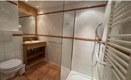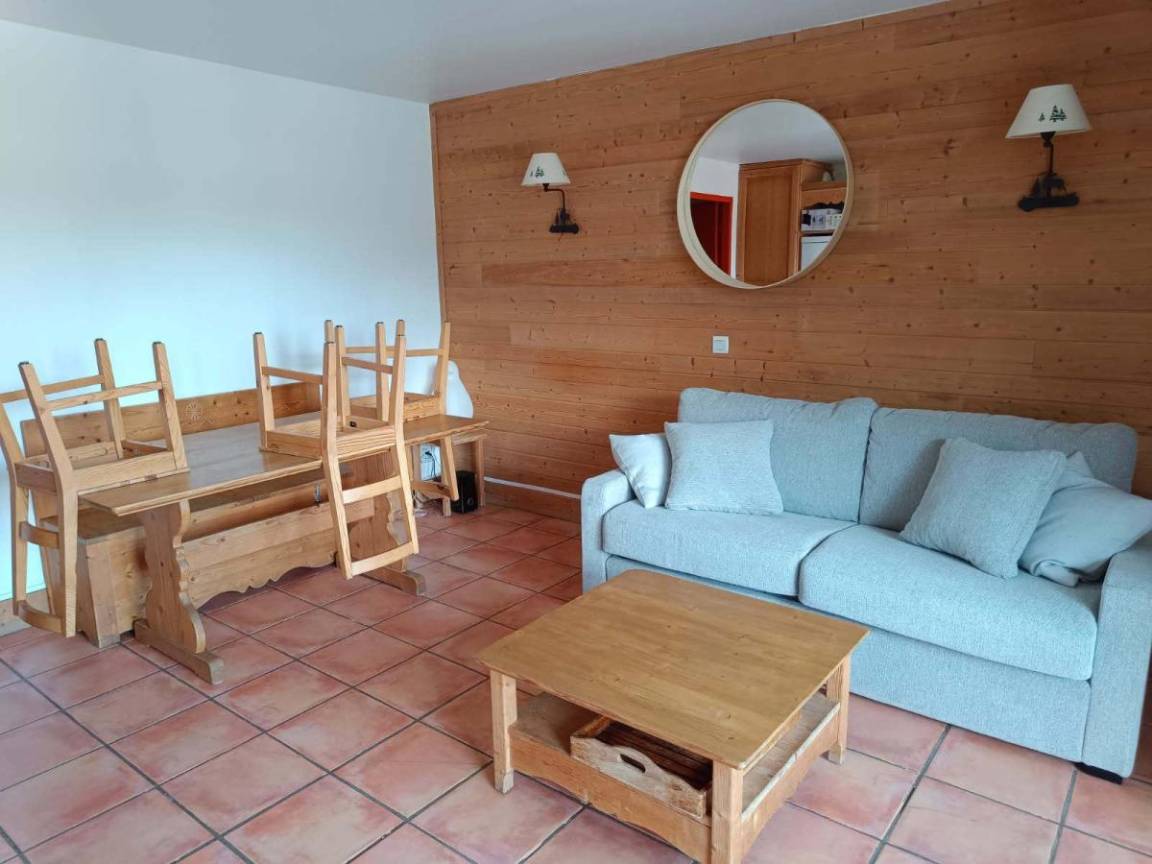 Fläche von ungefähr 43 m². Erdgeschoss. Wohnzimmer mit Klappschlafcouch (140). 2 Schlafzimmer mit Doppelbett (140). offener Schlafbereich mit 2 Stockbetten. Kochnische mit , Fonduegerät, Raclettegerät, Wasserkocher, Kaffeemaschine, Backofen, Geschirrspülmaschine, Mikrowellenherd, 2 elektronische Herdplatten, Kühlschrank. Waschräume mit WC. Terrasse. Die oberen Betten sind nicht für Kinder unter 6 Jahren geeignet.