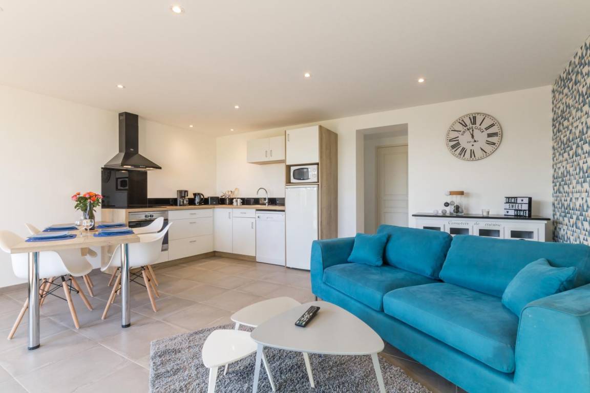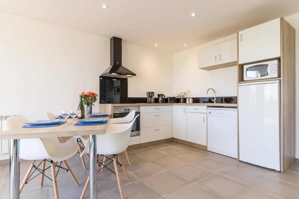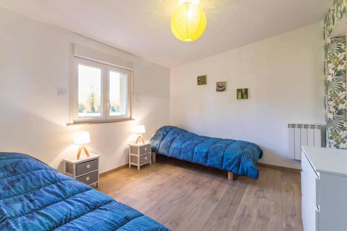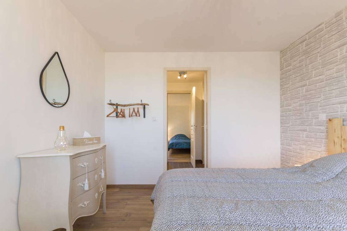 Freistehendes, ebenerdiges Haus. Wohnzimmer mit Kochnische (Backofen, Geschirrspüler, Mikrowelle) und Sitzecke (TV). Schlafzimmer 1 (1 Doppelbett 140x190 cm). Duschbad mit ebenerdiger Dusche. Schlafzimmer 2 (2 Einzelbetten 90x190 cm). WC. Hauswirtschaftsraum (Waschmaschine). Babyausstattung auf Anfrage. Elektrische Heizung. Alle Nebenkosten inklusive. Bettwäsche kann gemietet werden. Reinigungsservice auf Anfrage. Privater, umzäunter Garten. Holzterrasse. Gartenmöbel. 2 Sonnenliegen. Grill. Meerblick. Parkplatz. Bouleplatz.