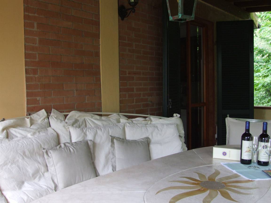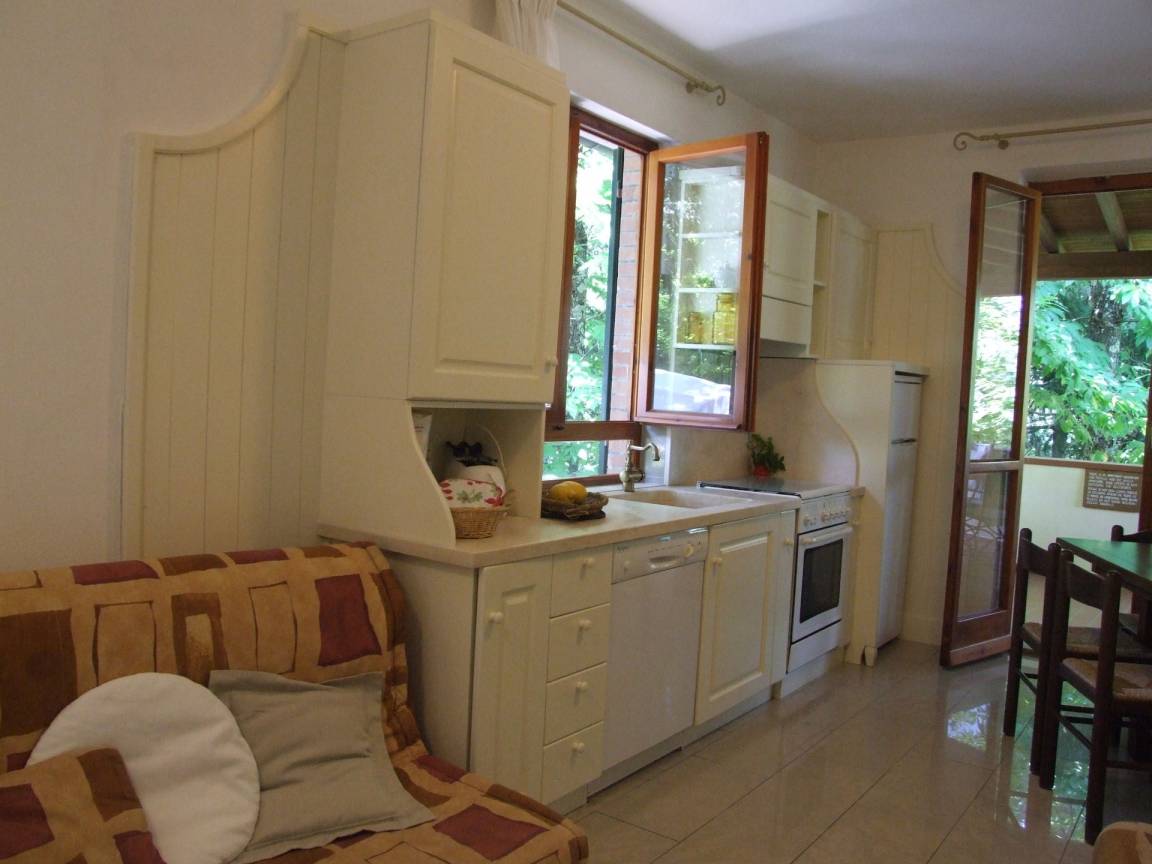 Wohnküche: gut ausgestattete Küche, Esstisch (Personen: 8), Spülmaschine, Kühlschrank, Tiefkühler, Herd, Ofen, Toaster, Bügeleisen, Italienische Kaffeemaschine, Amerikanische Kaffeemaschine, Kamin, Doppel-Schlafsofa, WiFi Internet, Fliegengitter, Satelliten-TV, Ausgang auf den Garten, Ausgang auf die Veranda.