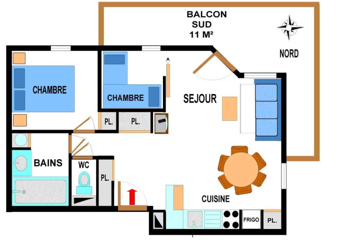 Die Residenz Le Bonheur des Pistes*** besteht aus zwei Chalets, die aus traditionellen Materialien, Stein und Holz, mit einem Dach aus Steinplatten aus der Region gebaut wurden, wodurch sie sich perfekt in die unberührte Alpenlandschaft des Val Cenis einfügt. Sie bietet einen wirklich herrlichen Panoramablick auf das Vanoise-Gebirge, einschließlich seines höchsten Gipfels: der Dent Parachée (der gezackte Zahn). Die Residenz bietet Ihnen 70 voll ausgestattete und komfortable Apartments auf 4 Etagen (mit Aufzügen). Alle Apartments sind gemütlich mit Kiefernmöbeln im Bergstil eingerichtet und verfügen über einen Fernseher, eine Küche mit Mikrowelle/Grill, Geschirrspüler, 4 Elektrokochplatten und einen Balkon. Fläche von ungefähr 42 m². 1te Etage. Orientierung : Süd, West. Wohnzimmer mit Ausziehschlafcouch für 2 Personen. Schlafzimmer mit Doppelbett. Schlafzimmer mit 2 Stockbetten. Kochnische mit Kaffeemaschine, Grill, Geschirrspülmaschine, Mikrowellenherd, 4 elektronische Herdplatten, Kühlschrank. Badezimmer mit Badewanne, Waschbecken. separates WC. Balkon. Die oberen Betten sind nicht für Kinder unter 6 Jahren geeignet.