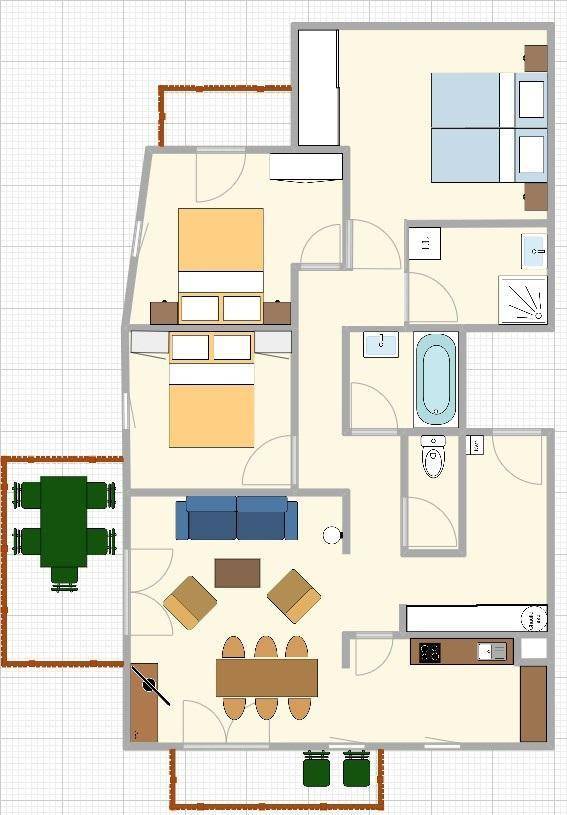 Fläche von ungefähr 92 m². 1te Etage. Orientierung : Ost, Süd. Wohnzimmer mit Klappschlafcouch. Schlafzimmer mit Doppelbett. Schlafzimmer mit Balkon, Doppelbett. Schlafzimmer mit 2 Stockbetten. Küche mit Kaffeemaschine, Dunstabzugshaube, Geschirrspülmaschine, Mikrowellenherd, 2 Glaskeramikkochfelder, Kühlschrank. Badezimmer. Badezimmer. separates WC. Die oberen Betten sind nicht für Kinder unter 6 Jahren geeignet.