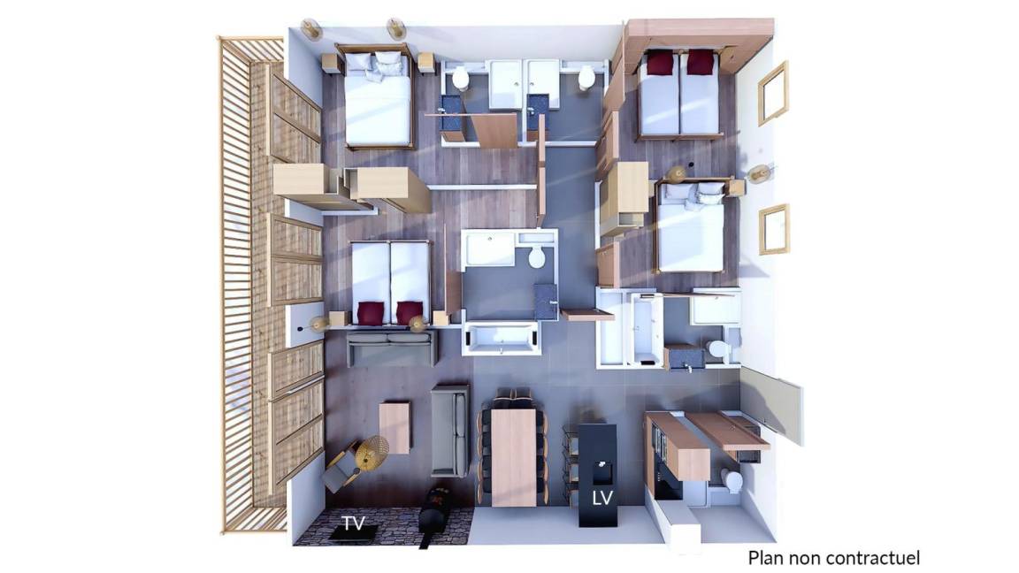 Fläche von ungefähr 118 m². Wohnzimmer mit Klappschlafcouch, Schwedenofen. Schlafzimmer mit Badewanne, Dusche, Doppelbett, WC. Schlafzimmer mit Dusche, Doppelbett, WC. Schlafzimmer mit Badewanne, Dusche, 2 zwei Einzelbetten, WC. Schlafzimmer mit Dusche, 2 zwei Einzelbetten, WC. Kochnische mit Fonduegerät, Raclettegerät, Wasserkocher, 2 Kaffeemaschinen (filtre et Nespresso Magimix), , Multifunktions-Backofen, Toaster, Geschirrspülmaschine, Mikrowellenherd, Induktionsherdplatten, Kühl-Gefrier-Kombination. Waschräume mit Dusche, WC. Balkon.