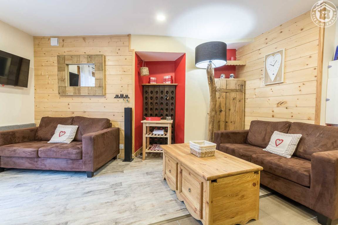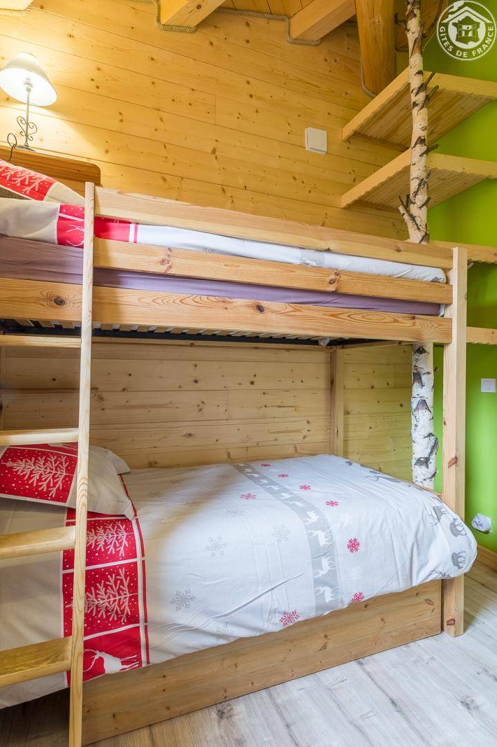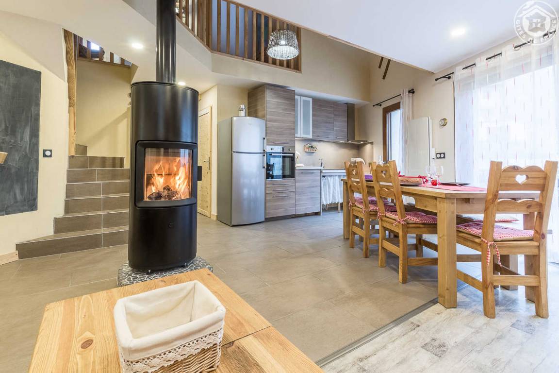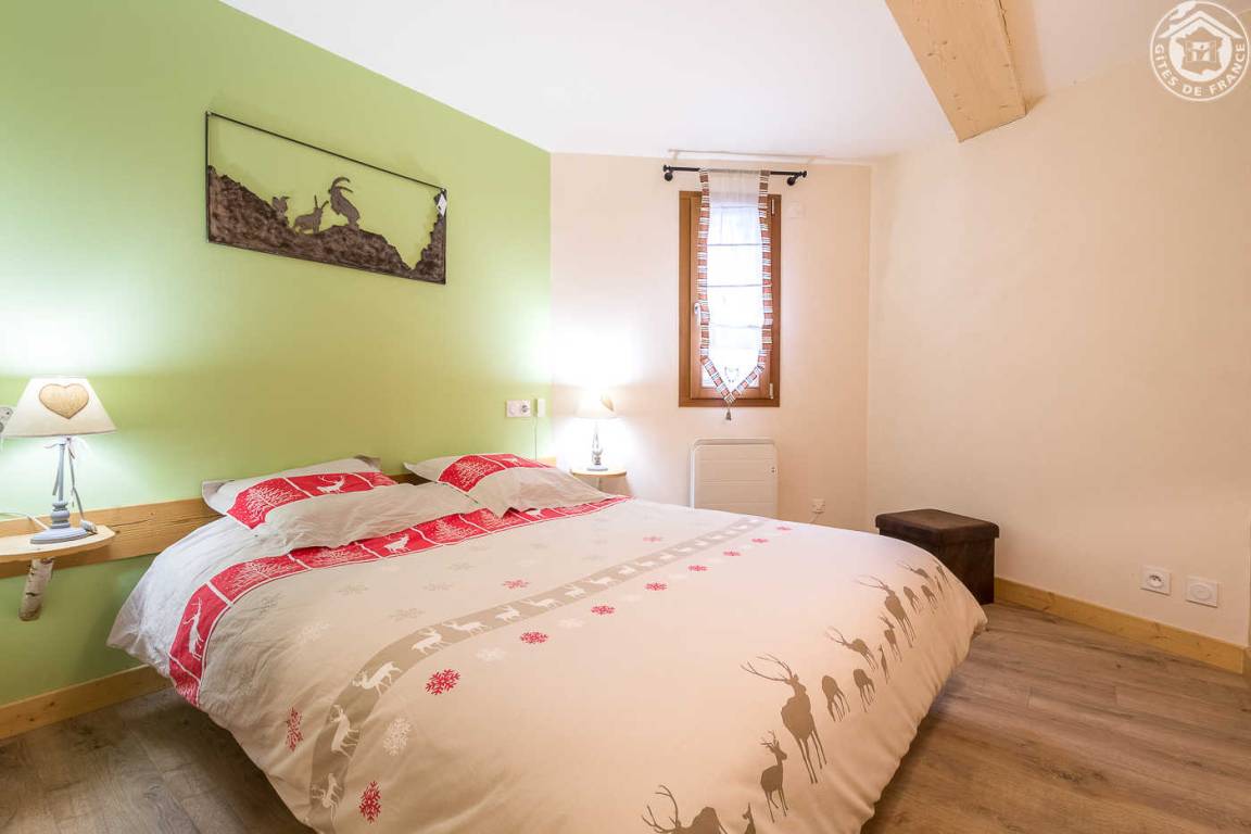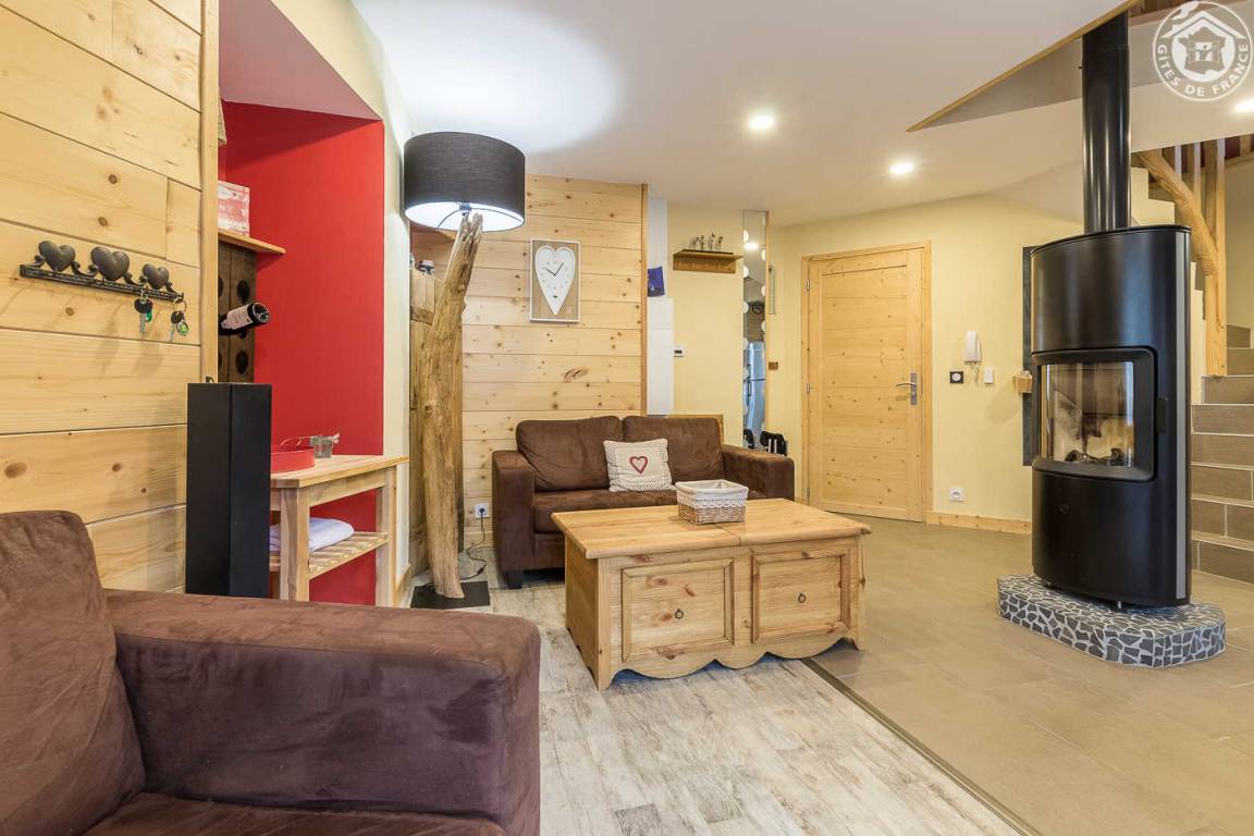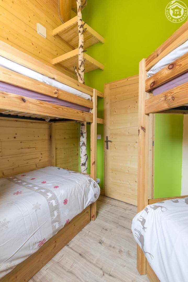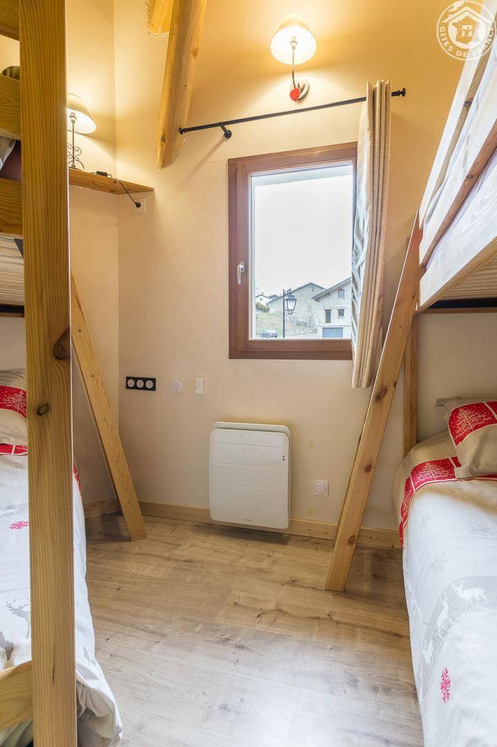 Gîte in einem Haus mit 1 weiteren Gîte für 6 Personen. Gemeinsamer Eingang. Erdgeschoss: Wohnküche mit Holzofen (Holz inklusive), 1 Schlafzimmer für 2 Personen (1 160 x 200 cm großes Bett). Badezimmer (Dusche + WC) zugänglich für Personen mit eingeschränkter Mobilität. Erster Stock: 2 Schlafzimmer (4 Etagenbetten / 1 Doppelbett). Duschraum (integriertes WC) + separates WC. Private Terrasse mit Blick auf das Tal. Waschmaschine und Trockner befinden sich im gemeinsamen Waschraum. Privater Skiraum + elektrischer Schuhtrockner. Fahrradkeller. Rodeln möglich. Gemeinsamer Wellnessbereich gegen Aufpreis und nach Reservierung mit Sauna, Bar, Heimkino und ausgestatteter überdachter Terrasse (kontaktieren Sie die Eigentümer). Ladesteckdose für Elektrofahrzeuge (Ladegebühr). Vermietung Sonntag - Sonntag in der Hochwintersaison