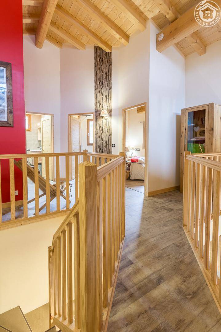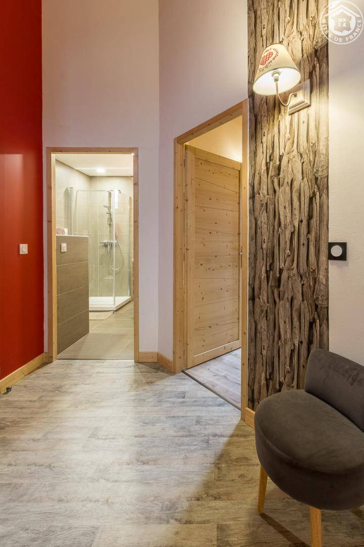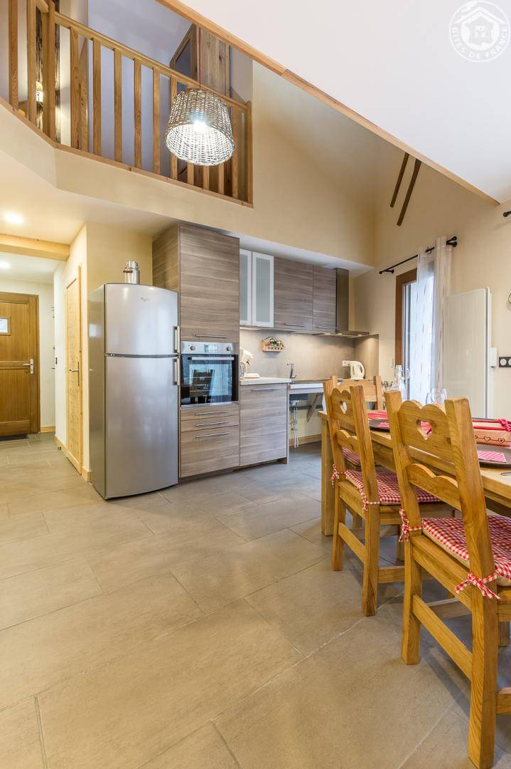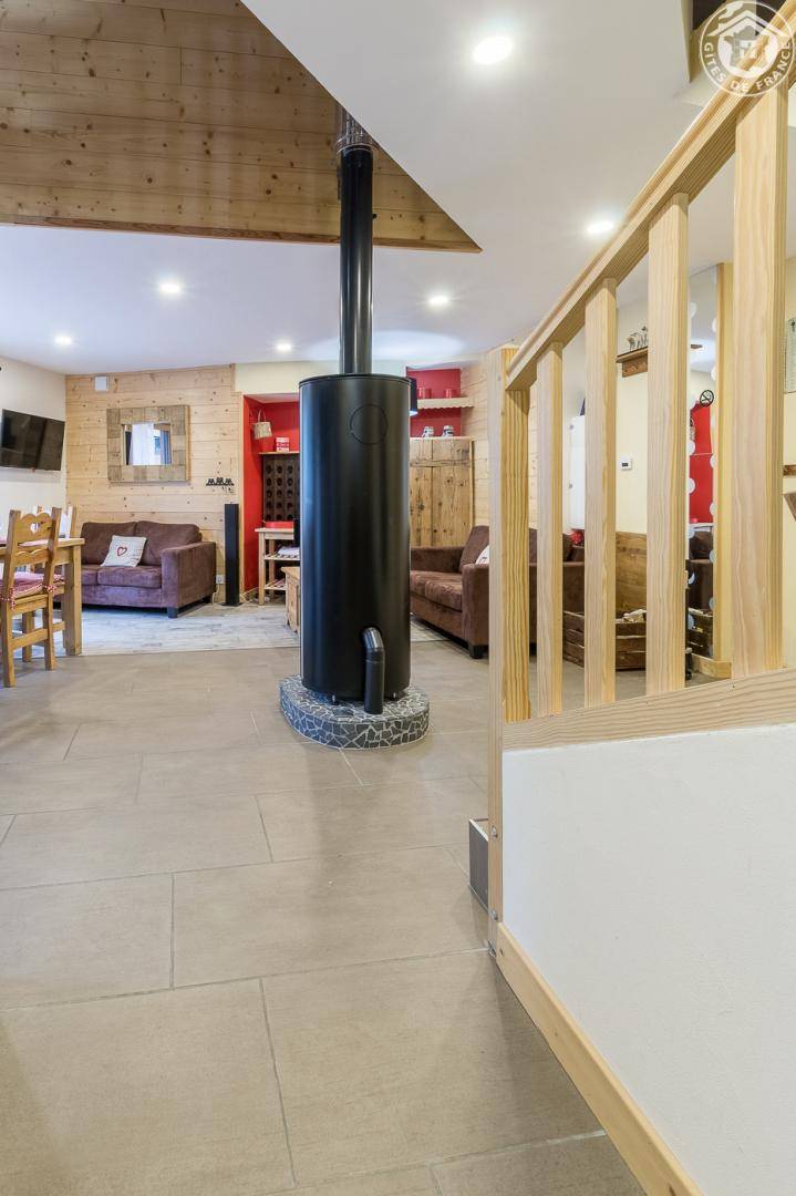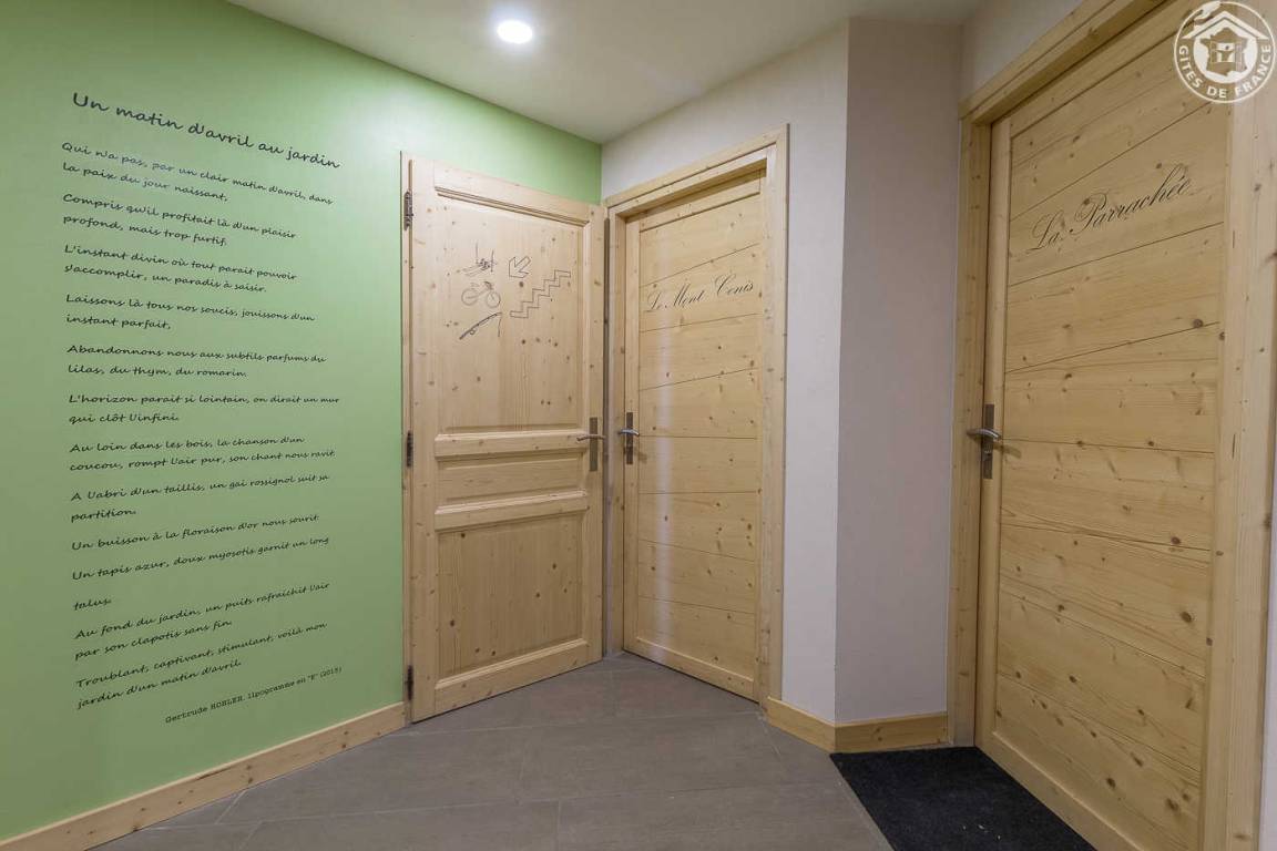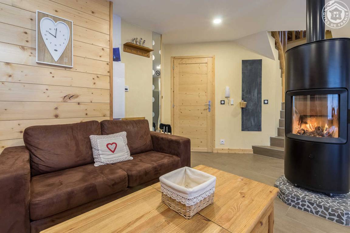 Gîte in einem Haus mit 1 weiteren Gîte für 6 Personen. Gemeinsamer Eingang. Erdgeschoss: Wohnküche mit Holzofen (Holz inklusive), 1 Schlafzimmer für 2 Personen (1 160 x 200 cm großes Bett). Badezimmer (Dusche + WC) zugänglich für Personen mit eingeschränkter Mobilität. Erster Stock: 2 Schlafzimmer (4 Etagenbetten / 1 Doppelbett). Duschraum (integriertes WC) + separates WC. Private Terrasse mit Blick auf das Tal. Waschmaschine und Trockner befinden sich im gemeinsamen Waschraum. Privater Skiraum + elektrischer Schuhtrockner. Fahrradkeller. Rodeln möglich. Gemeinsamer Wellnessbereich gegen Aufpreis und nach Reservierung mit Sauna, Bar, Heimkino und ausgestatteter überdachter Terrasse (kontaktieren Sie die Eigentümer). Ladesteckdose für Elektrofahrzeuge (Ladegebühr). Vermietung Sonntag - Sonntag in der Hochwintersaison