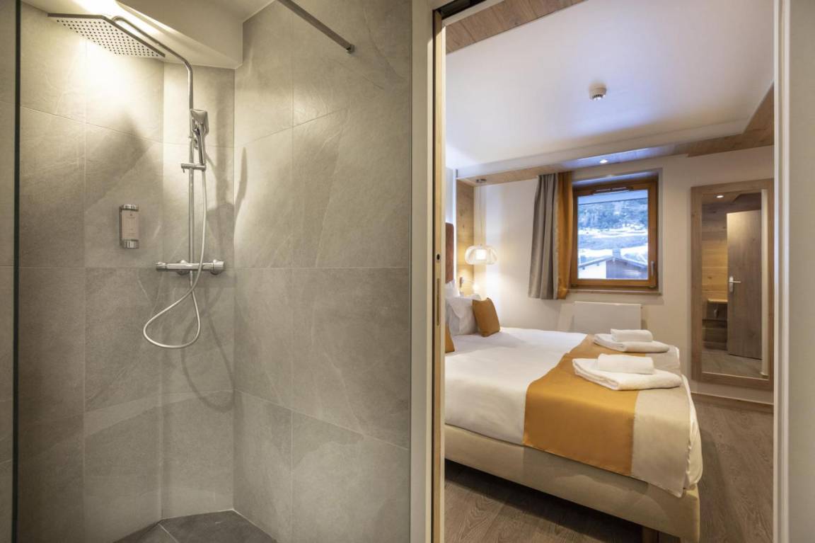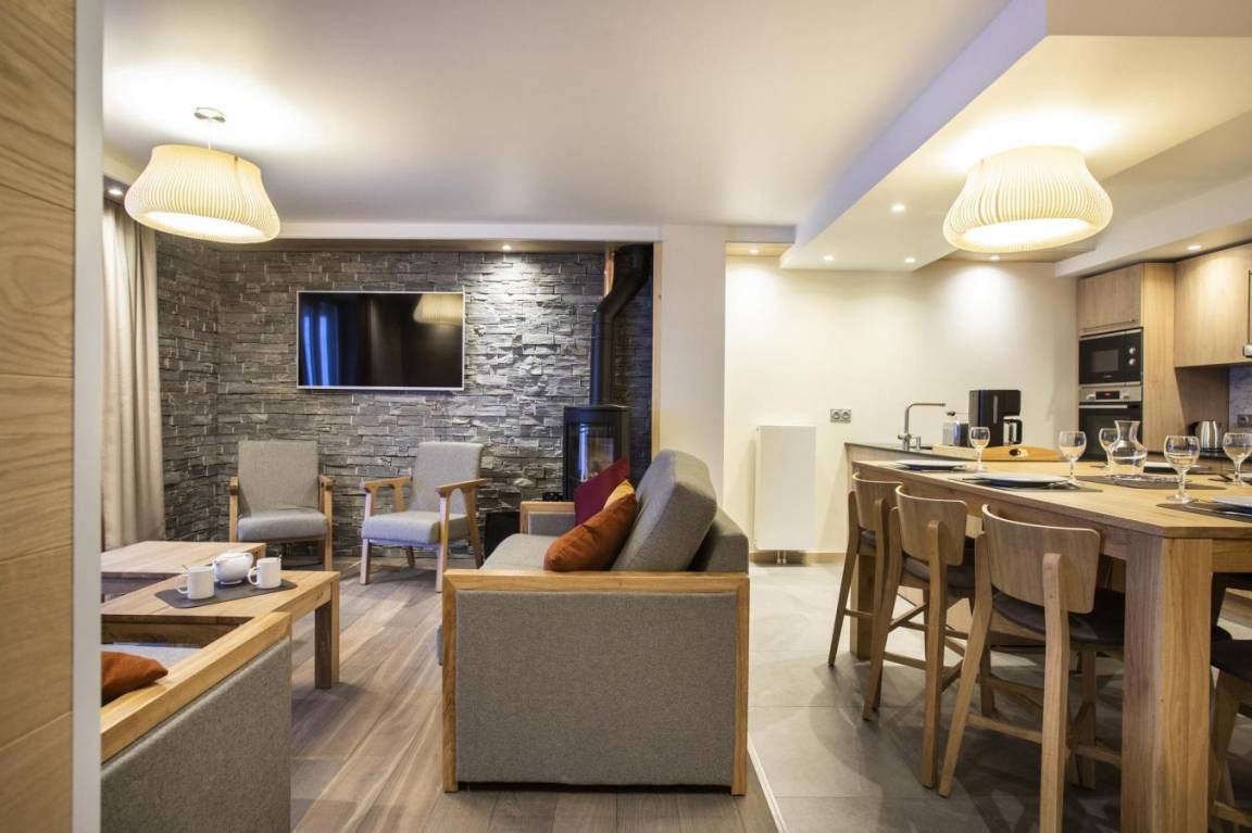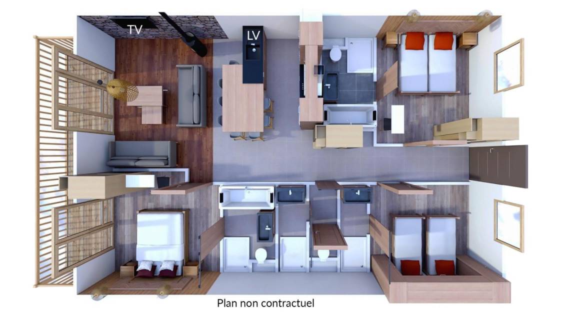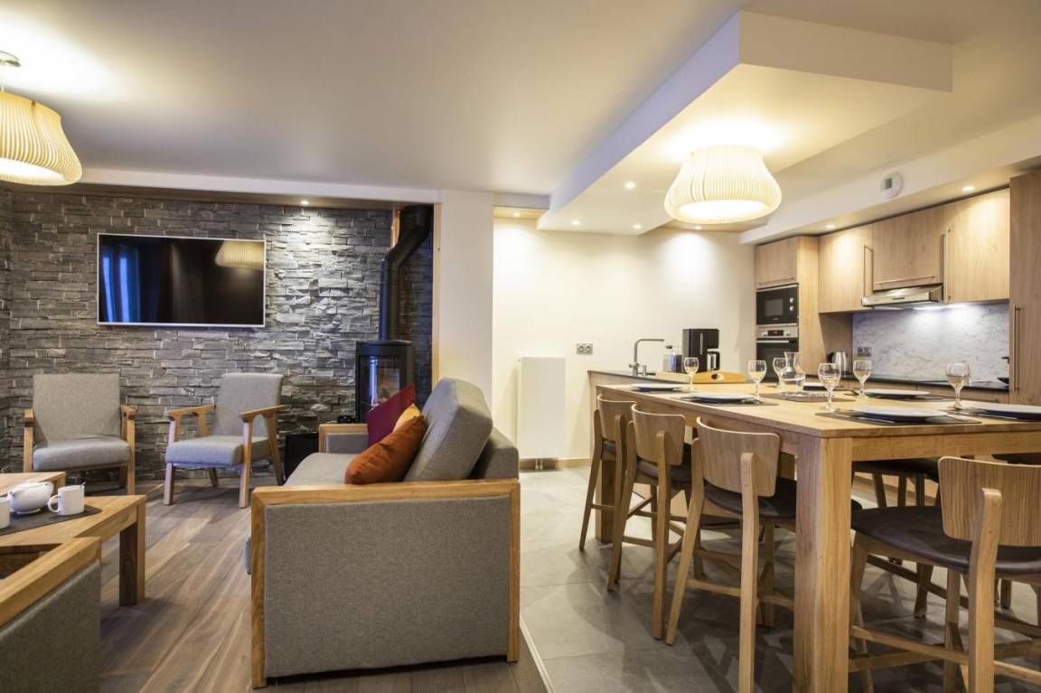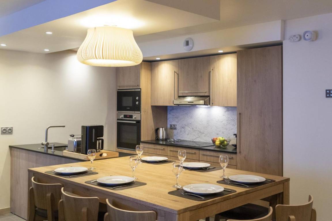 Fläche von ungefähr 93 m². Wohnzimmer mit Klappschlafcouch, Schwedenofen. Schlafzimmer mit Badewanne, Dusche, Doppelbett, WC. Schlafzimmer mit Badewanne, Dusche, 2 zwei Einzelbetten, WC. Schlafzimmer mit Dusche, 2 zwei Einzelbetten. Kochnische mit Fonduegerät, Raclettegerät, Wasserkocher, 2 Kaffeemaschinen (filtre et Nespresso Magimix), , Multifunktions-Backofen, Toaster, Geschirrspülmaschine, Mikrowellenherd, Induktionsherdplatten, Kühl-Gefrier-Kombination. Waschräume mit italienische Duschkabine. separates WC. Balkon.