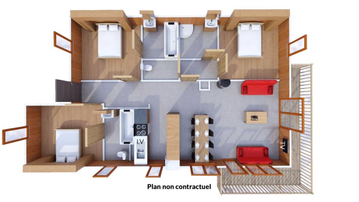 Fläche von ungefähr 72 m². Einige als Maisonette. Wohnzimmer mit Ausziehschlafcouch für 2 Personen. Schlafzimmer mit Doppelbett. 2 Schlafzimmer mit 2 Einzelbetten. Küche mit Wasserkocher, Kaffeemaschine (filtre), Backofen, Toaster, Geschirrspülmaschine, Mikrowellenherd, Glaskeramikkochfelder, Kühl-Gefrier-Kombination. 2 Badezimmer mit Badewanne mit Whirlpoolfunktion. Waschräume mit Dusche. 2 separate WCs. Balkon.