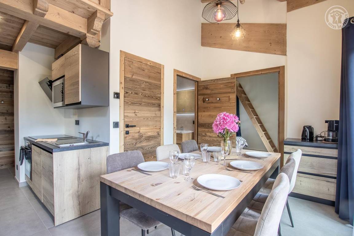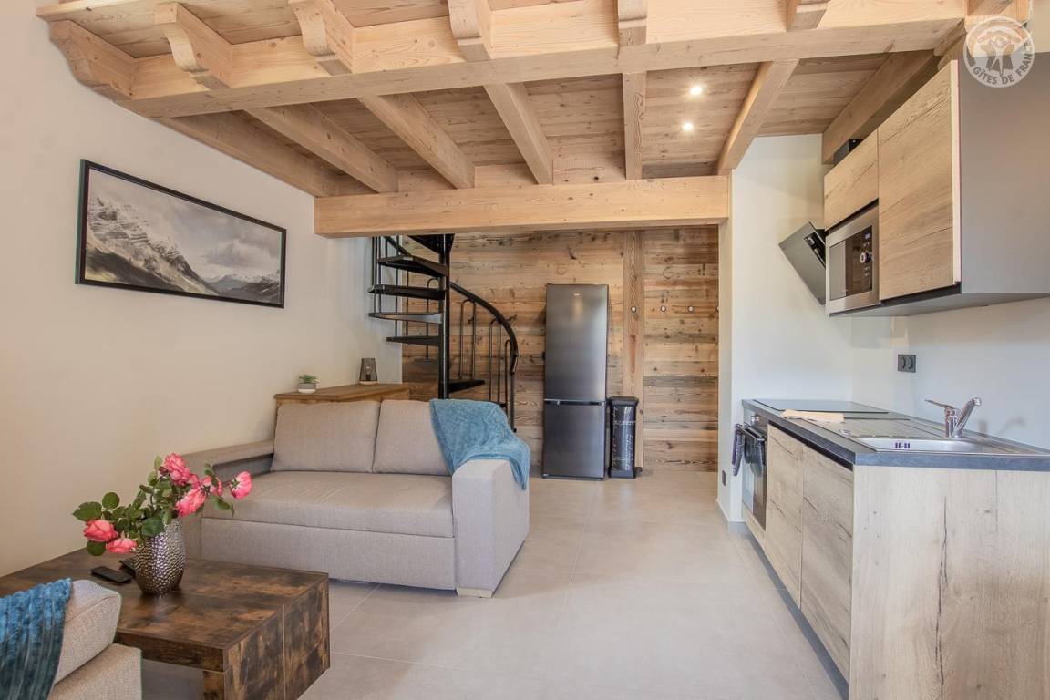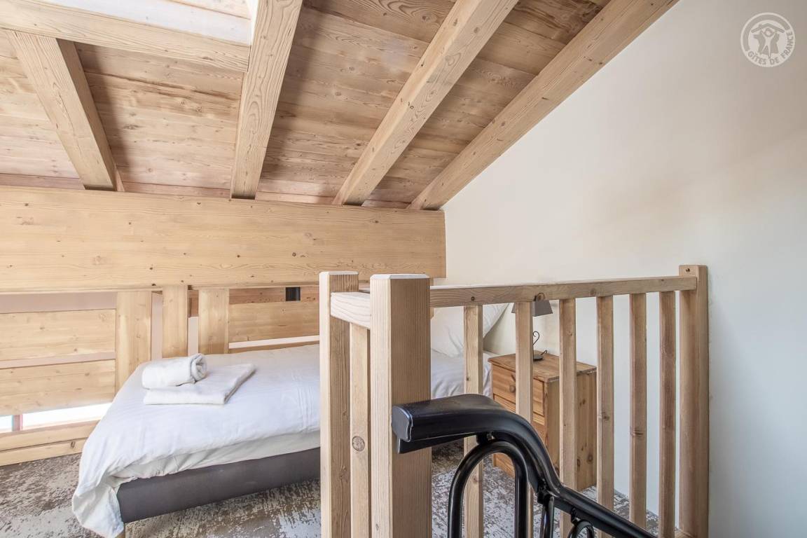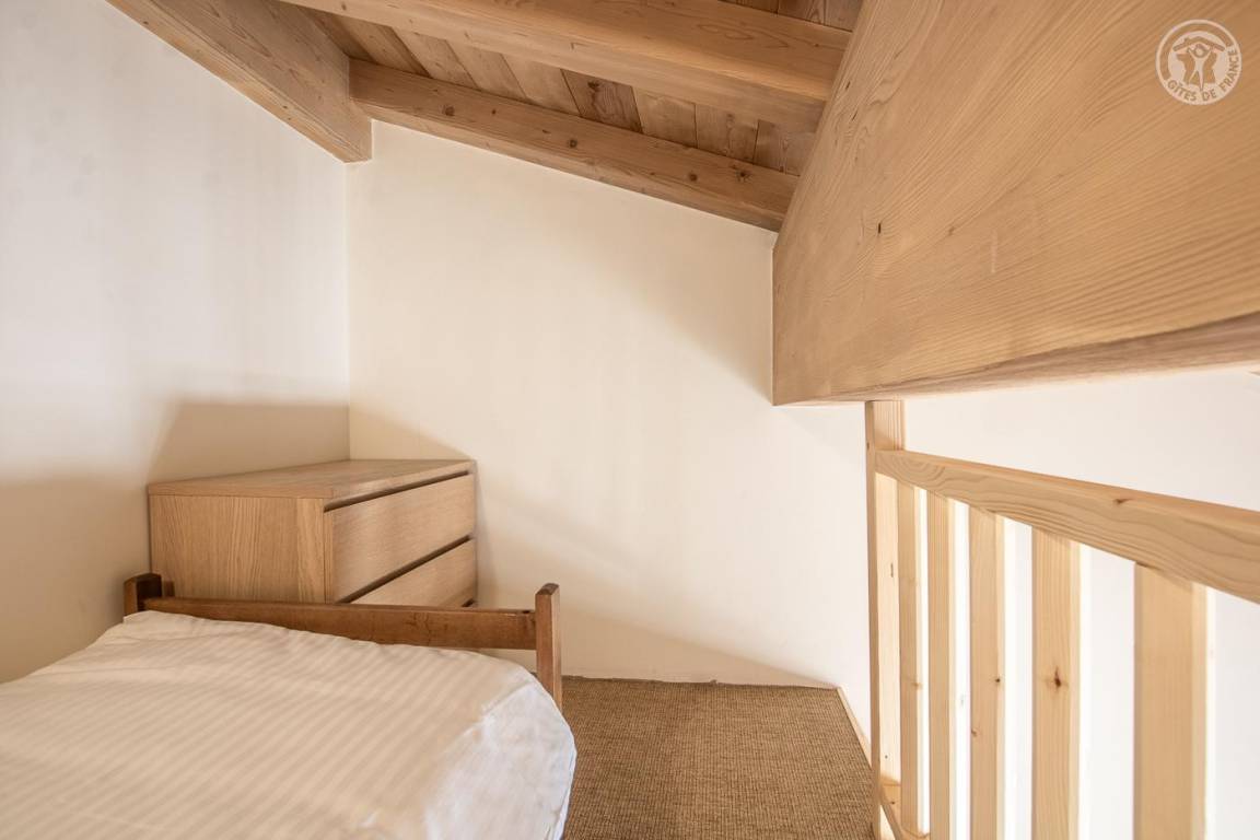 Maisonette-Ferienhaus im 1. Stock des Hauses mit einem Wohn-/Küchenbereich (Soundbar), 1 Schlafzimmer (1 Doppelbett 160 x 200 cm) mit Zugang zu einem Balkon und einem Zwischengeschoss unter dem Hang (1 Einzelbett 90 x 190 cm – Zugang). über eine steile Treppe, nicht für Kinder unter 6 Jahren geeignet), ein Badezimmer (Dusche), separates WC. Im Obergeschoss gelangt man über eine Wendeltreppe in ein Zwischengeschoss mit leerem Wohnzimmer (3 Einzelbetten 90x190 cm, davon 2 Etagenbetten – Waschbecken). Gesamtnutzfläche: 64 m² inklusive Dachgeschossflächen. Balkonterrasse mit Gartenmöbeln. Gemeinsamer Waschraum mit einer anderen Gîte (Waschmaschine und Trockner) draußen auf der Gartenebene. Kostenlose Gemeinschaftssauna im Erdgeschoss des Hauses (Zugangsbedingungen, kontaktieren Sie den Eigentümer)