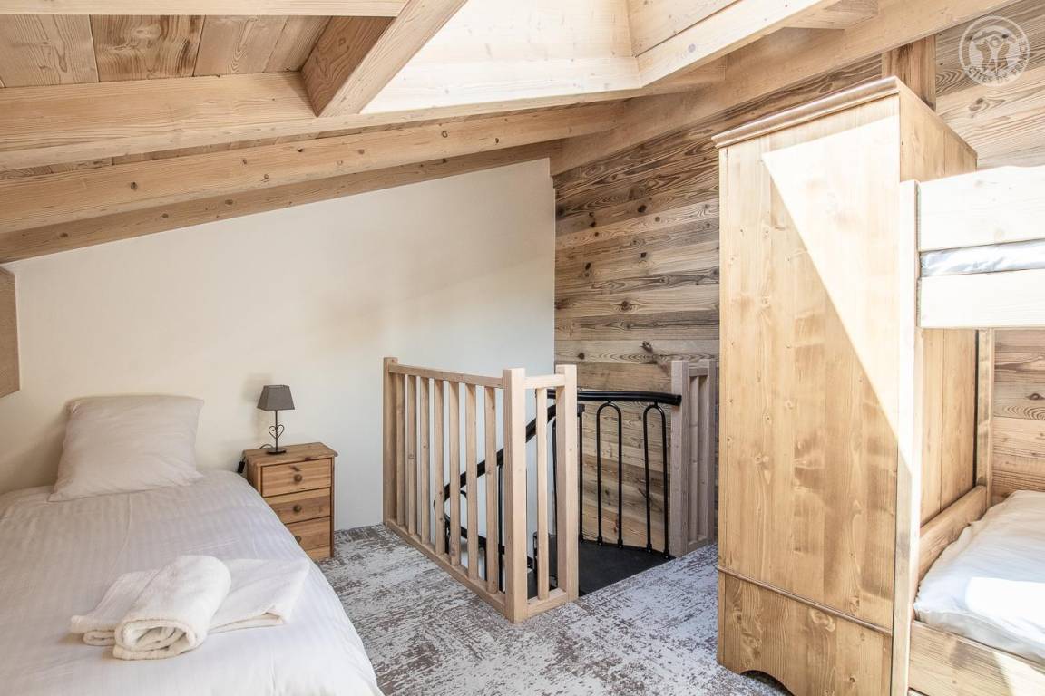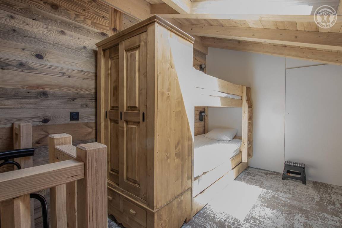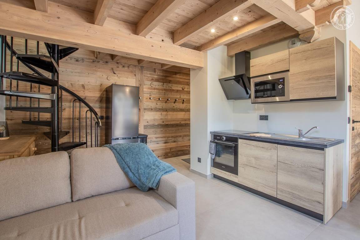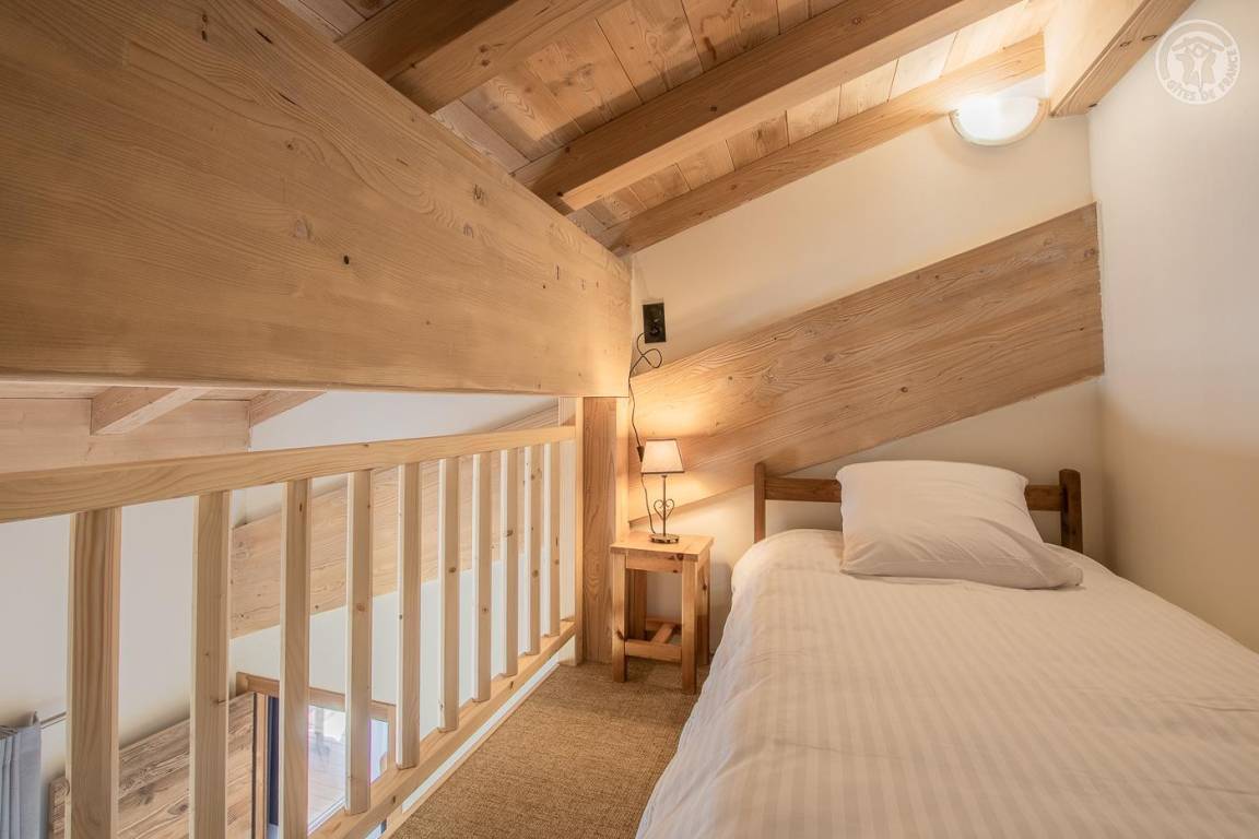Maisonette-Ferienhaus im 1. Stock des Hauses mit einem Wohn-/Küchenbereich (Soundbar), 1 Schlafzimmer (1 Doppelbett 160 x 200 cm) mit Zugang zu einem Balkon und einem Zwischengeschoss unter dem Hang (1 Einzelbett 90 x 190 cm – Zugang). über eine steile Treppe, nicht für Kinder unter 6 Jahren geeignet), ein Badezimmer (Dusche), separates WC. Im Obergeschoss gelangt man über eine Wendeltreppe in ein Zwischengeschoss mit leerem Wohnzimmer (3 Einzelbetten 90x190 cm, davon 2 Etagenbetten – Waschbecken). Gesamtnutzfläche: 64 m² inklusive Dachgeschossflächen. Balkonterrasse mit Gartenmöbeln. Gemeinsamer Waschraum mit einer anderen Gîte (Waschmaschine und Trockner) draußen auf der Gartenebene. Kostenlose Gemeinschaftssauna im Erdgeschoss des Hauses (Zugangsbedingungen, kontaktieren Sie den Eigentümer)