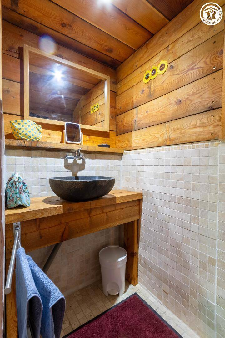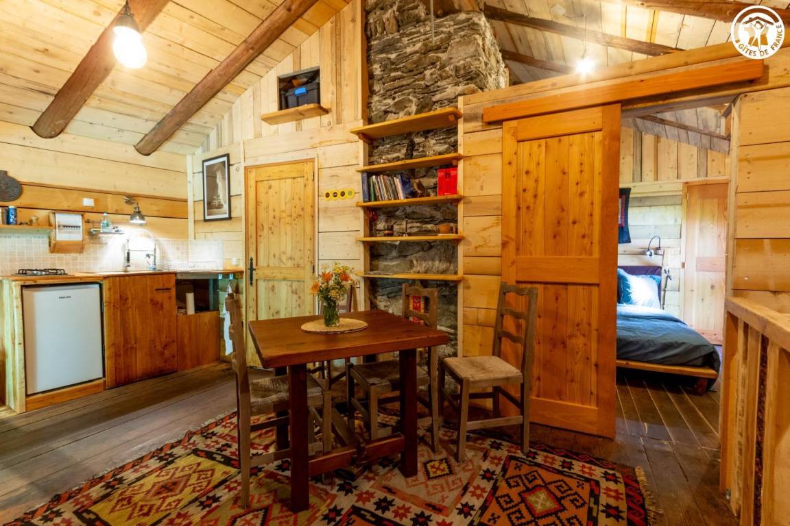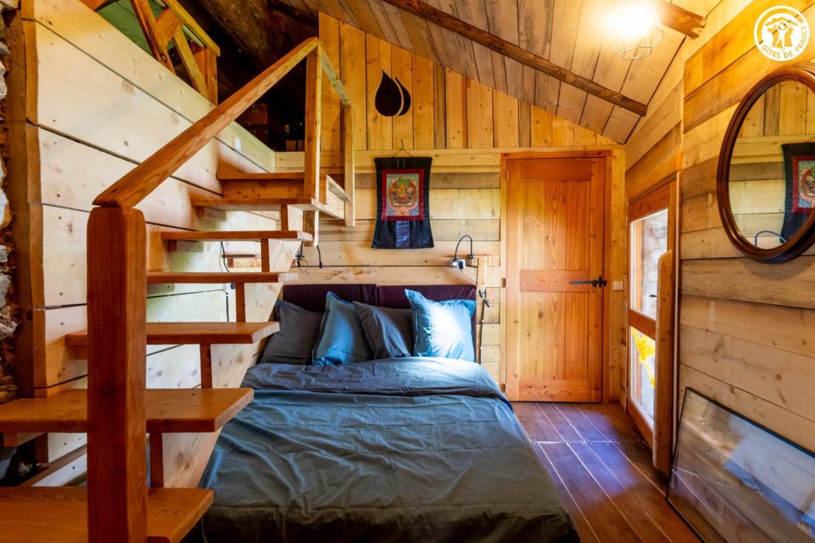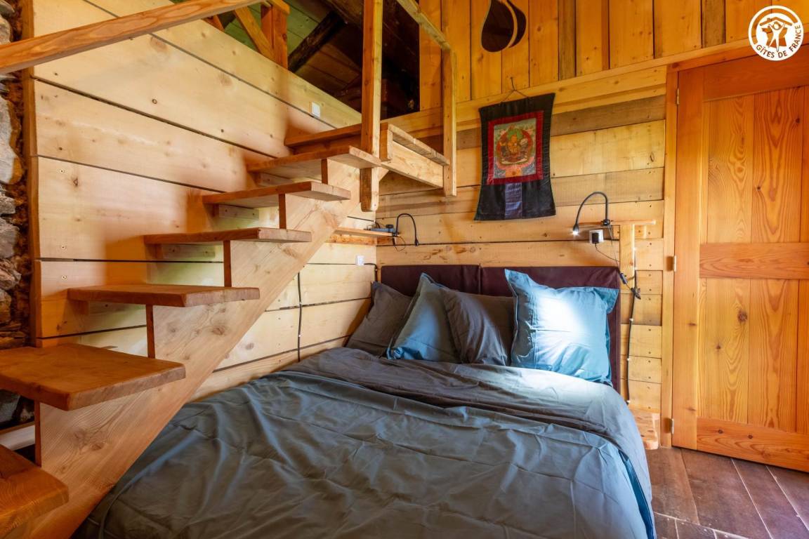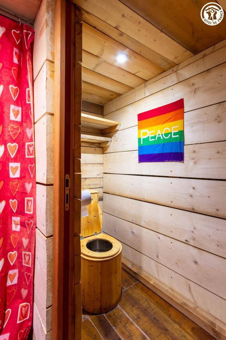 Freistehendes Chalet auf 2 Ebenen am Berghang (nicht empfohlen für Kinder unter 16 Jahren) mit Gartenebene: Wohnküche mit Sitzecke, Doppelbett (160 x 200 cm) auf Podest, Badezimmer (ebenerdige Dusche mit Duschkopf und Handbrause), Trockentoilette. 1. Stock (oder Erdgeschoss bei Zugang von außen über den Weg): Essbereich mit Pelletofen und Küchenbereich, ideal zum Frühstücken (ausgestattet mit kleinem Kühlschrank, 2 Gasbrennern), Schlafzimmer (1 Doppelbett 160 x 200 cm), Badezimmer (Dusche und geschlossene Toilette). Bettwäsche und Handtücher sind inklusive, die Betten sind bei der Ankunft bezogen. Unabhängige und schattige Holzterrasse, nicht an das Chalet angrenzend. Gartenmöbel. Schwimmen (von Juni bis September je nach Wetterlage) in einem sonnenbeheizten Pool mit Pflanzenfilterung (Seerosen und Schilf), 2 m tief.