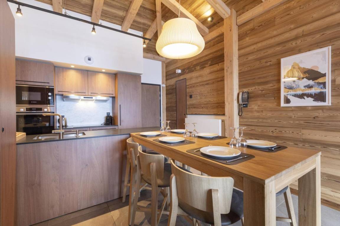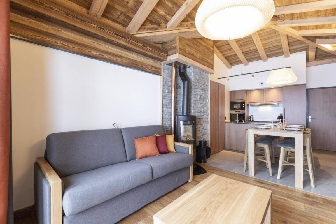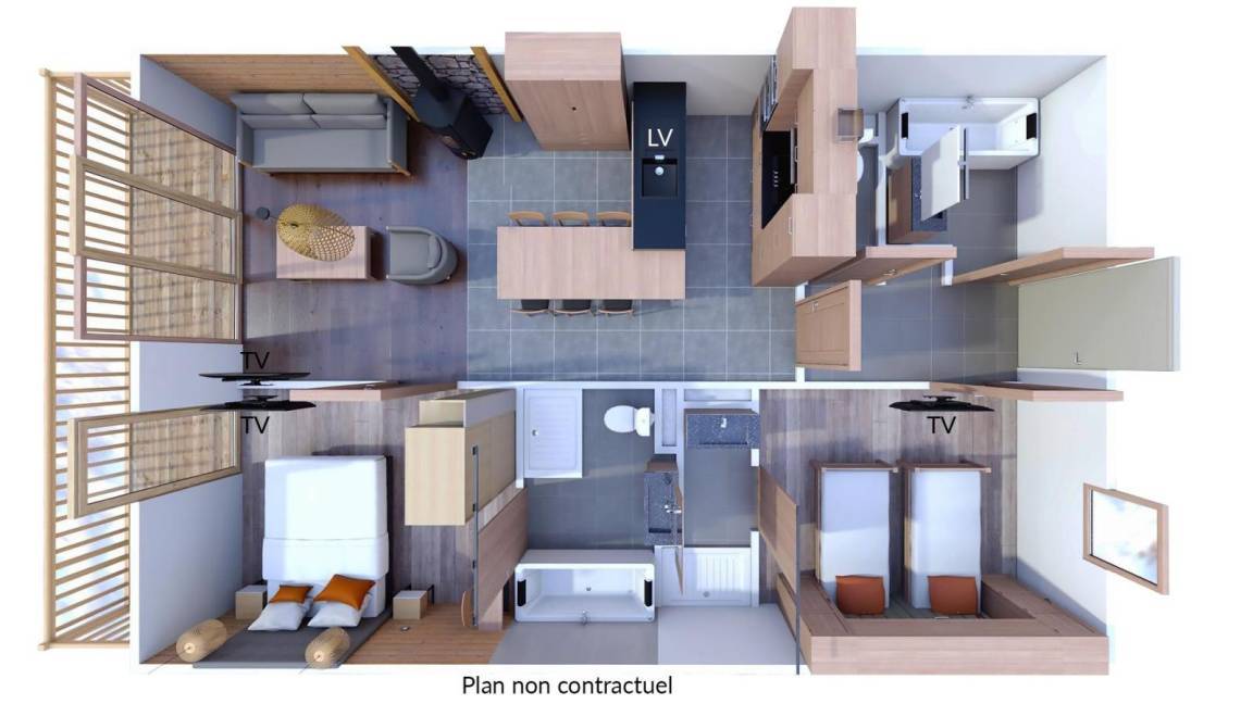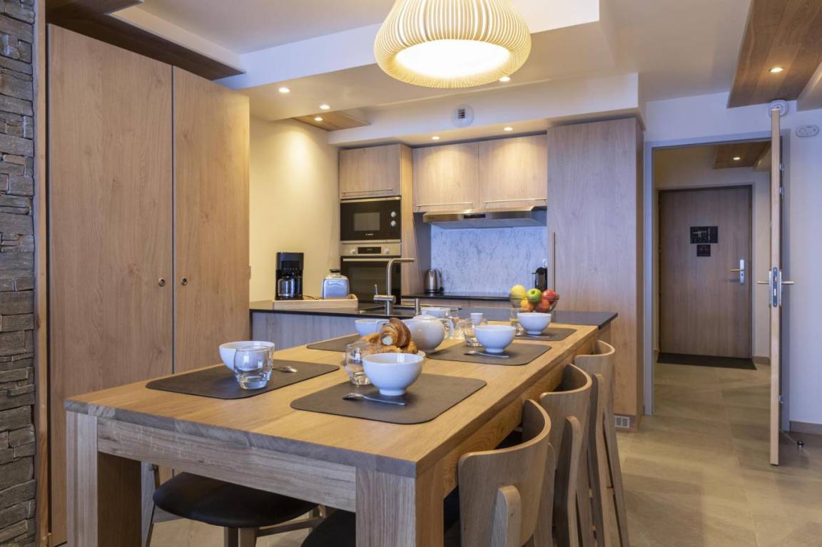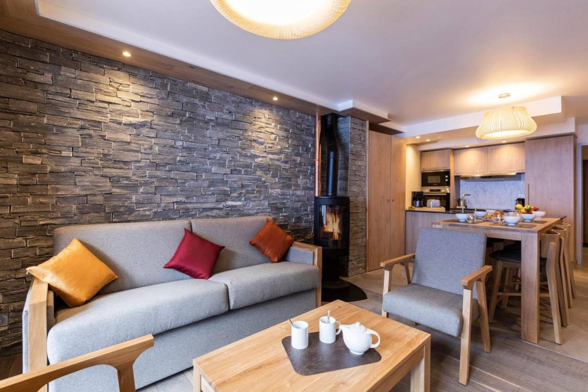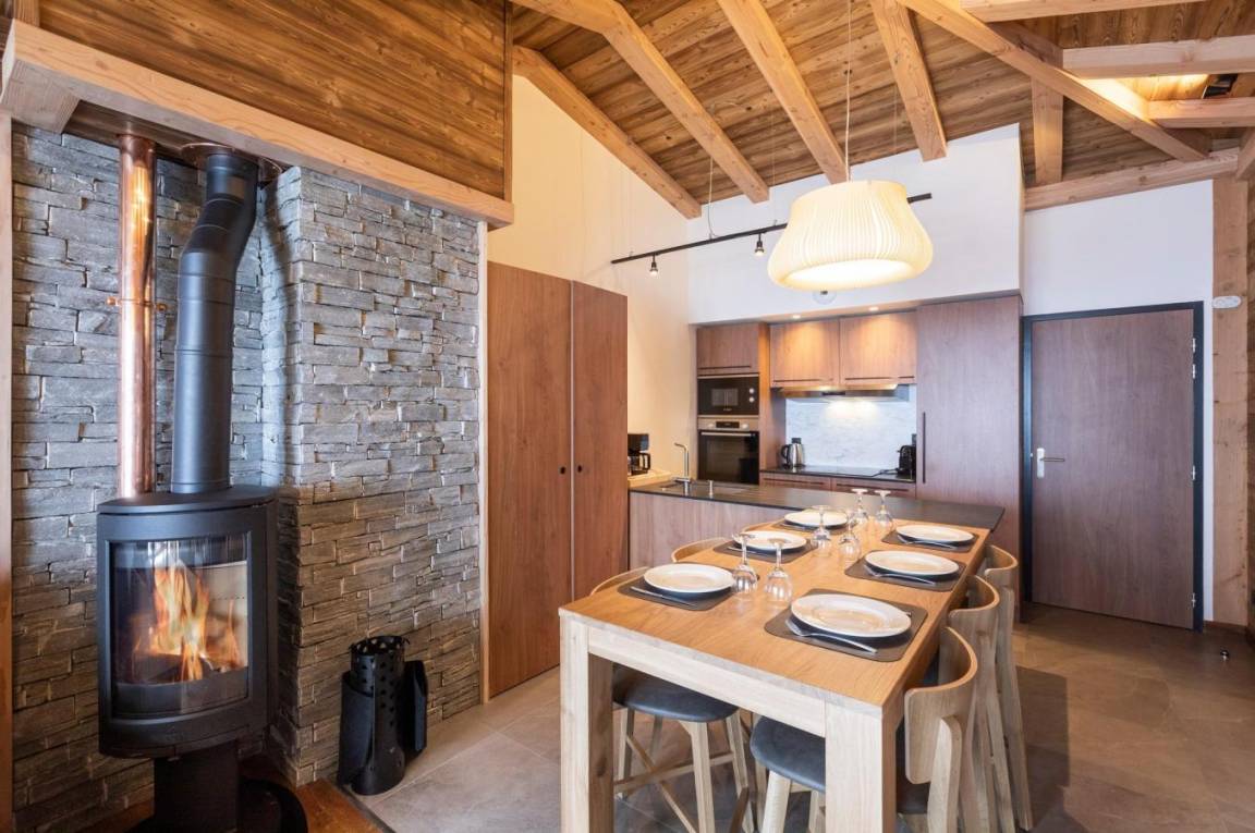 Fläche von ungefähr 65 m². Wohnzimmer mit Klappschlafcouch, Schwedenofen. Schlafzimmer mit Badewanne, Dusche, Doppelbett, WC. Schlafzimmer mit Dusche, 2 zwei Einzelbetten. Kochnische mit Fonduegerät, Raclettegerät, Wasserkocher, 2 Kaffeemaschinen (filtre et Nespresso Magimix), , Multifunktions-Backofen, Toaster, Geschirrspülmaschine, Mikrowellenherd, Induktionsherdplatten, Kühl-Gefrier-Kombination. Badezimmer mit Badewanne, WC. separates WC. Balkon.
