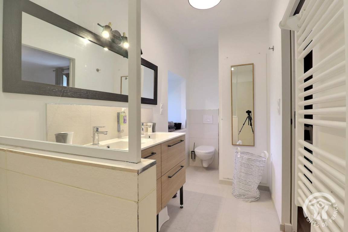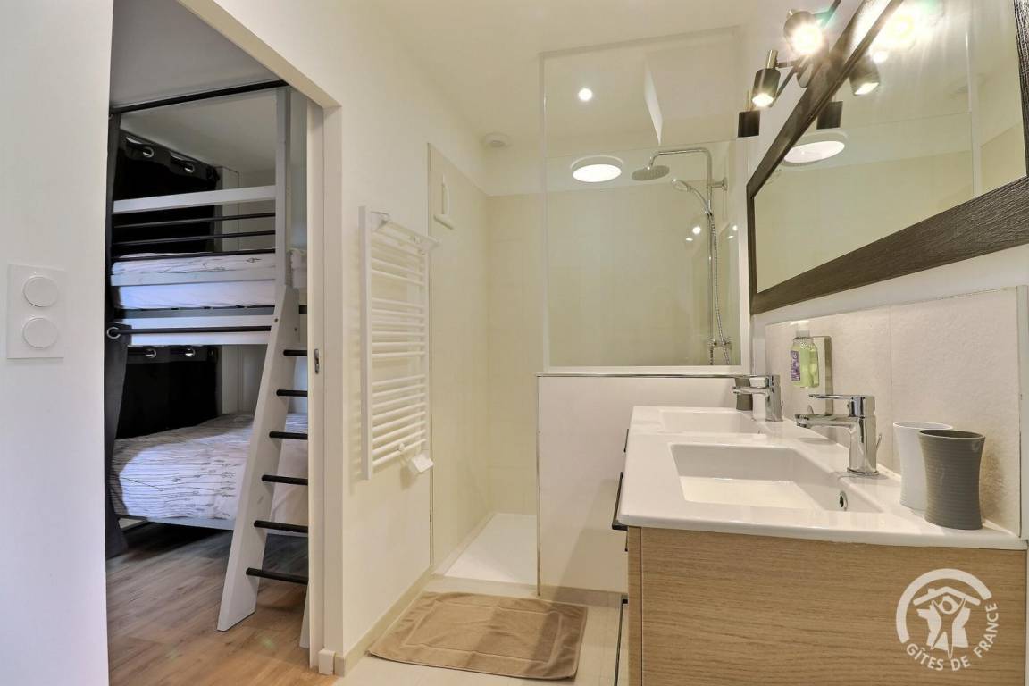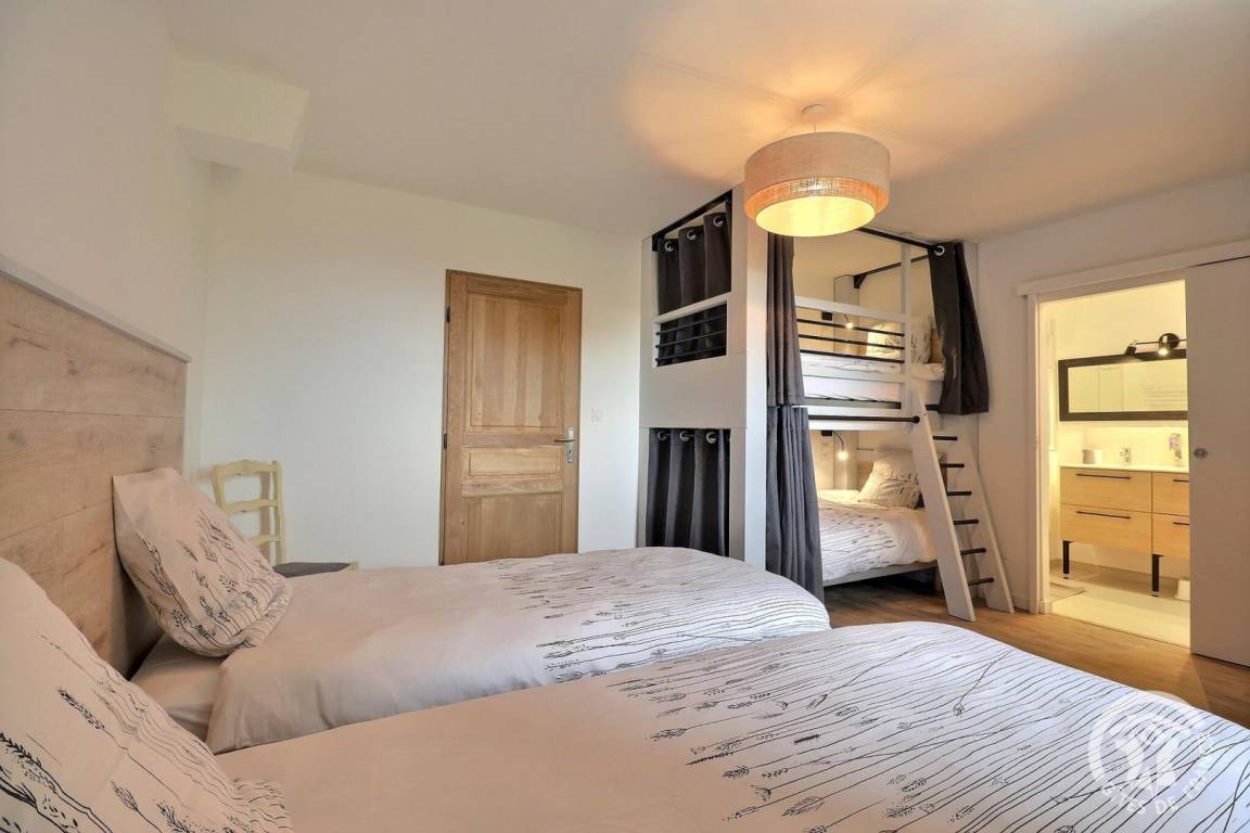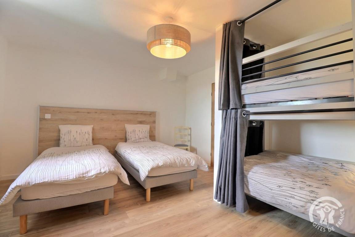 - ein Schlafzimmer mit zwei 90X200-Betten, die auf Anfrage in ein 180X200-Doppelbett umgewandelt werden können, zwei 90X200-Etagenbetten und einem privaten Badezimmer mit WC