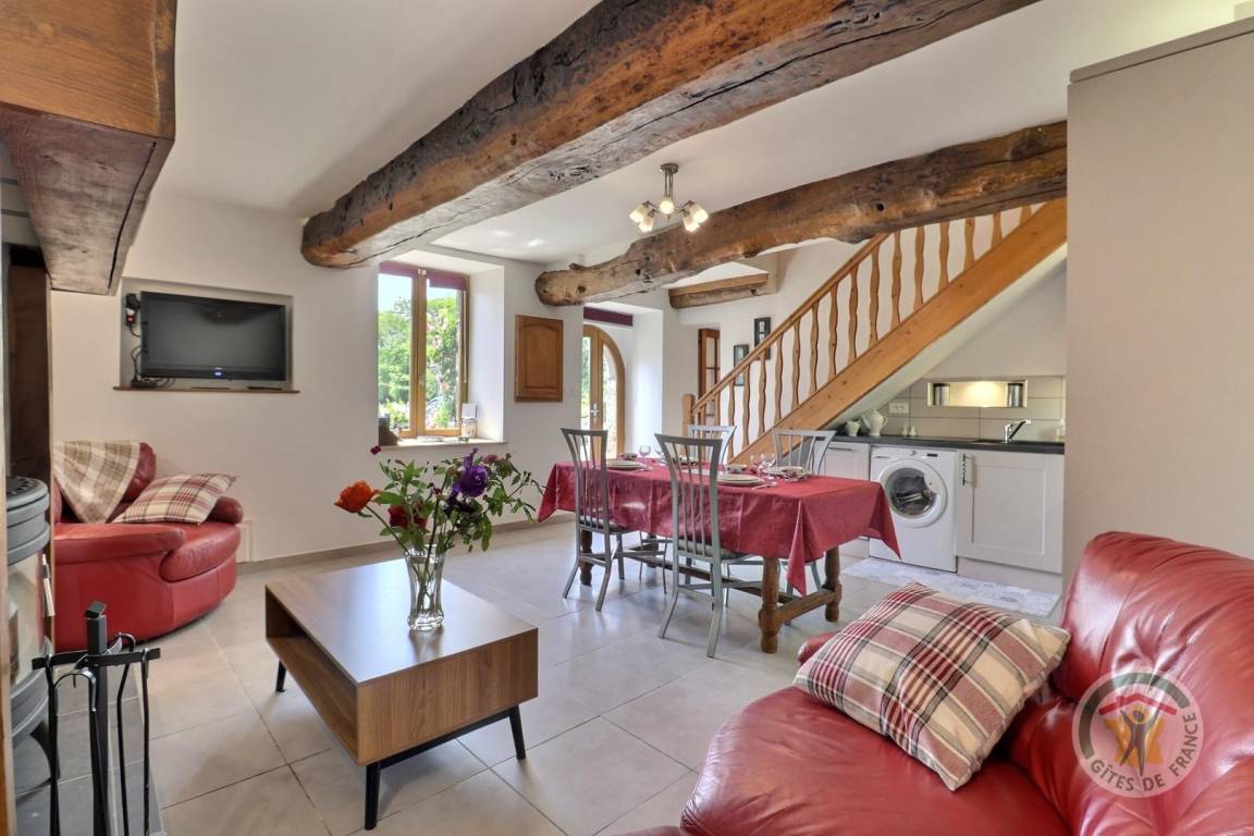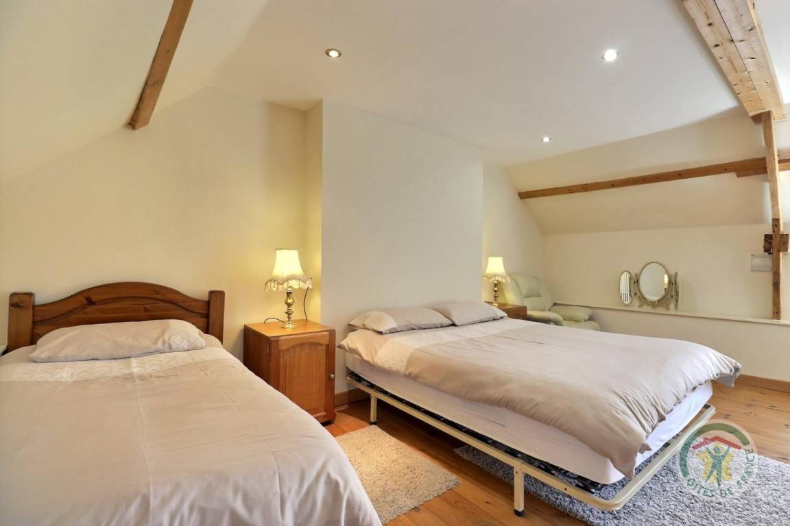Im Erdgeschoss: ein Wohnzimmer mit Küche, Essbereich und ein Wohnzimmer mit Holzofen, ein Vorraum und ein Badezimmer mit Dusche, Badewanne und WC. Im Obergeschoss: ein Schlafzimmer mit einem 160x200-Bett und einem 90x190-Bett für ein 5. Zusatzbett auf Anfrage und ein Schlafzimmer mit einem 140x190-Bett. Parkplatz auf dem Grundstück.