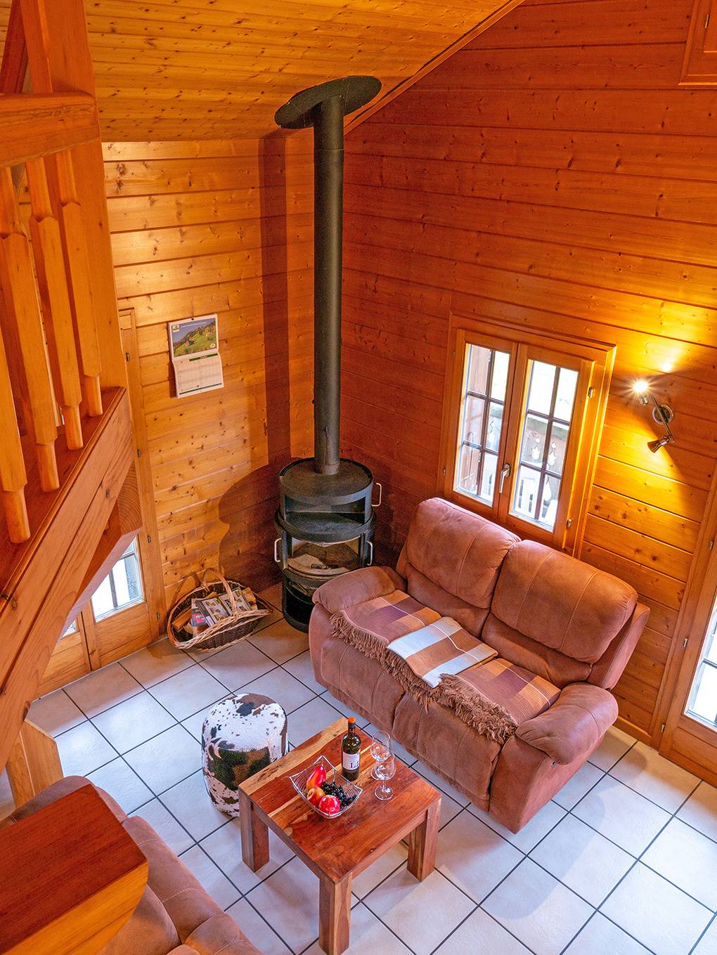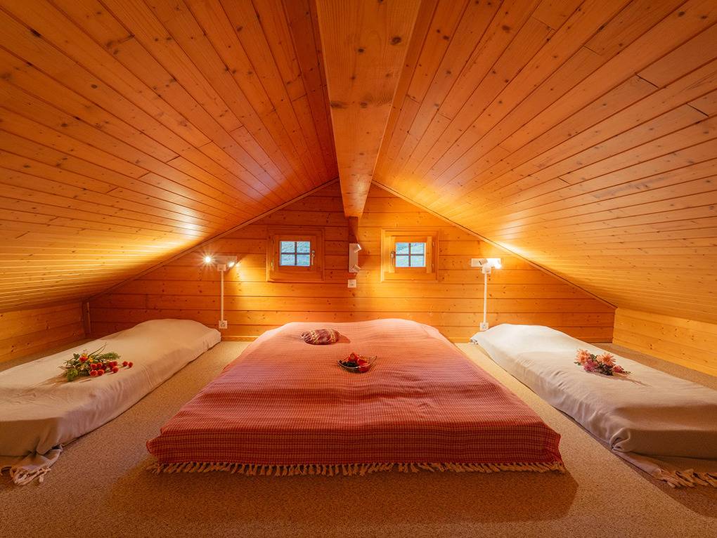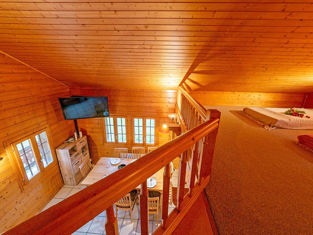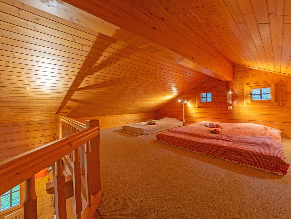 1. Etage: Geräumiger, bis zum Dachgiebel ausgebauter Wohnraum (40 qm) mit Schwedenofen, Sitzgruppe, Esstisch, thekenartig abgetrennter Küche (Backofen). Separates WC. Vom Wohnraum Treppe auf die offene Galerie mit 4 Einzelmatratzen (starke Dachschräge).