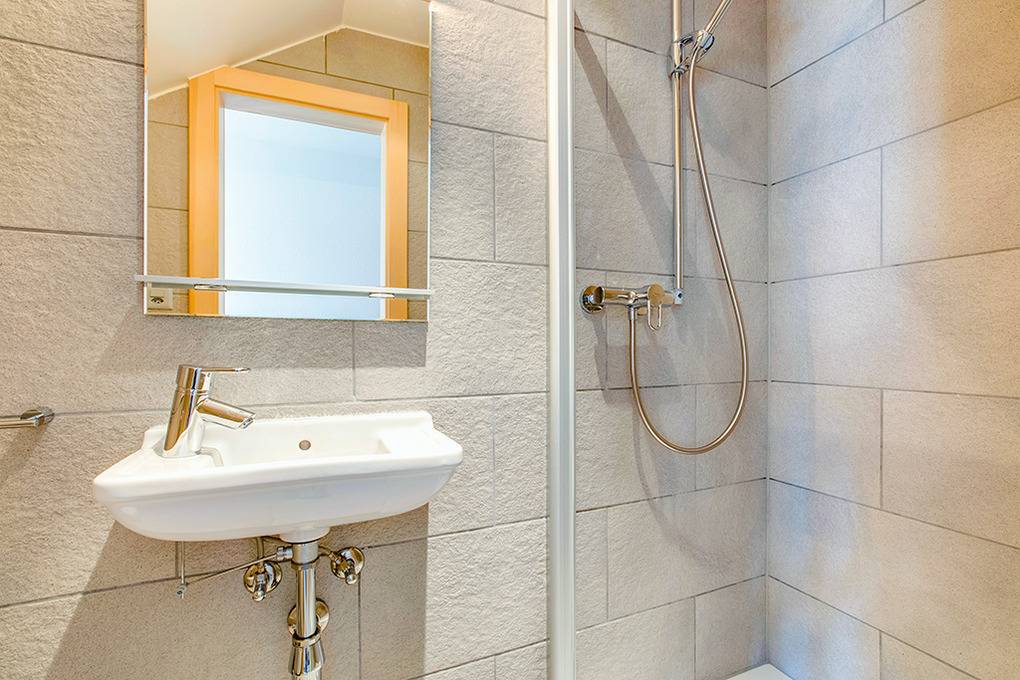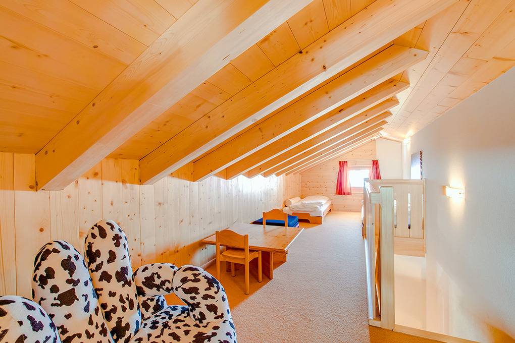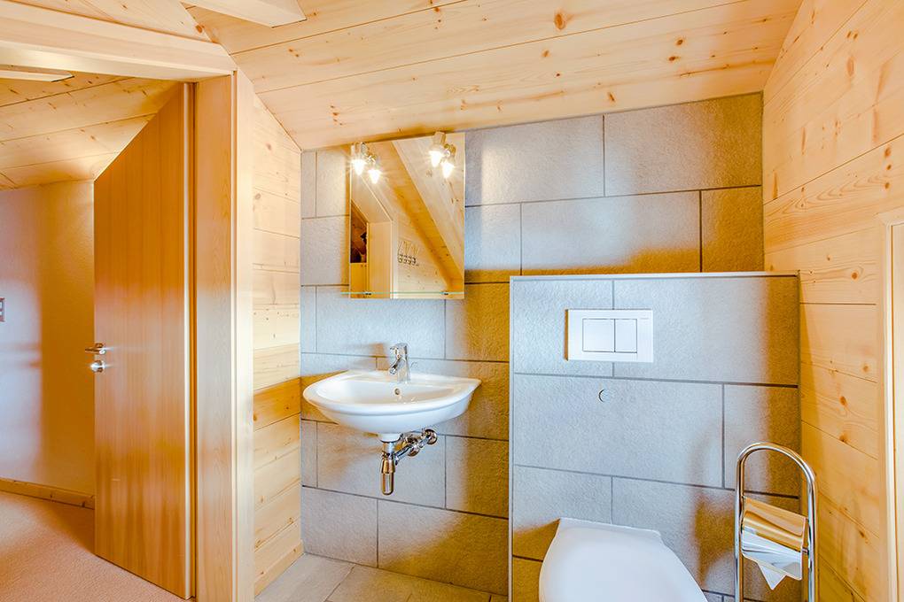 Dachgeschoss mit Schrägen: 2-Bettzimmer auf hübscher Galerie, offen zum Flur. Separates WC, Wb.
