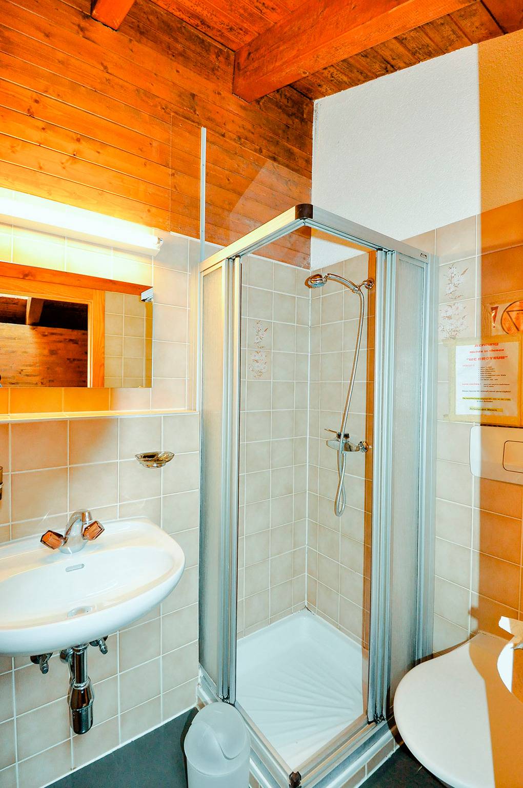 CH 431.65 Wohnungen 6-8 Pers.: 4-Zimmerwohnung, 113 qm Wohnfläche über 2 Etagen. 3. Etage: Großer, bis zum Dachgiebel ausgebauter Wohnraum mit Sitzgruppe, TV, Radio/CD, Esstisch, Küchenzeile (Backofen, Mikrowelle, Spülmaschine). Doppelzimmer. Bad: Bw/Du, Wb, WC. Vom Wohnraum Treppe ins Dachgeschoss (Schrägen): Schlafraum mit 2 Einzelbetten auf Galerie, offen zum Wohnraum. Doppelzimmer. 2-Bettzimmer. Bad: Du, Wb, WC. Süd-Balkon.