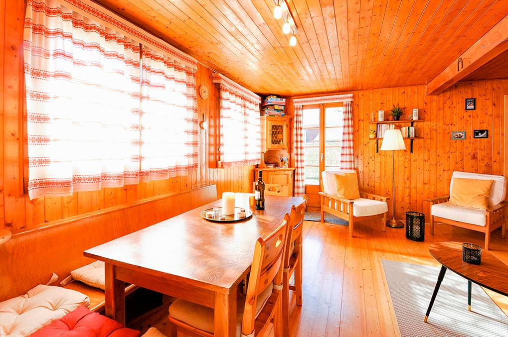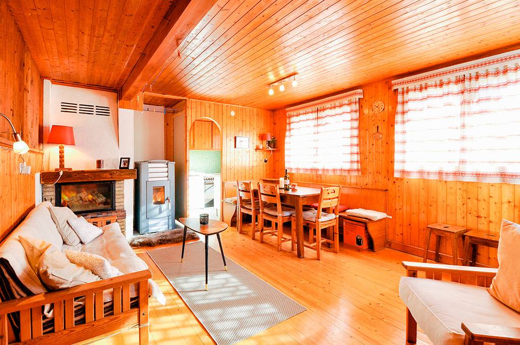 Haus: Uriges Holz-Chalet mit Kamin. 5-Zimmer-Haus mit 80 qm Wohnfläche über 2 Etagen. Gemütlich-rustikale Einrichtung, komplett holzvertäfelt. Internetzugang über W-Lan. Nichtraucherhaus. Terrasse mit Sitzmöbeln, Sonnenliegen und Grill, Balkon. Heizung über modernen Pellet-Kaminofen. Warmwasser über 80 l E-Boiler. 2 Pkw-Stellplätze vorhanden. Hinweis: Bitte beachten Sie, dass das Chalet trotz einem zusätzlich ausgeschriebenen Schlafplatz nur mit maximal 6 Personen belegt werden darf.