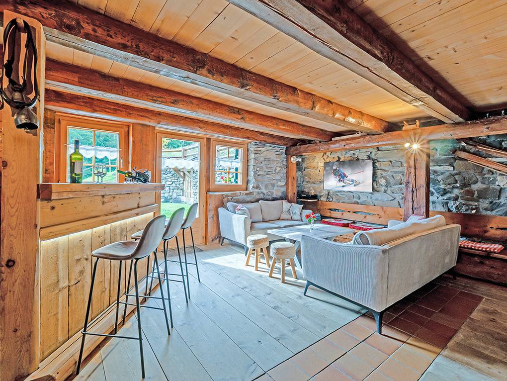 Haus: Sehr schönes Chalet mit Sauna. Großzügiges Walliser Bauernhaus, stilgerecht renoviert und umgebaut zum komfortablen Chalet. 10-Zimmerhaus mit 220 qm Wohnfläche über 2 Etagen. Rustikal-gemütliches Ambiente durch aufwendig restaurierte Natursteinwände und schöne Holzbalkendecken. Internetzugang über W-Lan. Große überdachte Terrasse mit Gartenmöbeln, Grill, schönem Bergblick. Garten in Hanglage. Balkone. Zentralheizung. Warmwasser über 300 l E-Boiler.