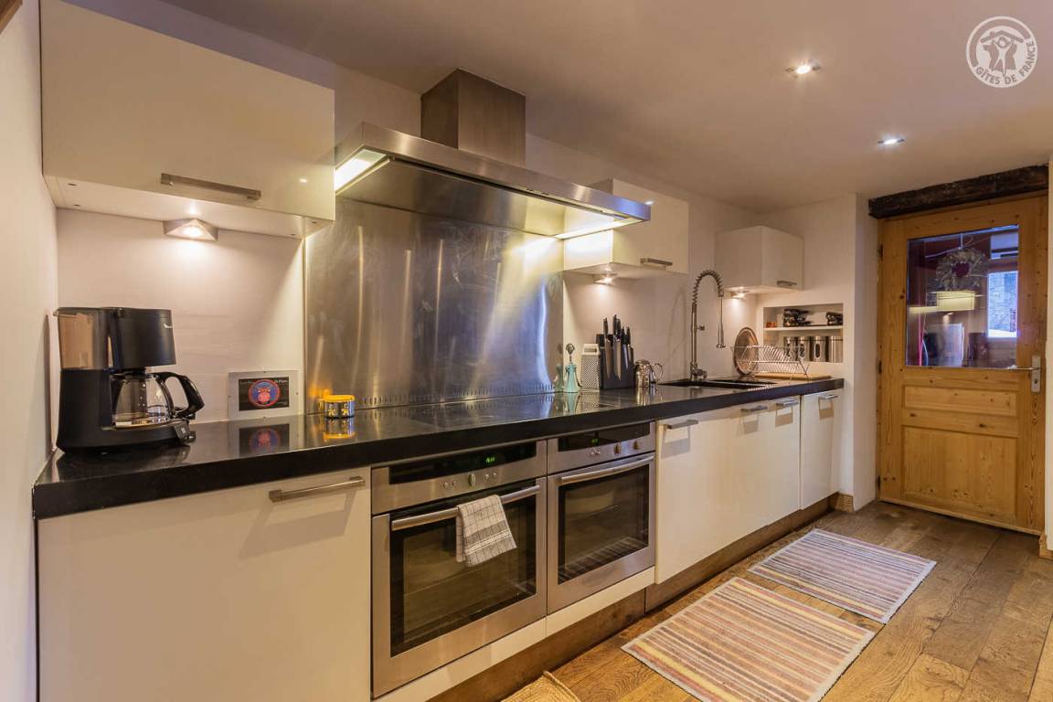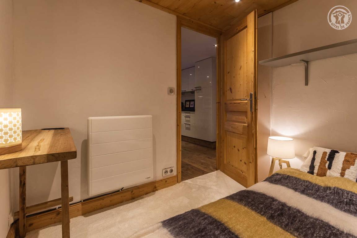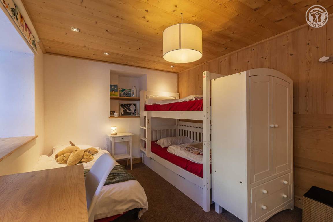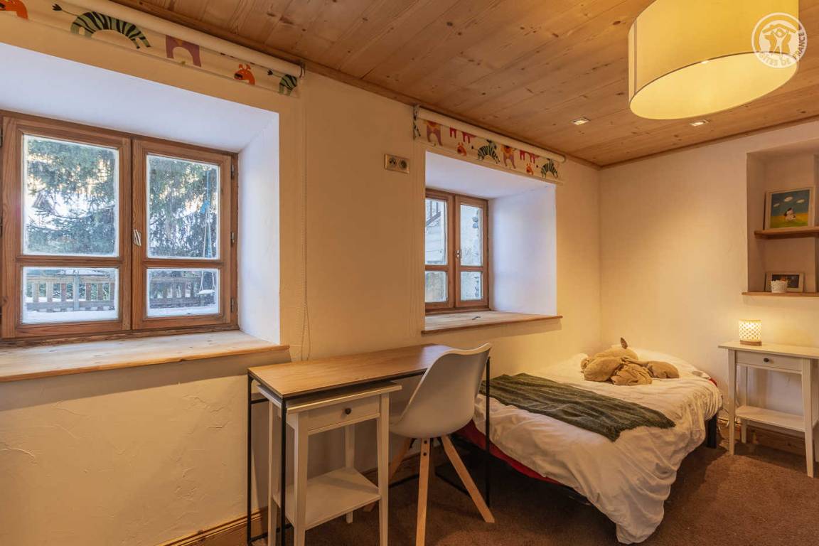 Ferienhaus auf 2 Ebenen mit 2 möglichen und unabhängigen Eingängen (von der Rue du Laisinant über eine Außentreppe oder vom Chemin de la Vanoise), bestehend aus im Erdgeschoss (Seite der Rue du Laisinant): ein Eingang, eine Küche, ein kleines Schlafzimmer ohne Zugang zum außen (1 Einzelbett 120 x 190 cm), 1 Schlafzimmer (3 Einzelbetten 90 x 190 cm, davon 2 Etagenbetten), 1 Schlafzimmer (1 Doppelbett 140 x 190 cm) halbunterirdisch mit Öffnung über ein Fenster und ein Badezimmer mit eigenem Wasser (Dusche und WC) 1. Stock: Wohnzimmer mit Arbeitsbereich (ein zusätzliches Schlafsofa für 2 Personen) mit angeschlossenem Fernseher, ein Kamin (1. Holzflamme angeboten, folgende Flammen zahlbar), eine Halle (Eingang über den Chemin de la Vanoise), ein Wohnzimmer- Wohnküche (Schlafsofa 140 x 190 cm für 2 Personen), Schlafzimmer (1 Doppelbett 140 x 190 cm), Badezimmer (Badewanne), separates WC, Terrasse.