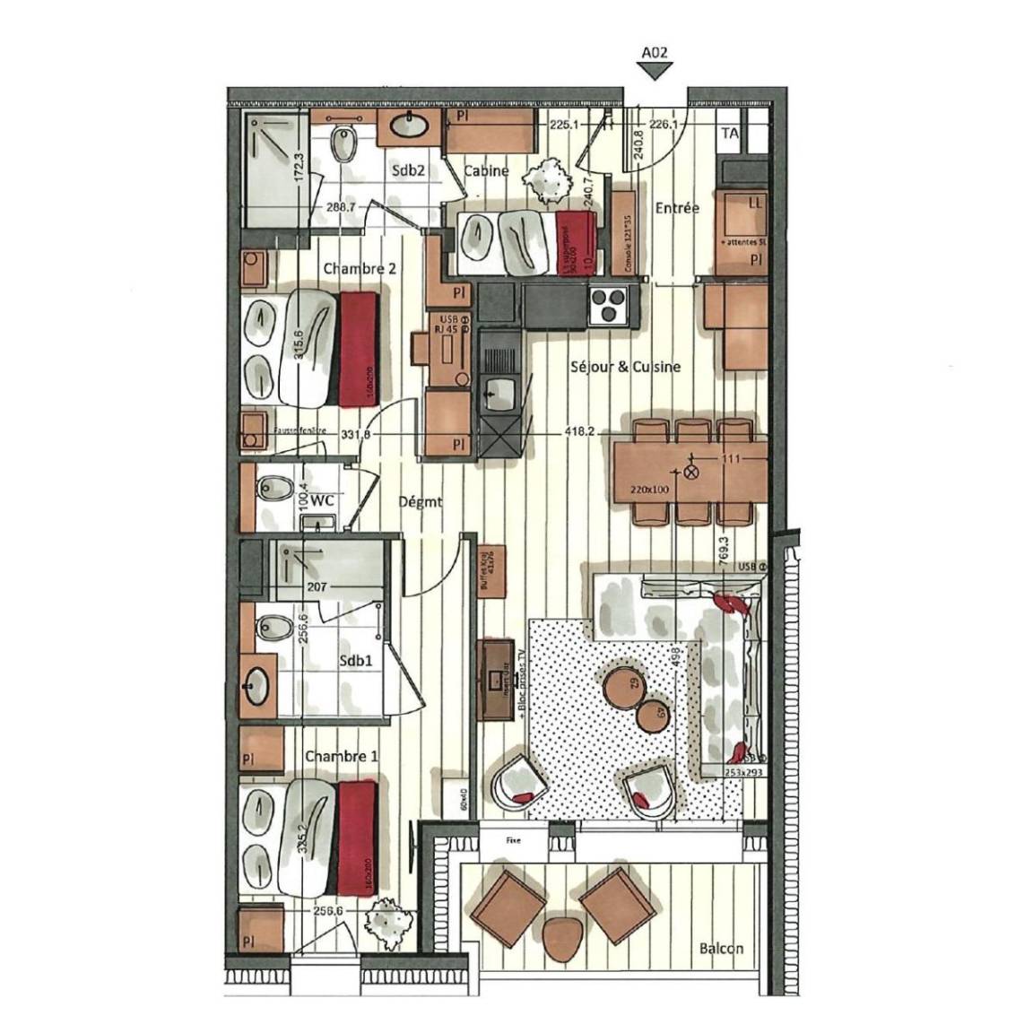 Entdecken Sie die Residenz Vail Lodge und ihre außergewöhnlichen Apartments im Viertel Legettaz am Ende der Pisten „Santons" und „Epaule du Charvet" mit direktem Skizugang zur Schneefront und der Abfahrt der Skilifte Solaise und Bellevarde. Fläche von ungefähr 85 m². Erdgeschoss. Orientierung : West. Diele mit Waschmaschine. Wohnzimmer mit Sofa, Ethanol-Kamin, TV. Schlafzimmer mit Doppelbett, , Haartrockner, Handtuchtrockner, WC. Schlafzimmer mit Doppelbett. offener Schlafbereich mit 2 Stockbetten. Küche mit Wasserkocher, Kaffeemaschine (nespresso), Backofen, Toaster, Dunstabzugshaube, Geschirrspülmaschine, 2 Herdplatten, , Kühlschrank. Badezimmer mit Haartrockner, Handtuchtrockner, WC. separates WC. Balkon. Die oberen Betten sind nicht für Kinder unter 6 Jahren geeignet.