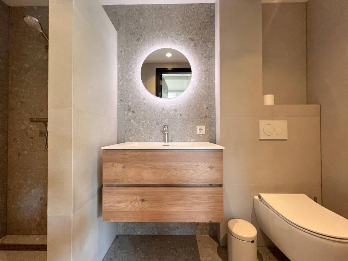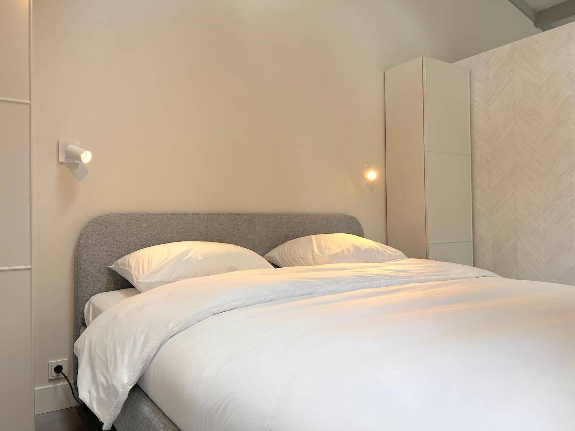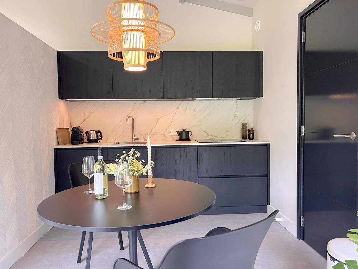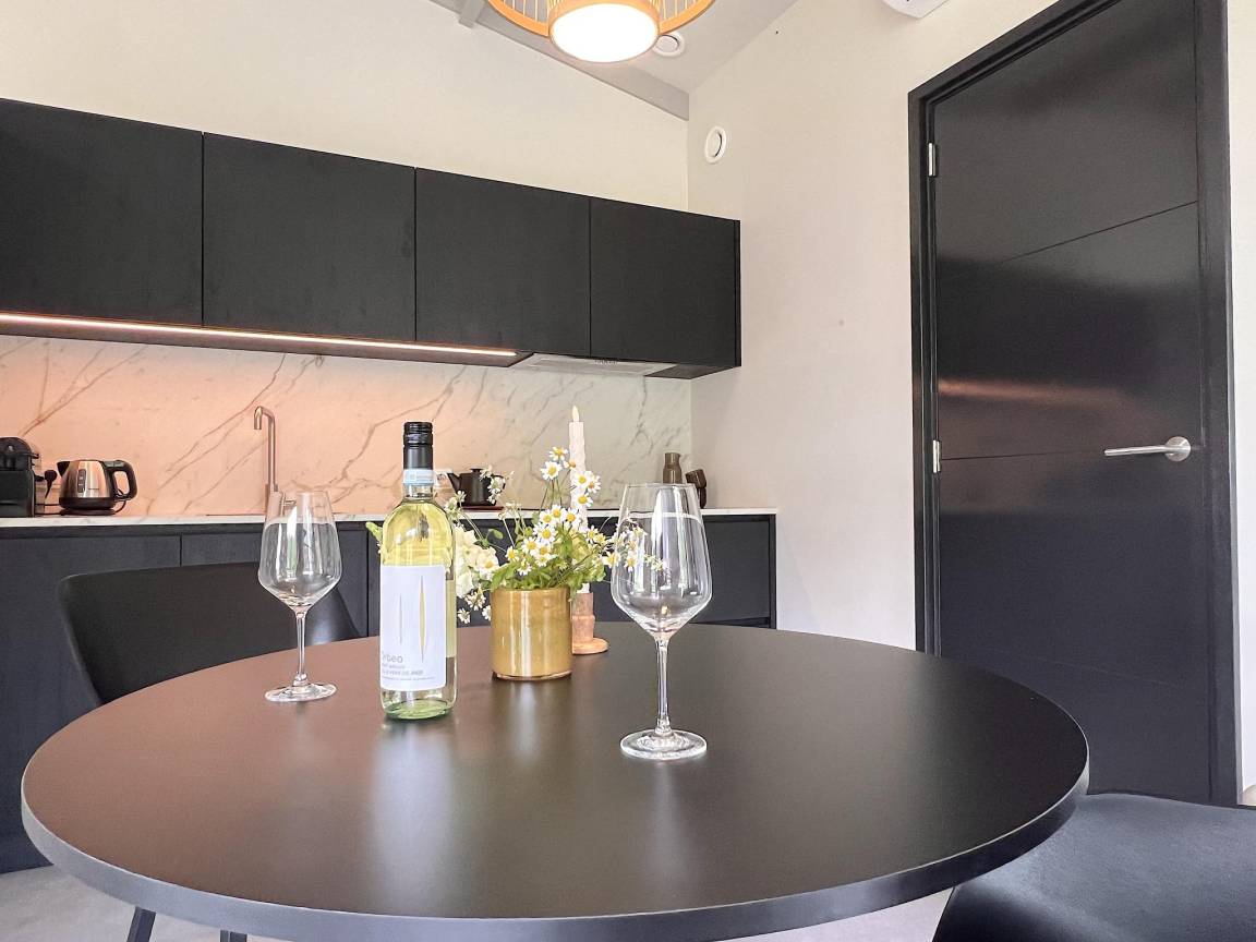 Layout : Parterre: offene Küche mit Wasserkocher, Kochherd(4 Kochplatten, Induktion), Dunstabzugshaube, Kaffeemaschine(nespresso cups), Geschirrspüler, Kühlschrank , Wohn/Esszimmer mit TV, Esstisch, Klimaanlage , Schlafzimmer mit Doppelbett(elektrisch verstellbar, 180 x 210 cm) , Badezimmer mit Dusche, Waschbecken, Toilette