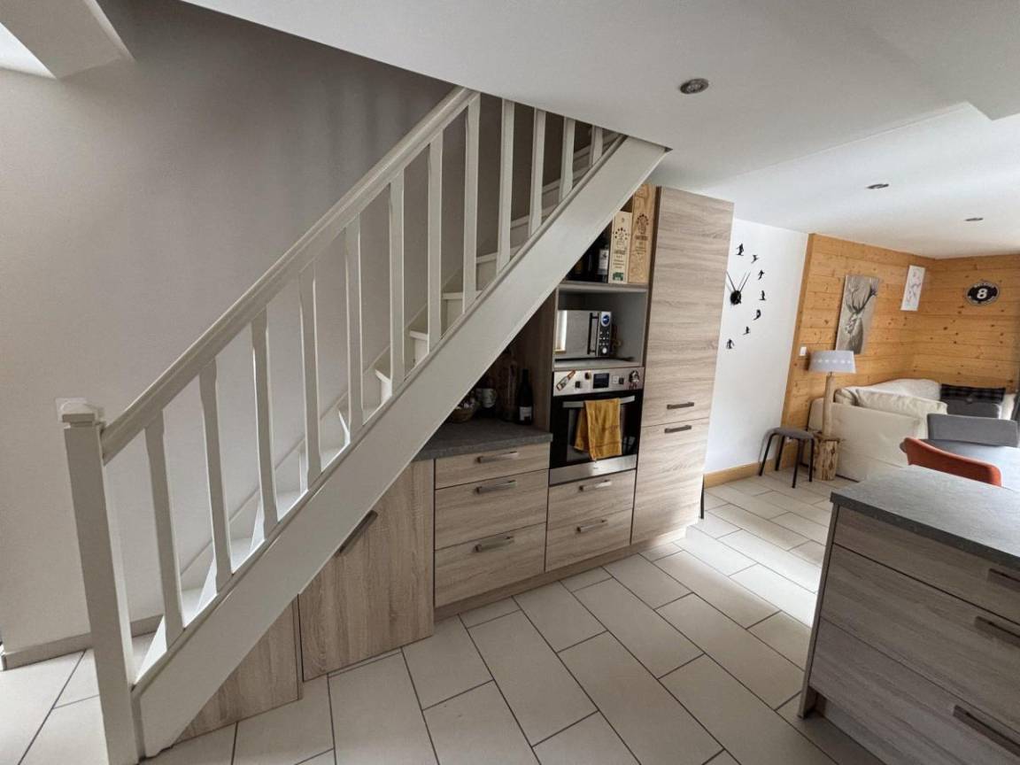 Fläche von ungefähr 70 m². 2te Etage. Orientierung : Süd. Niveau 0 : Wohnzimmer. Kochnische mit Backofen, Geschirrspülmaschine, Mikrowellenherd, 4 Induktionsherdplatten, Kühl-Gefrier-Kombination. WC. Balkon. Waschmaschine. Niveau 1 : Schlafzimmer mit Doppelbett (140*190). Schlafzimmer mit Doppelbett (160*200). Waschräume mit Haartrockner, WC. Niveau 2 : mit Leiter, Doppelbett (140*190), Einzelbett (90*190).