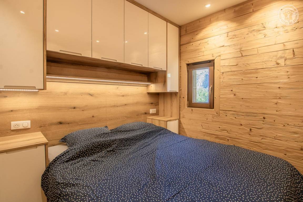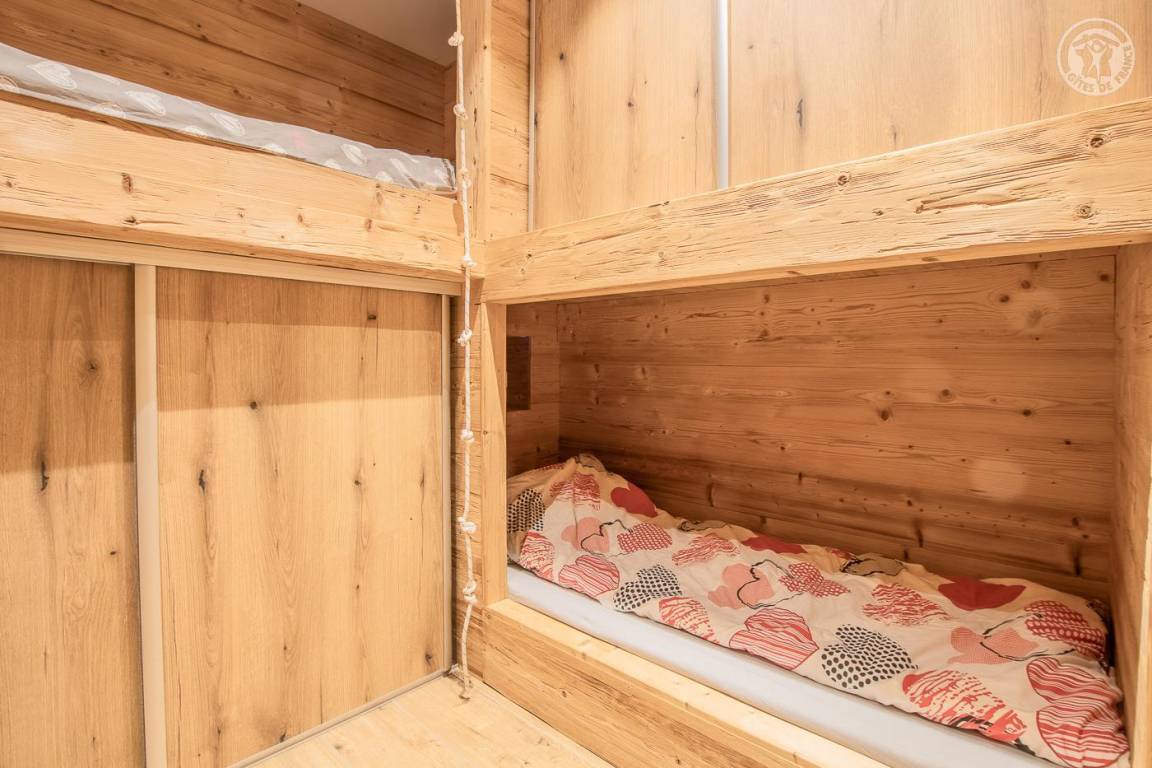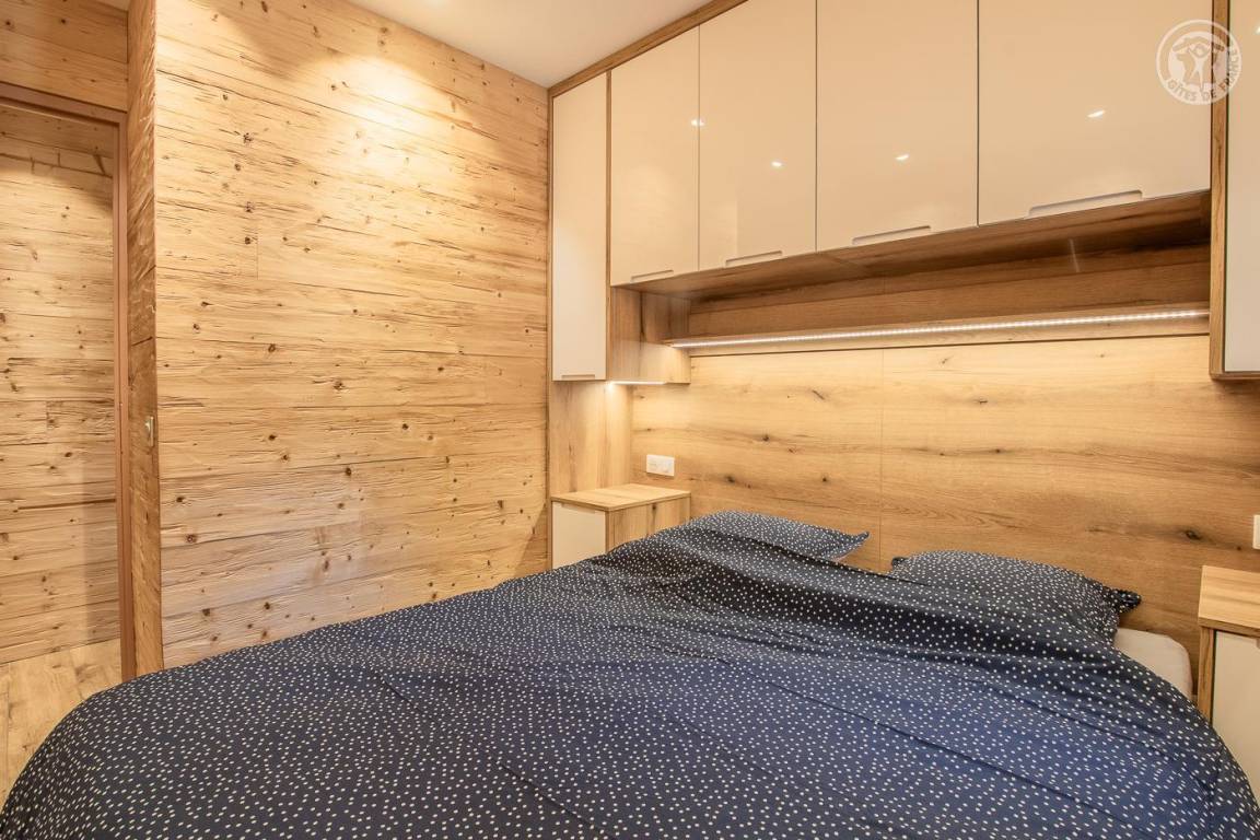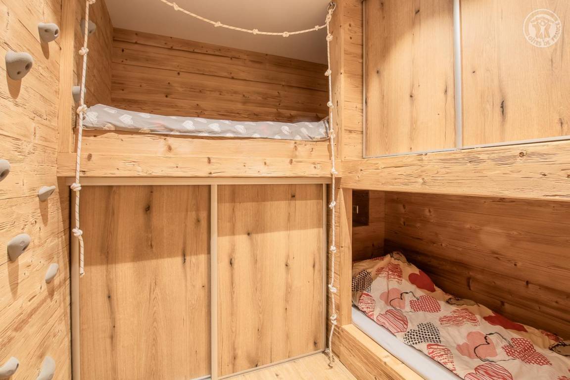 Wohnung im 1. Stock der Residenz (Zugang über eine Metalltreppe im Freien) mit Eingang, 1 Schlafzimmer (1 Doppelbett 160x200 cm), 1 Schlafzimmer in einer Kabine ohne Öffnung nach außen (2 Etagenbetten in geschlossenen Betten - 2 Einzelbetten 90x200 cm), ein Badezimmer (italienische Dusche, Badewanne, 2 Waschbecken), separates WC. Balkon. Schuhtrockner im Skischrank. Privater Parkplatz im Keller.